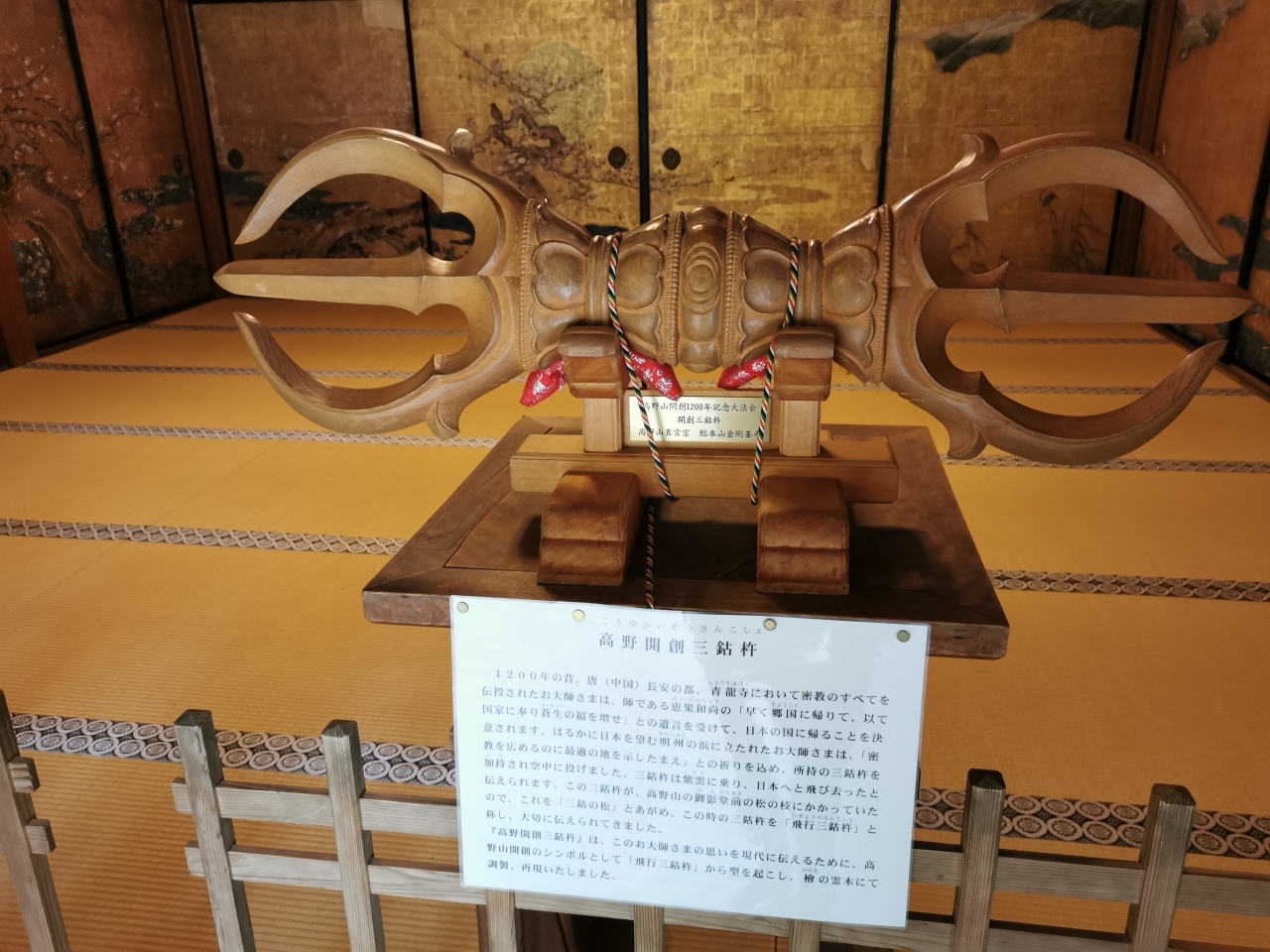 そのほか平安時代・中期に編纂の「金剛峯寺建立修行縁起」によると「空海」上人が2年間におよぶ唐での留学を終えて唐・明州の浜から帰国の途につく折、”伽藍建立の地を示し給え”と念じて持っていた三鈷(密教の修法で用いる仏具)を投げると現在の「壇上伽藍」壇上の地に落ちたとされ、帰国した「空海」上人が国内で修禅の根本道場とする場所を求めて「高野山」東側となる現在の和歌山県と奈良県の県境に位置する大和国・宇智郡をたずねた際に黒と白の二匹の犬を連れていた猟師(狩場明神)と出会いその犬たちに導かれ険しい山中に入ると、次に古くからその山の主とされる「丹生都比売大神」と出会い「空海」上人に協力する旨が伝えられ、さらに奥に進むと忽然と幽邃な大地が出現し唐から帰国する直前に投げたとされる三鈷が木に架かっているのを発見しこの地に開山することを決意したと伝えられています。