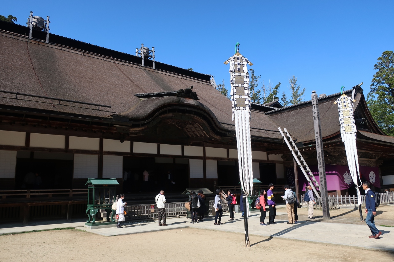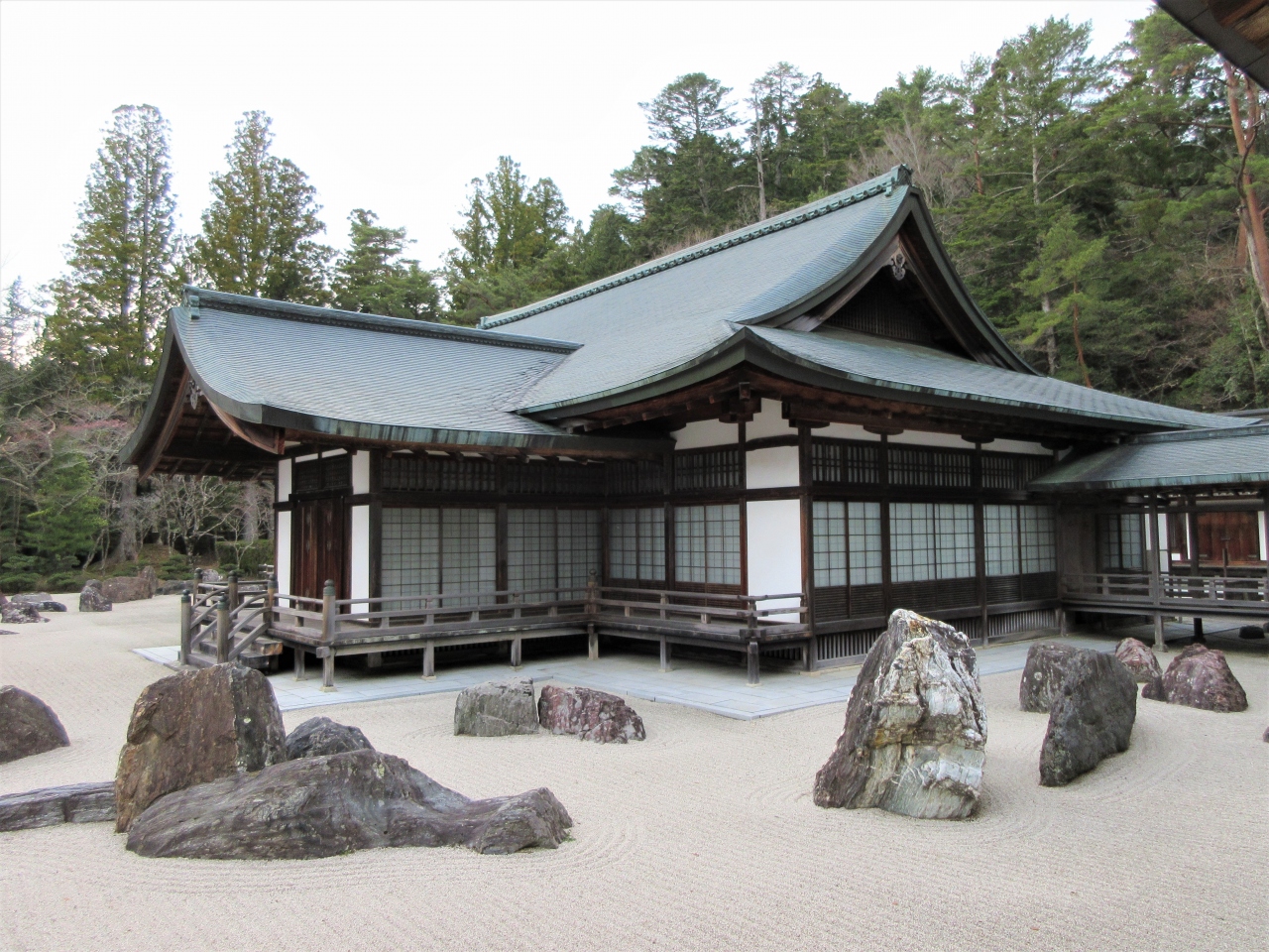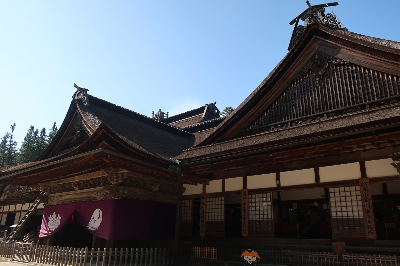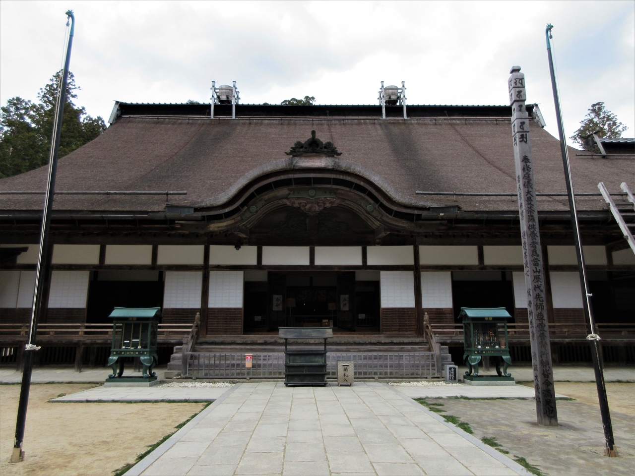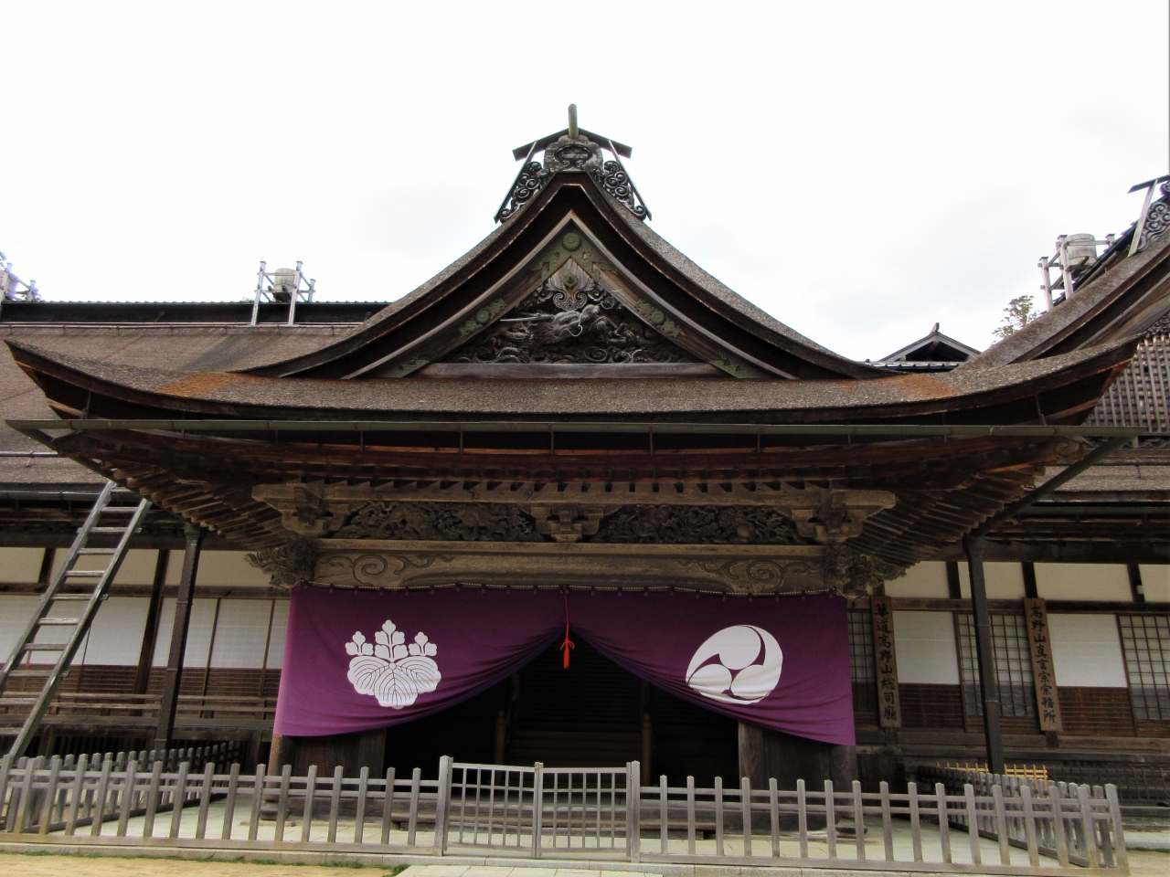 高野山真言宗の総本山。壮大な玄関をもつ建物は文久3年(1863)の再建。主殿は東西三十間、南北三十五間の大建築で、大広間には狩野探幽の襖絵「松に群鶴」が、豊臣秀次自刃したという柳の間には狩野探斎による「雪柳白鷲」が描かれている。