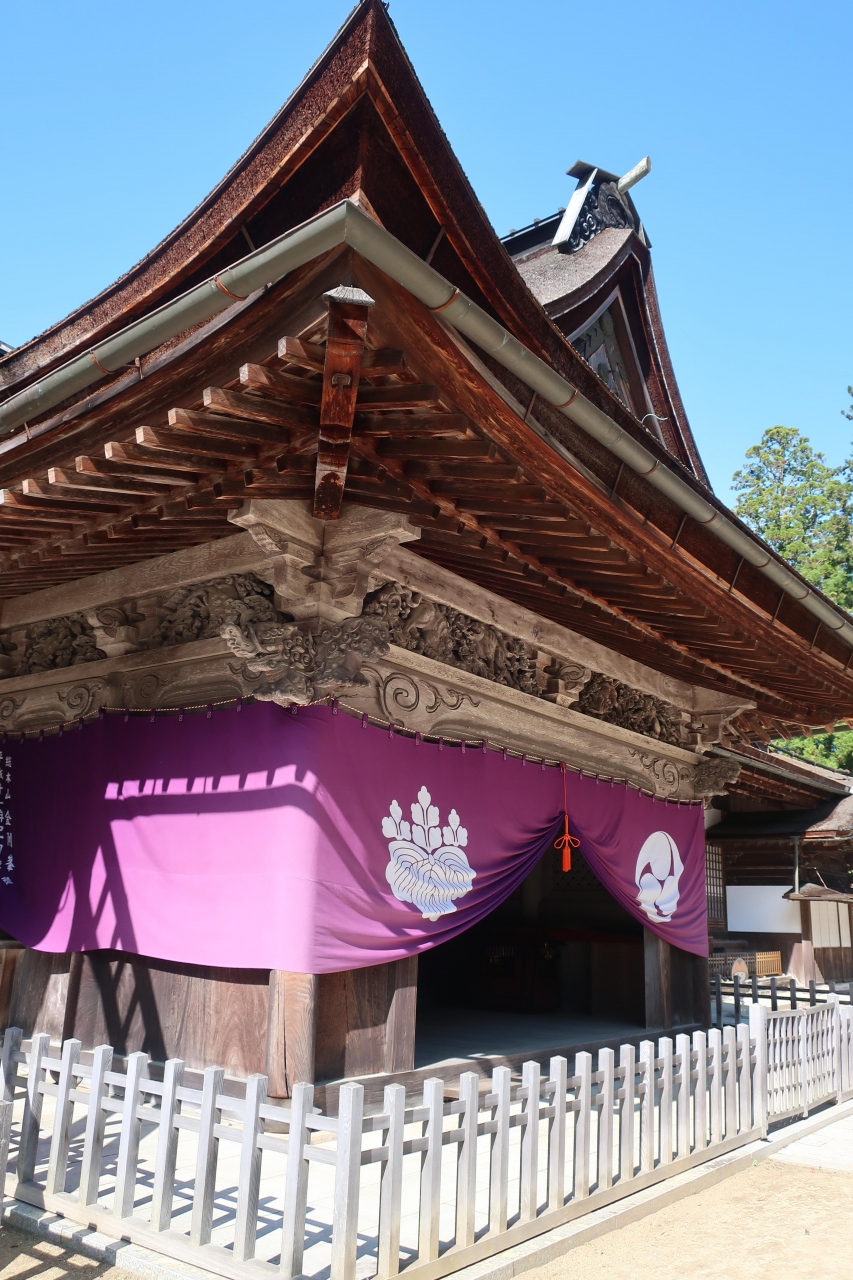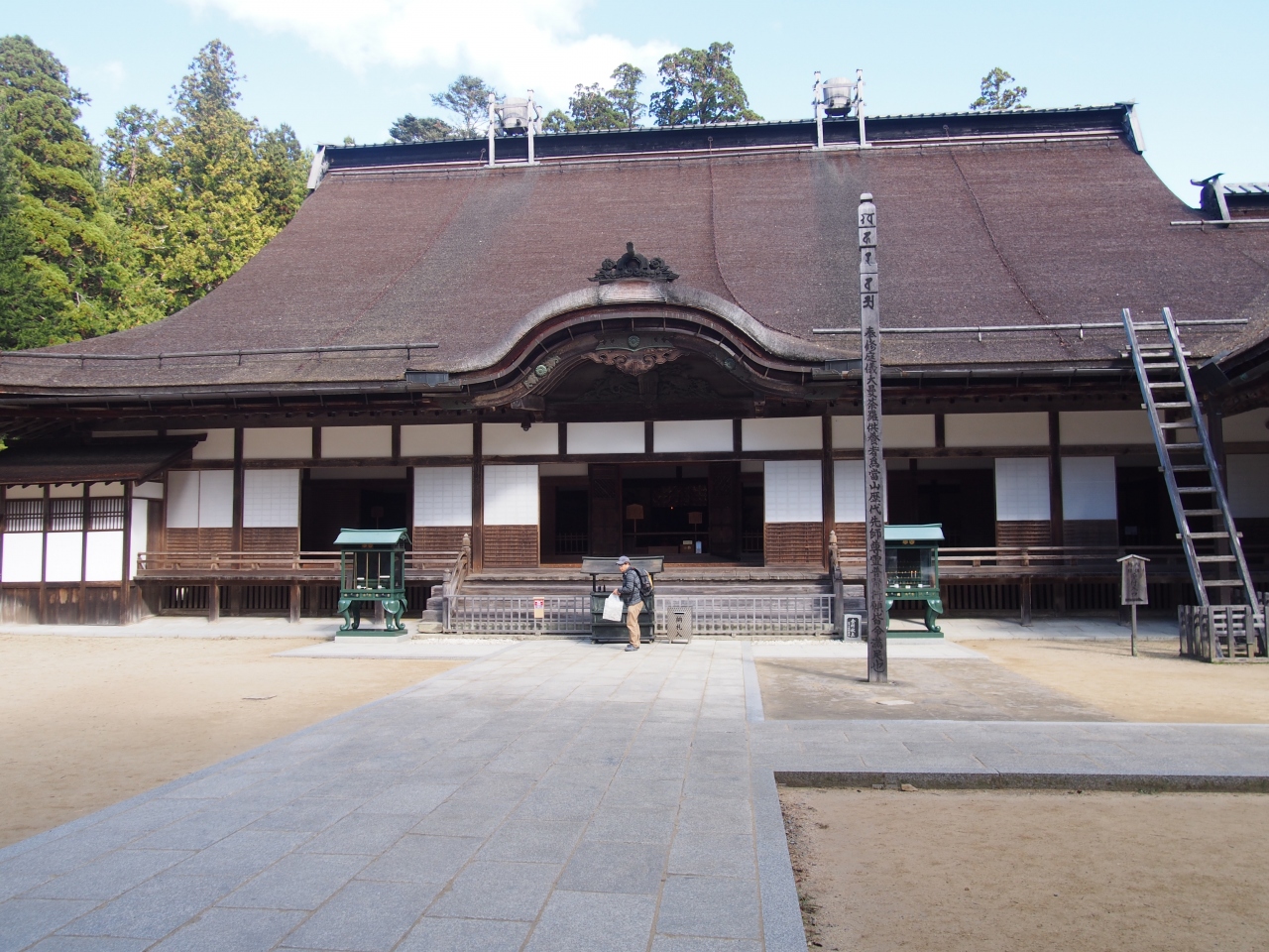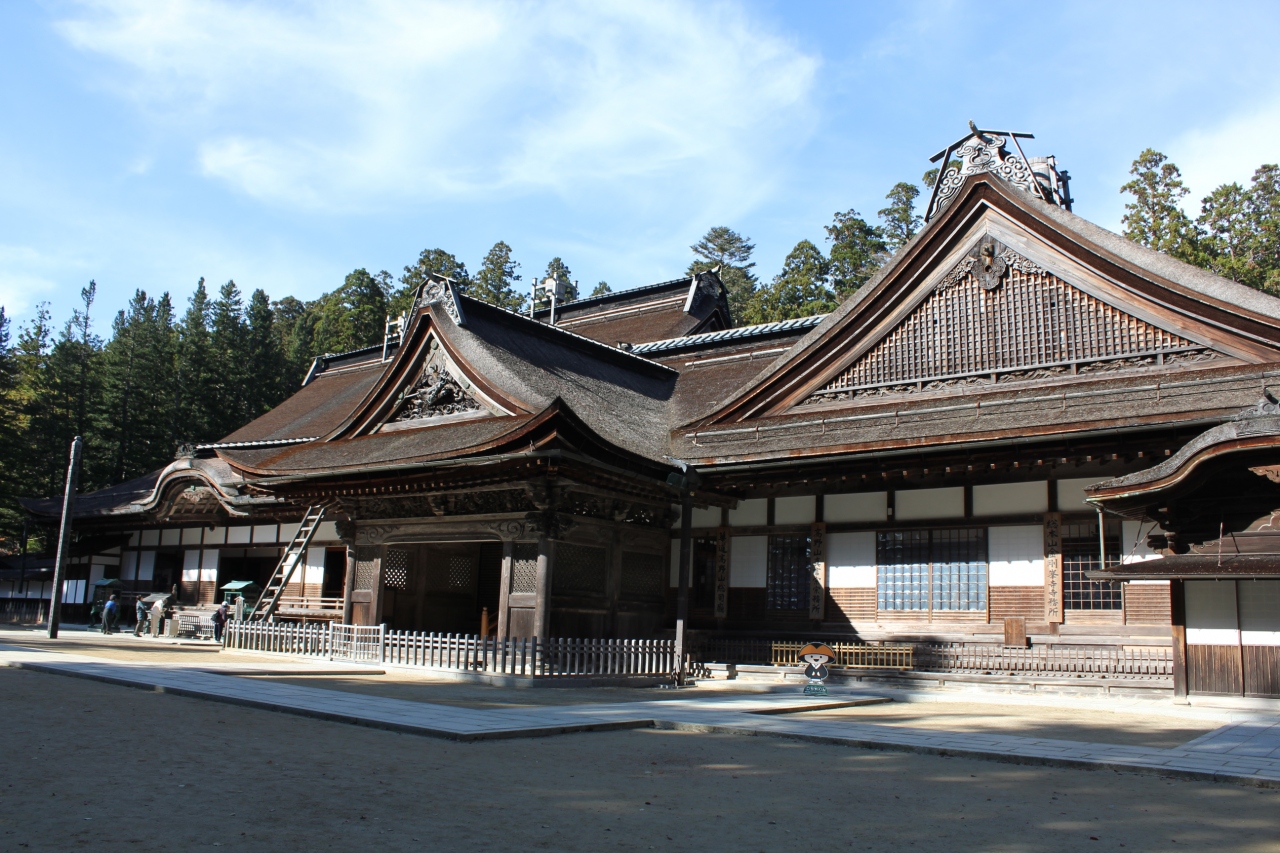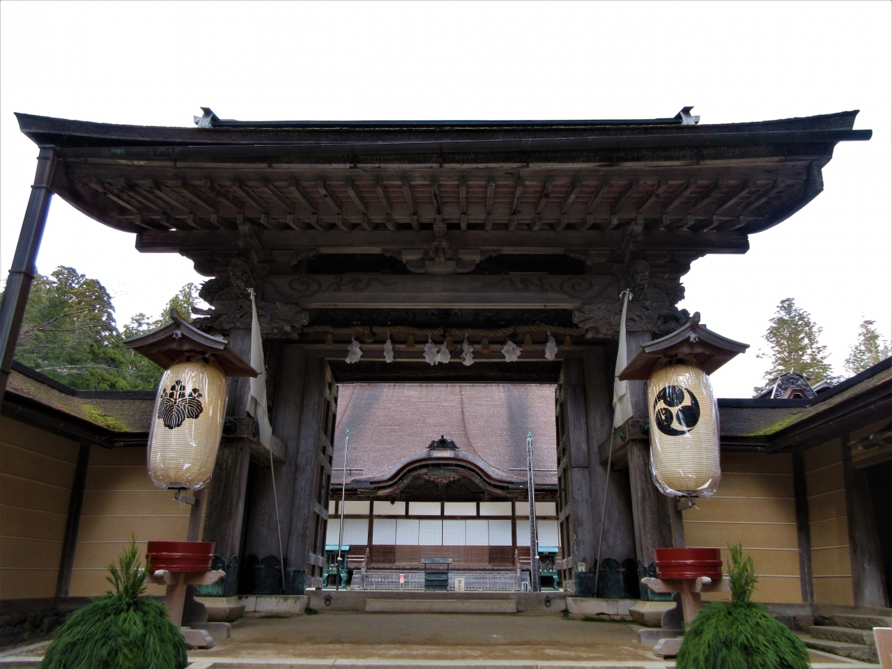 高野山真言宗の総本山。壮大な玄関をもつ建物は文久3年(1863)の再建。主殿は東西三十間、南北三十五間の大建築で、大広間には狩野探幽の襖絵「松に群鶴」が、豊臣秀次自刃したという柳の間には狩野探斎による「雪柳白鷲」が描かれている。
