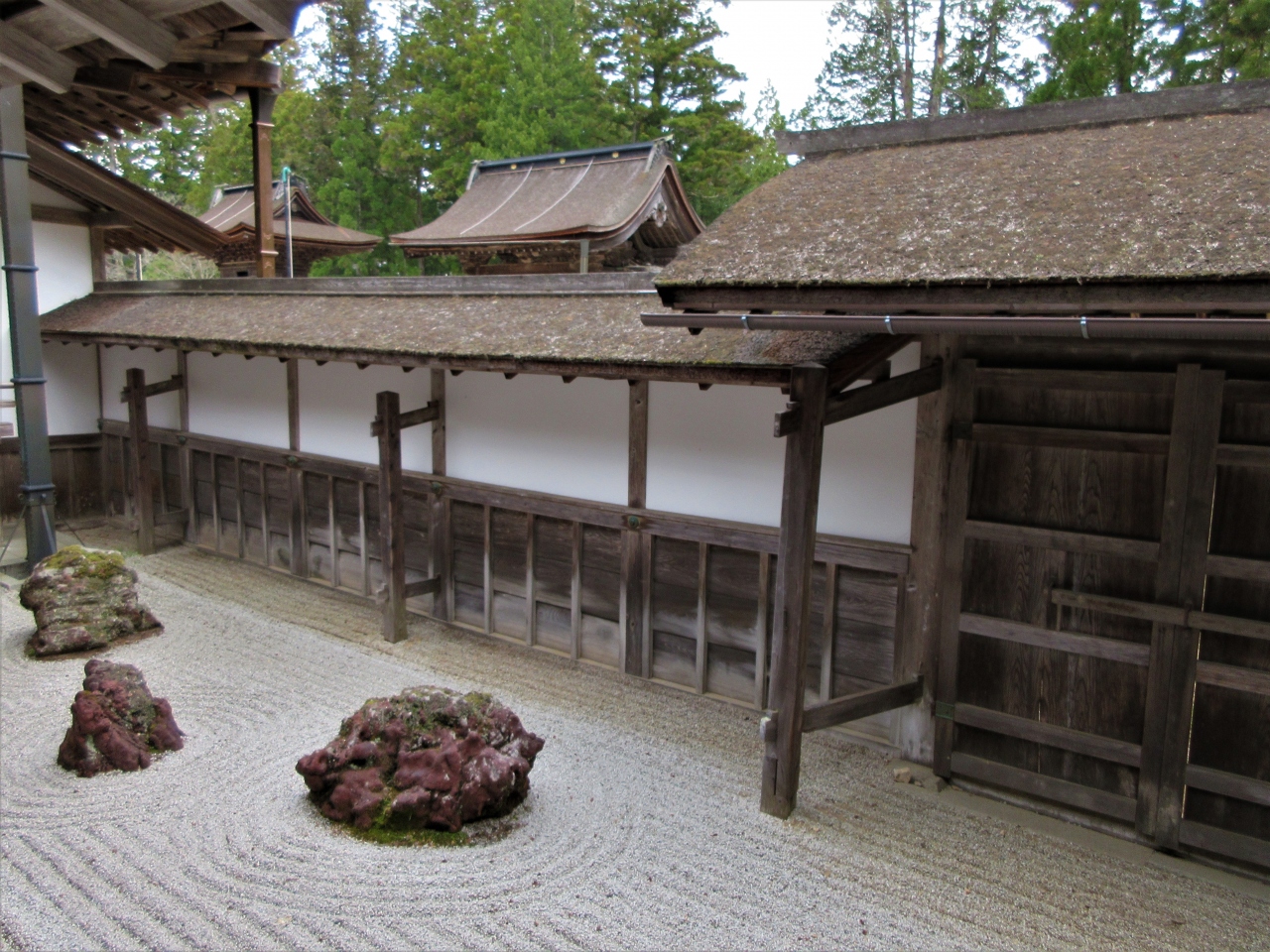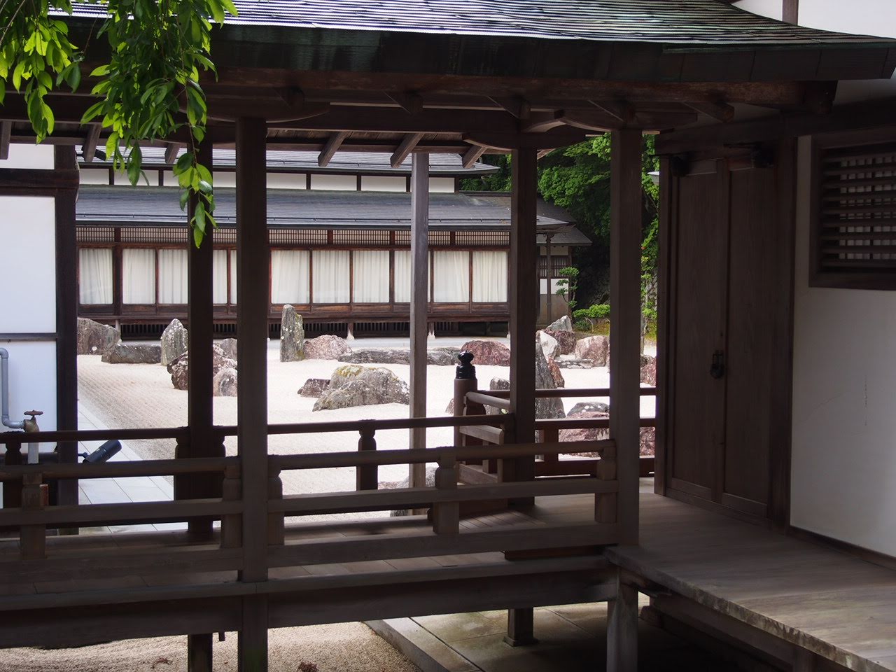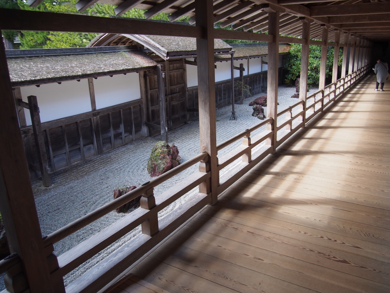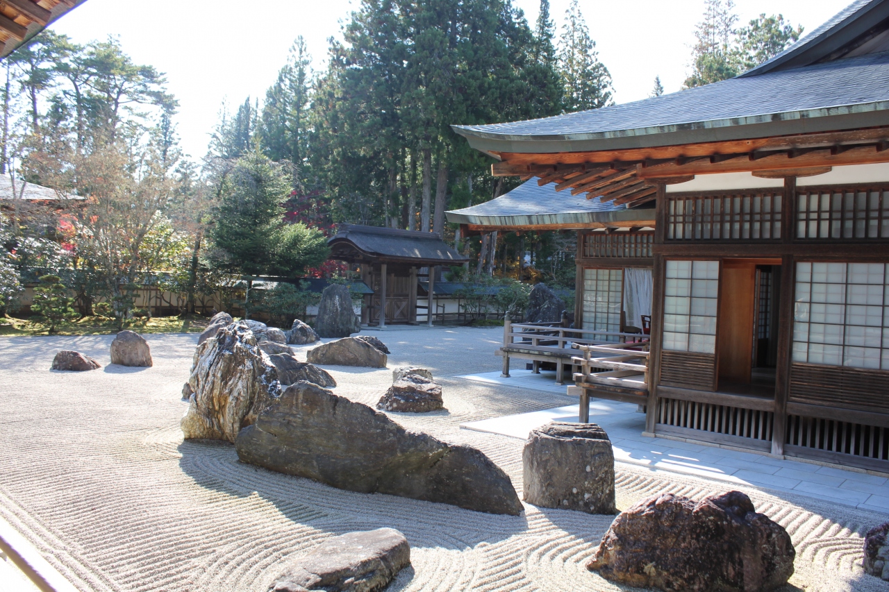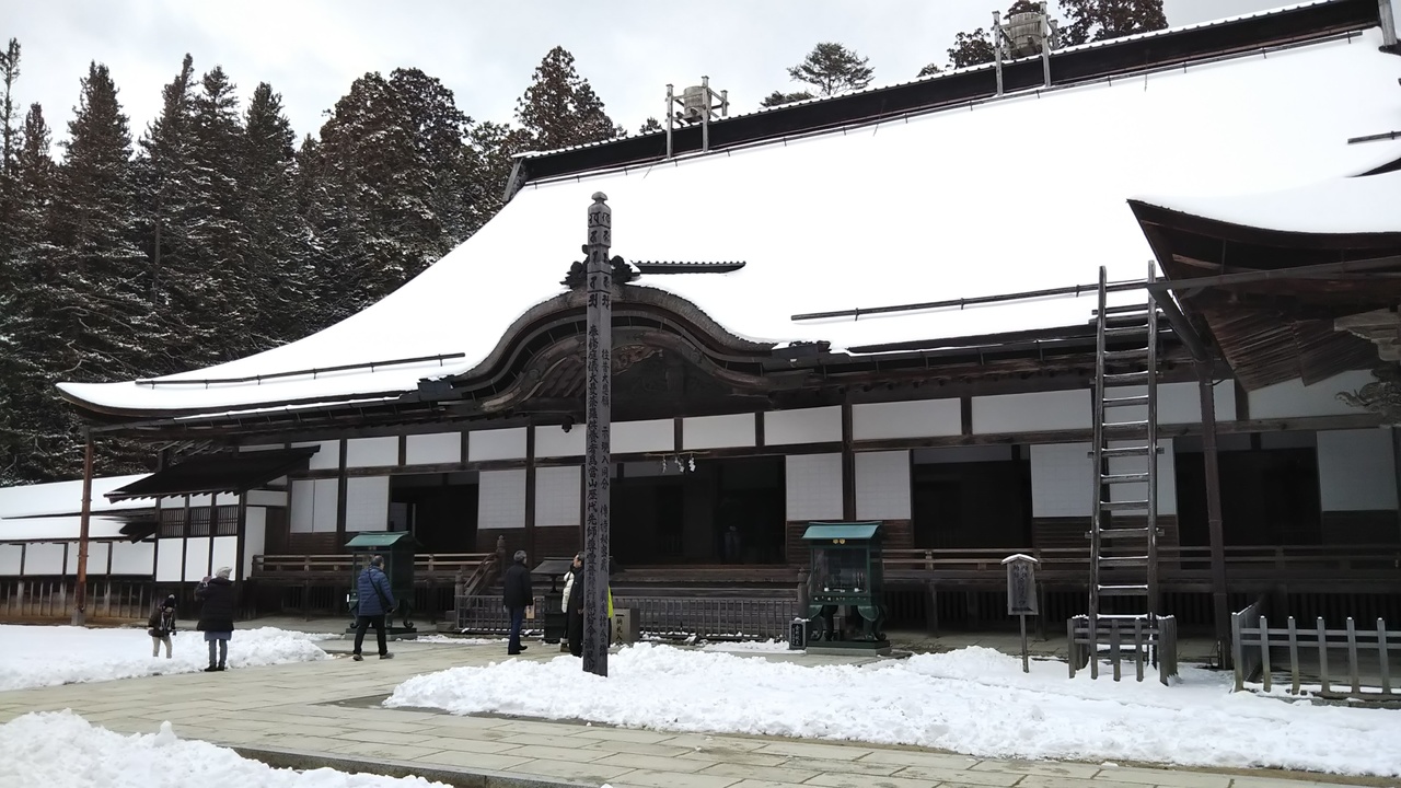 高野山真言宗の総本山。壮大な玄関をもつ建物は文久3年(1863)の再建。主殿は東西三十間、南北三十五間の大建築で、大広間には狩野探幽の襖絵「松に群鶴」が、豊臣秀次自刃したという柳の間には狩野探斎による「雪柳白鷲」が描かれている。