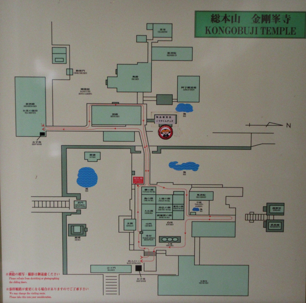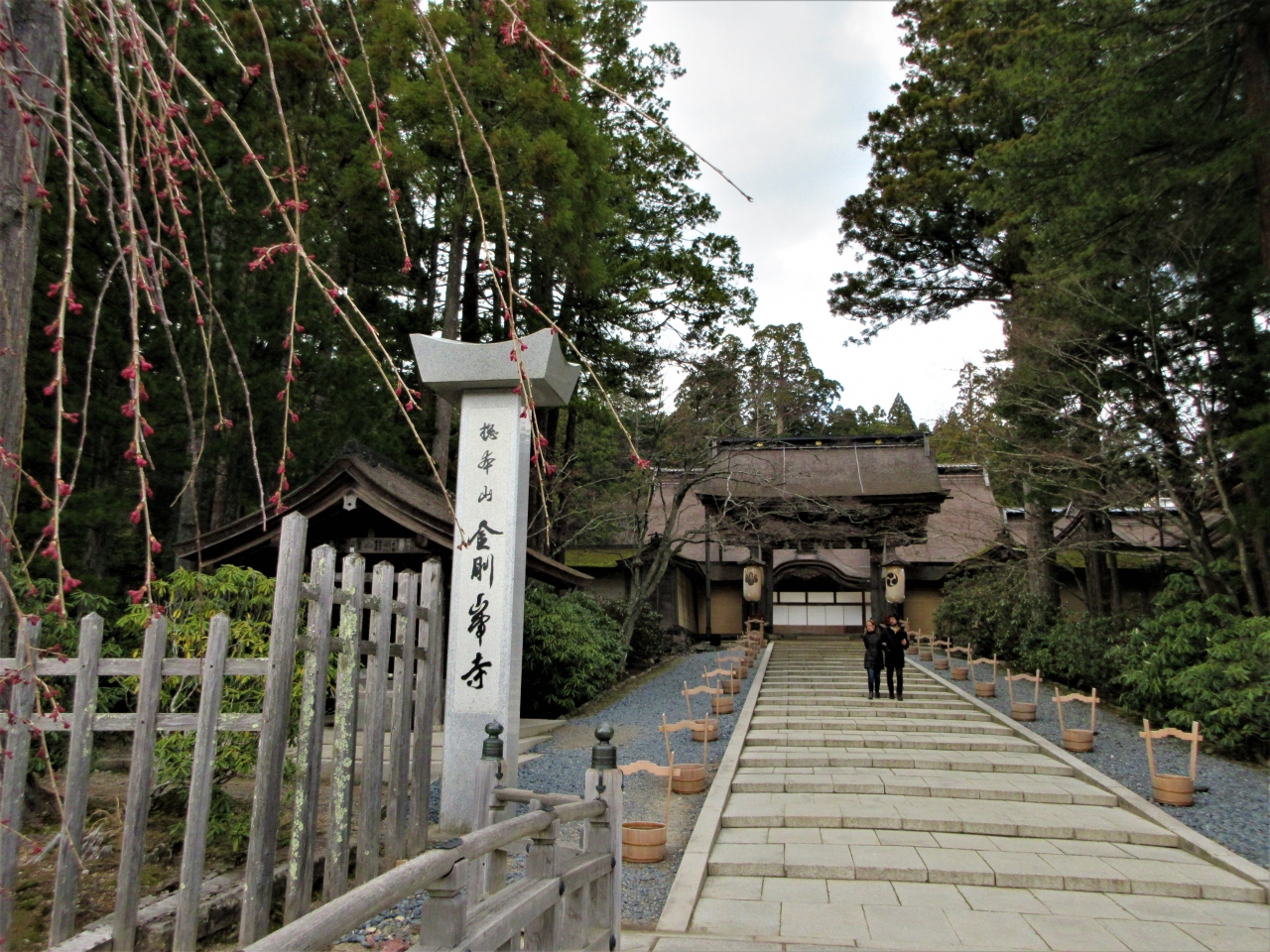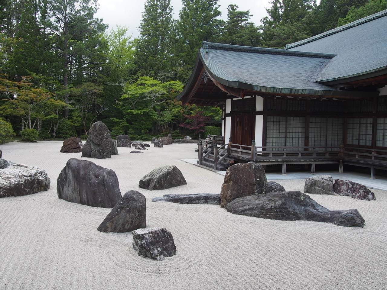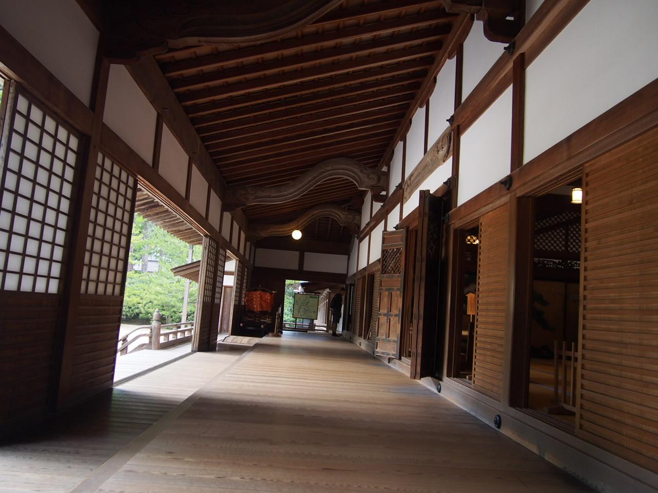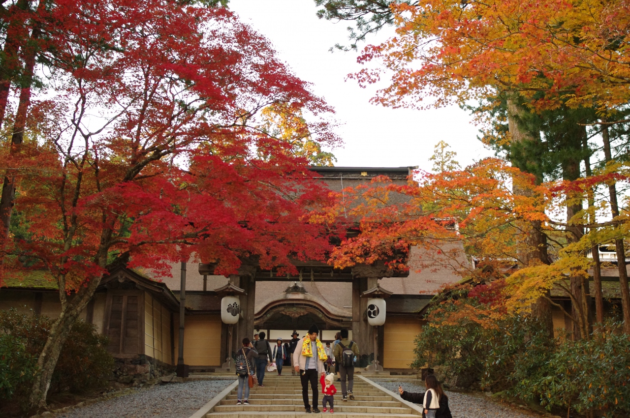 高野山真言宗の総本山。壮大な玄関をもつ建物は文久3年(1863)の再建。主殿は東西三十間、南北三十五間の大建築で、大広間には狩野探幽の襖絵「松に群鶴」が、豊臣秀次自刃したという柳の間には狩野探斎による「雪柳白鷲」が描かれている。