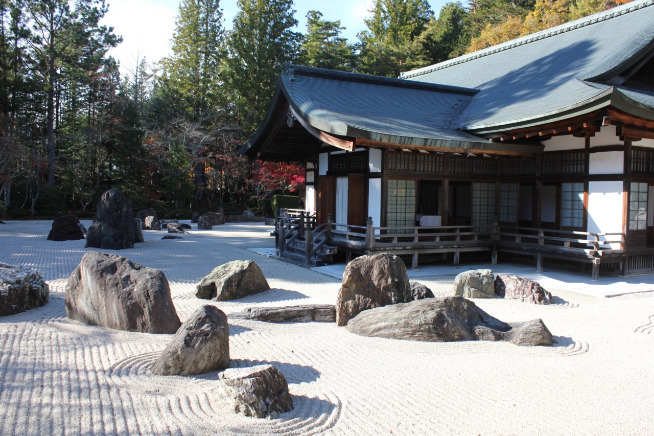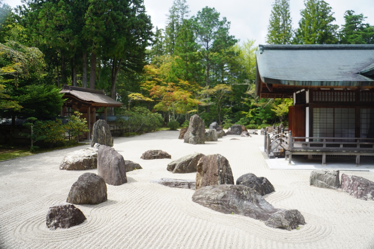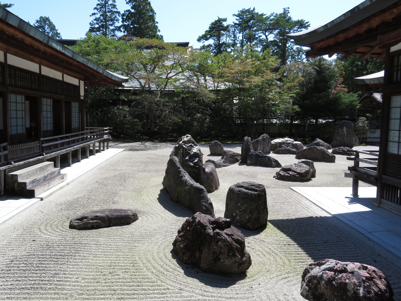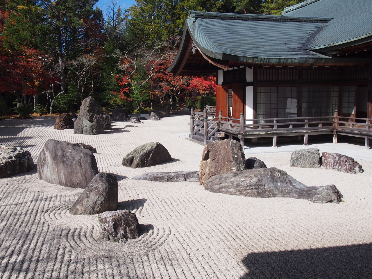 高野山真言宗の総本山。壮大な玄関をもつ建物は文久3年(1863)の再建。主殿は東西三十間、南北三十五間の大建築で、大広間には狩野探幽の襖絵「松に群鶴」が、豊臣秀次自刃したという柳の間には狩野探斎による「雪柳白鷲」が描かれている。