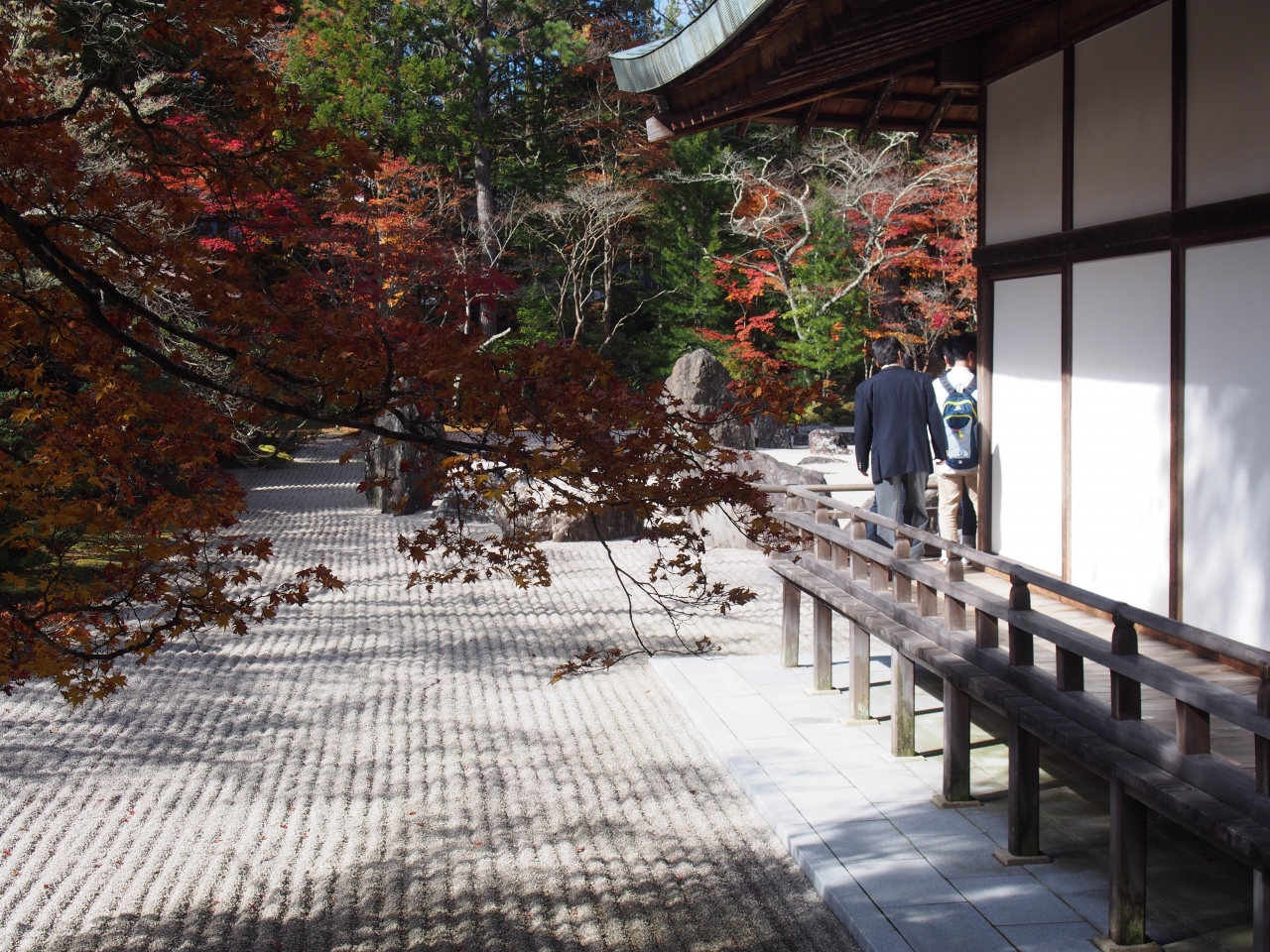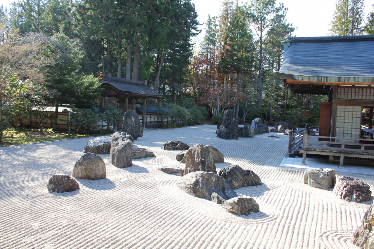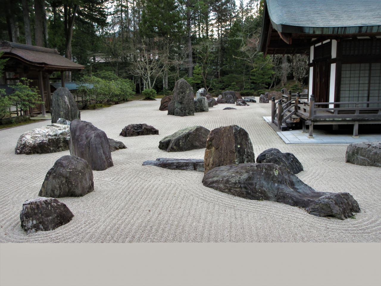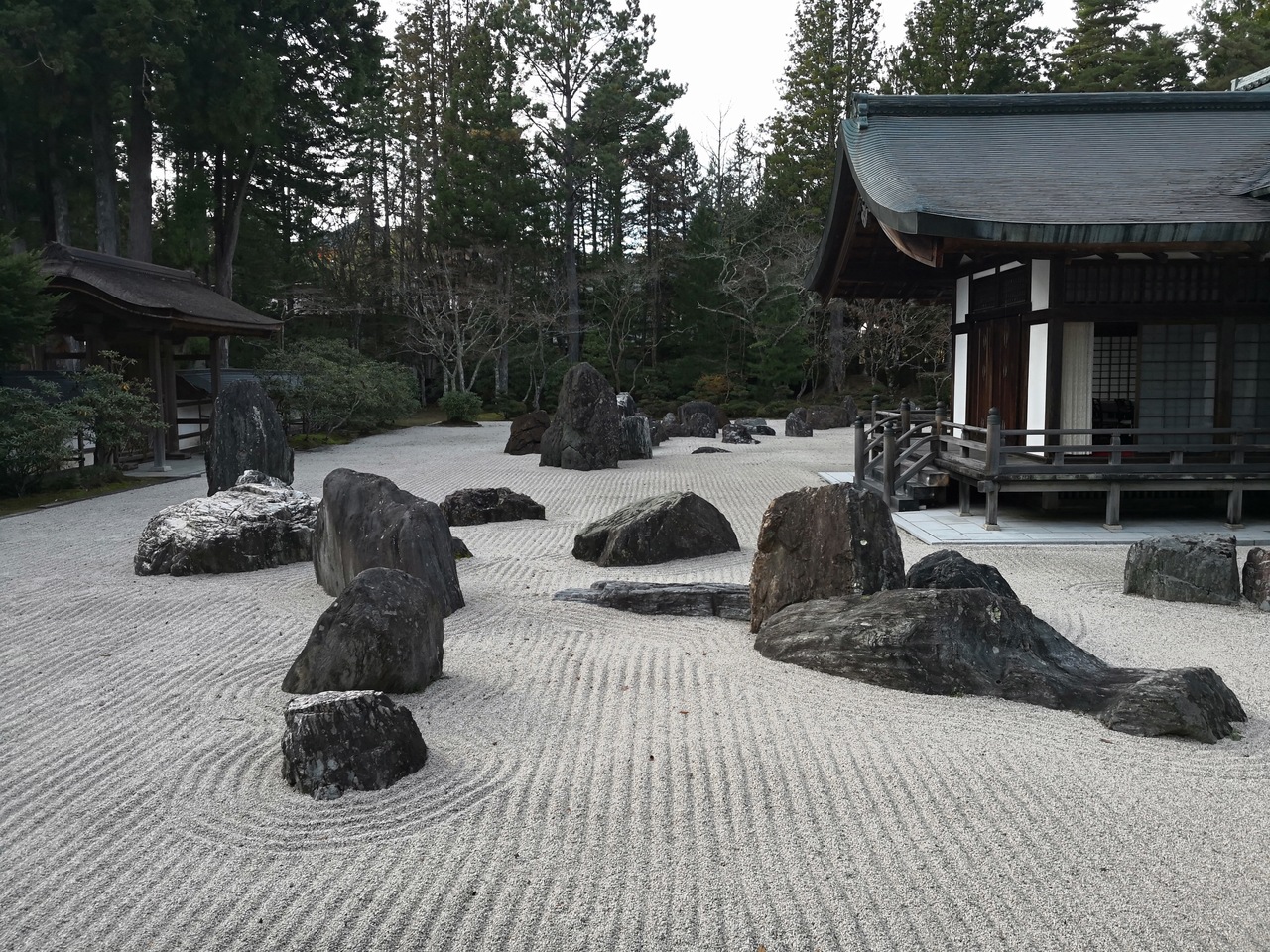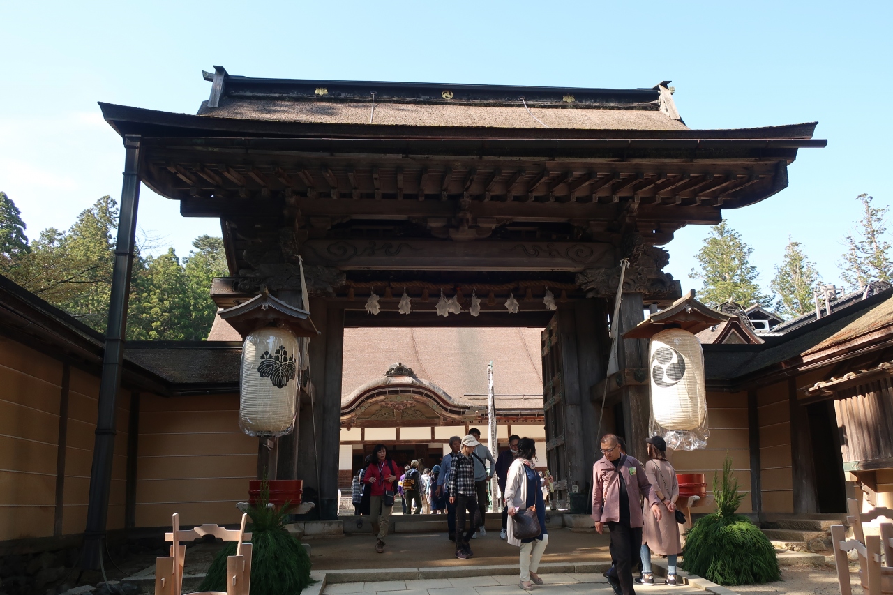 高野山真言宗の総本山。壮大な玄関をもつ建物は文久3年(1863)の再建。主殿は東西三十間、南北三十五間の大建築で、大広間には狩野探幽の襖絵「松に群鶴」が、豊臣秀次自刃したという柳の間には狩野探斎による「雪柳白鷲」が描かれている。