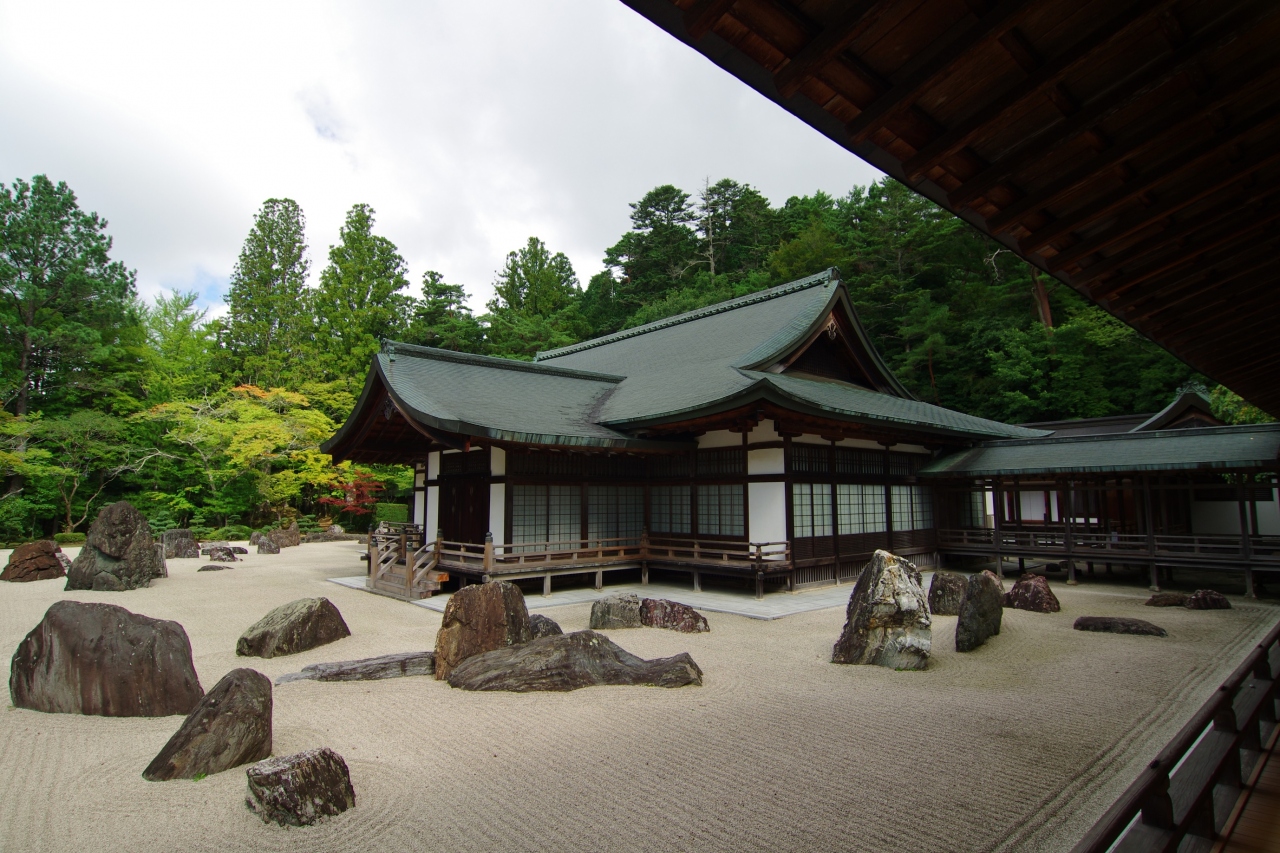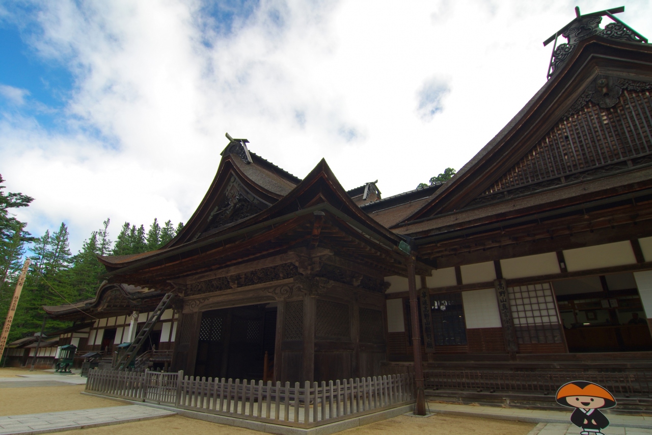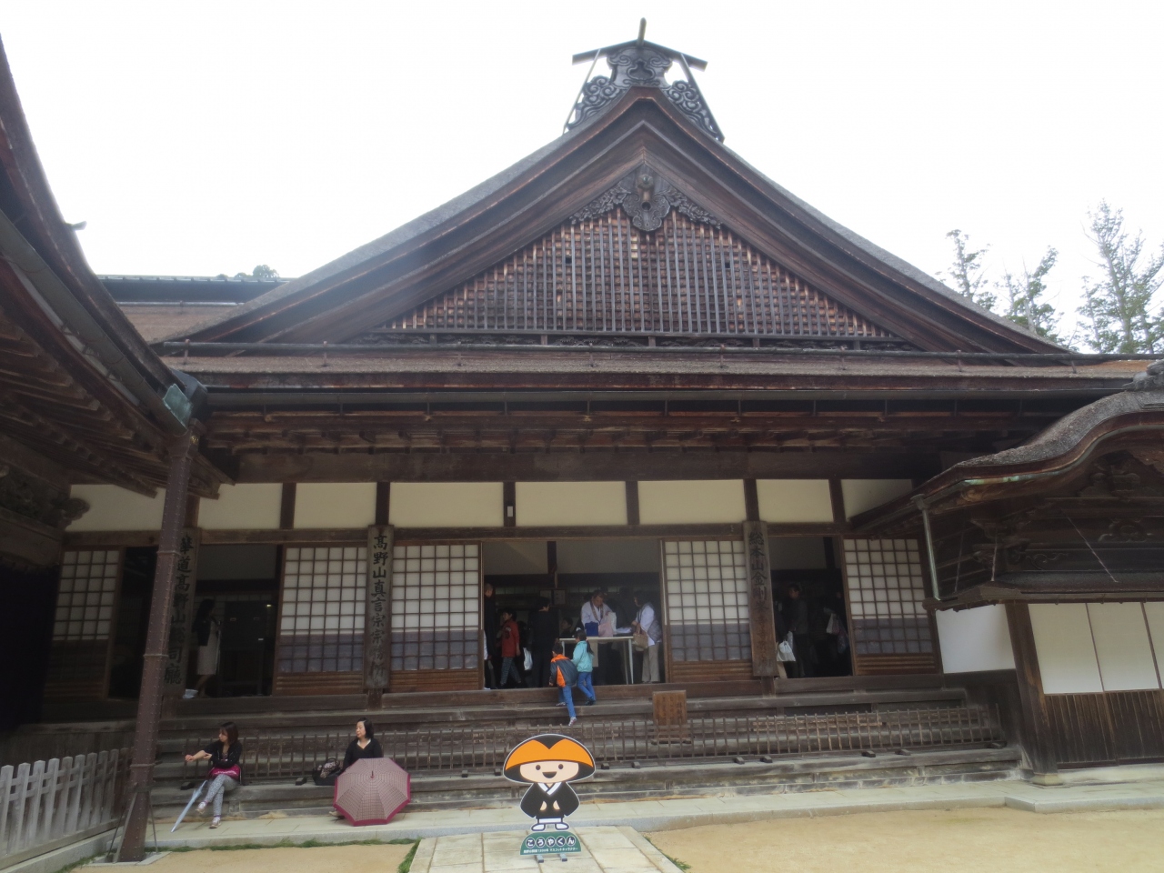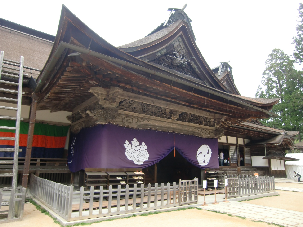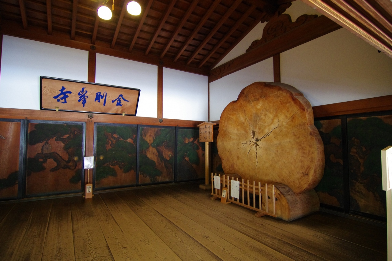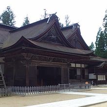 高野山真言宗の総本山。壮大な玄関をもつ建物は文久3年(1863)の再建。主殿は東西三十間、南北三十五間の大建築で、大広間には狩野探幽の襖絵「松に群鶴」が、豊臣秀次自刃したという柳の間には狩野探斎による「雪柳白鷲」が描かれている。