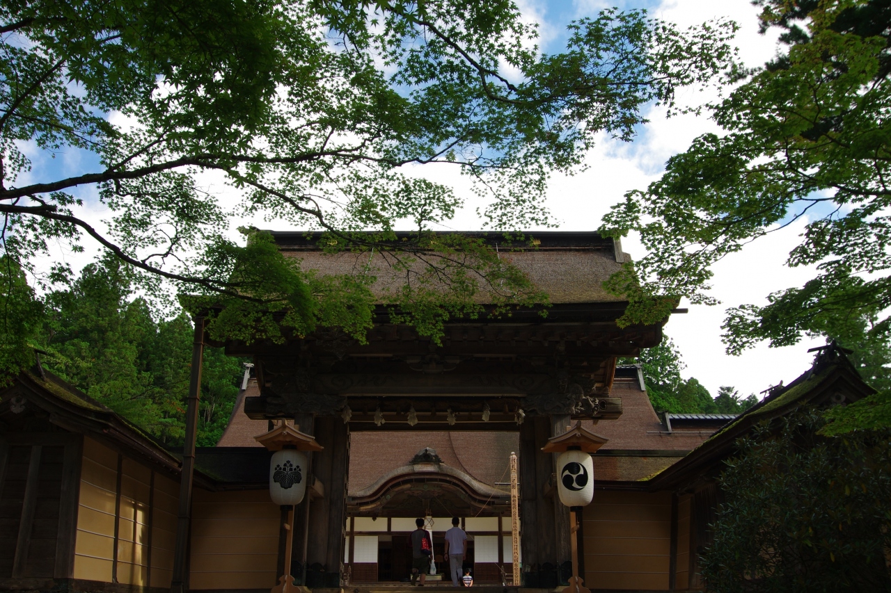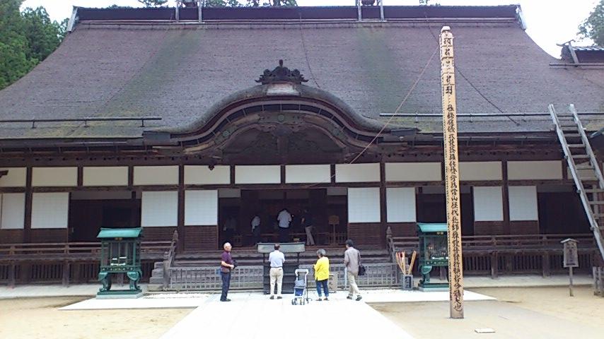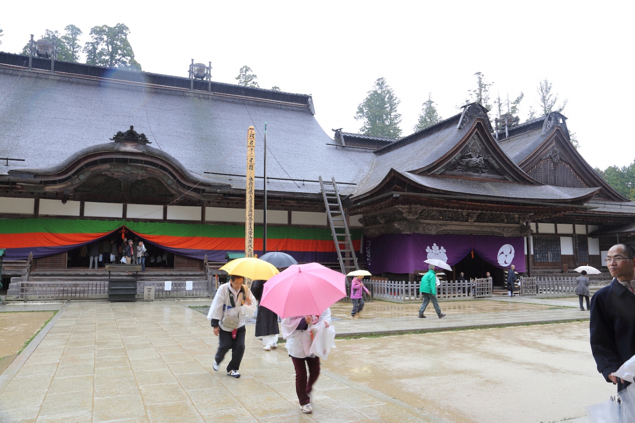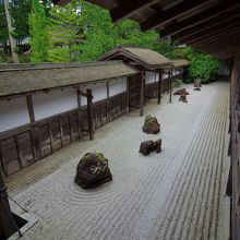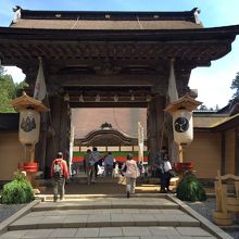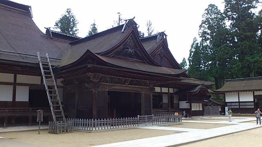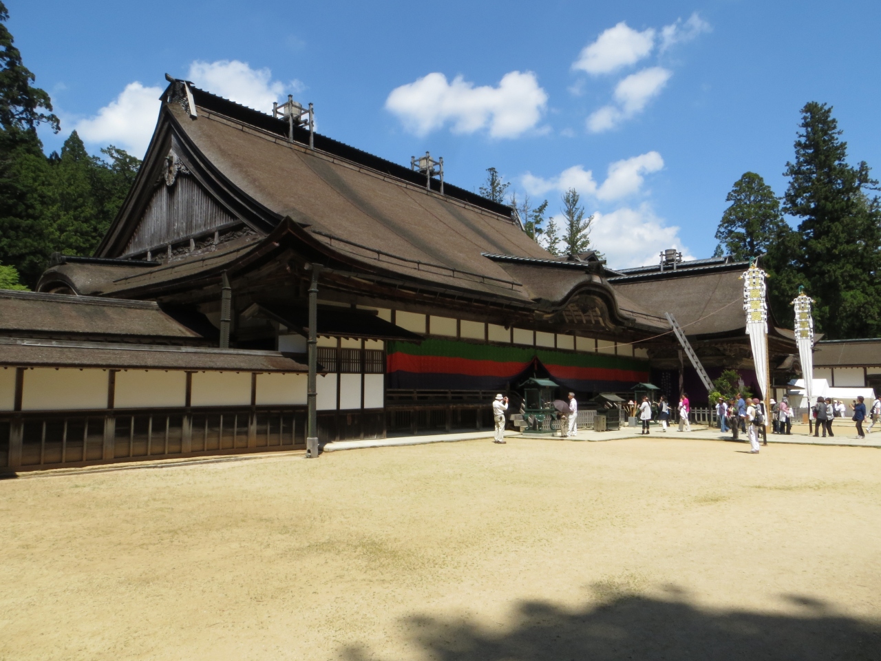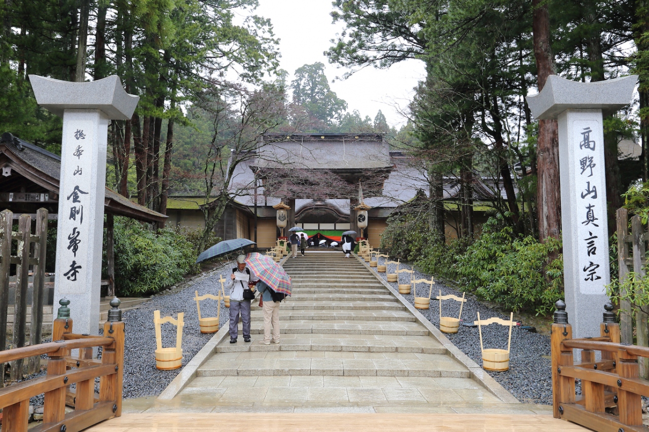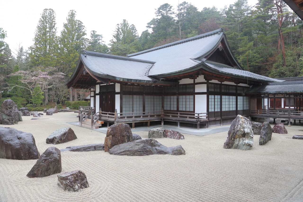 高野山真言宗の総本山。壮大な玄関をもつ建物は文久3年(1863)の再建。主殿は東西三十間、南北三十五間の大建築で、大広間には狩野探幽の襖絵「松に群鶴」が、豊臣秀次自刃したという柳の間には狩野探斎による「雪柳白鷲」が描かれている。