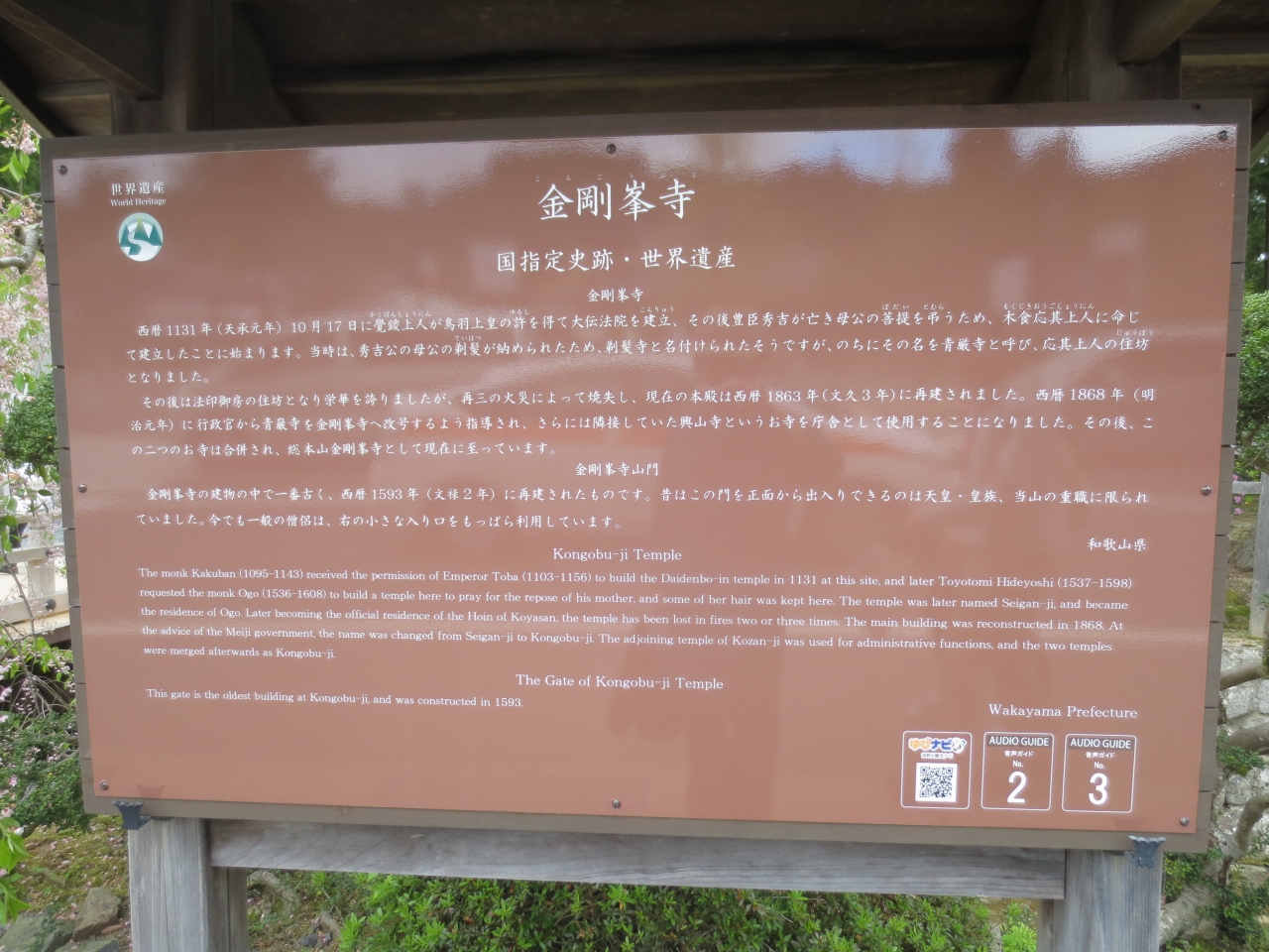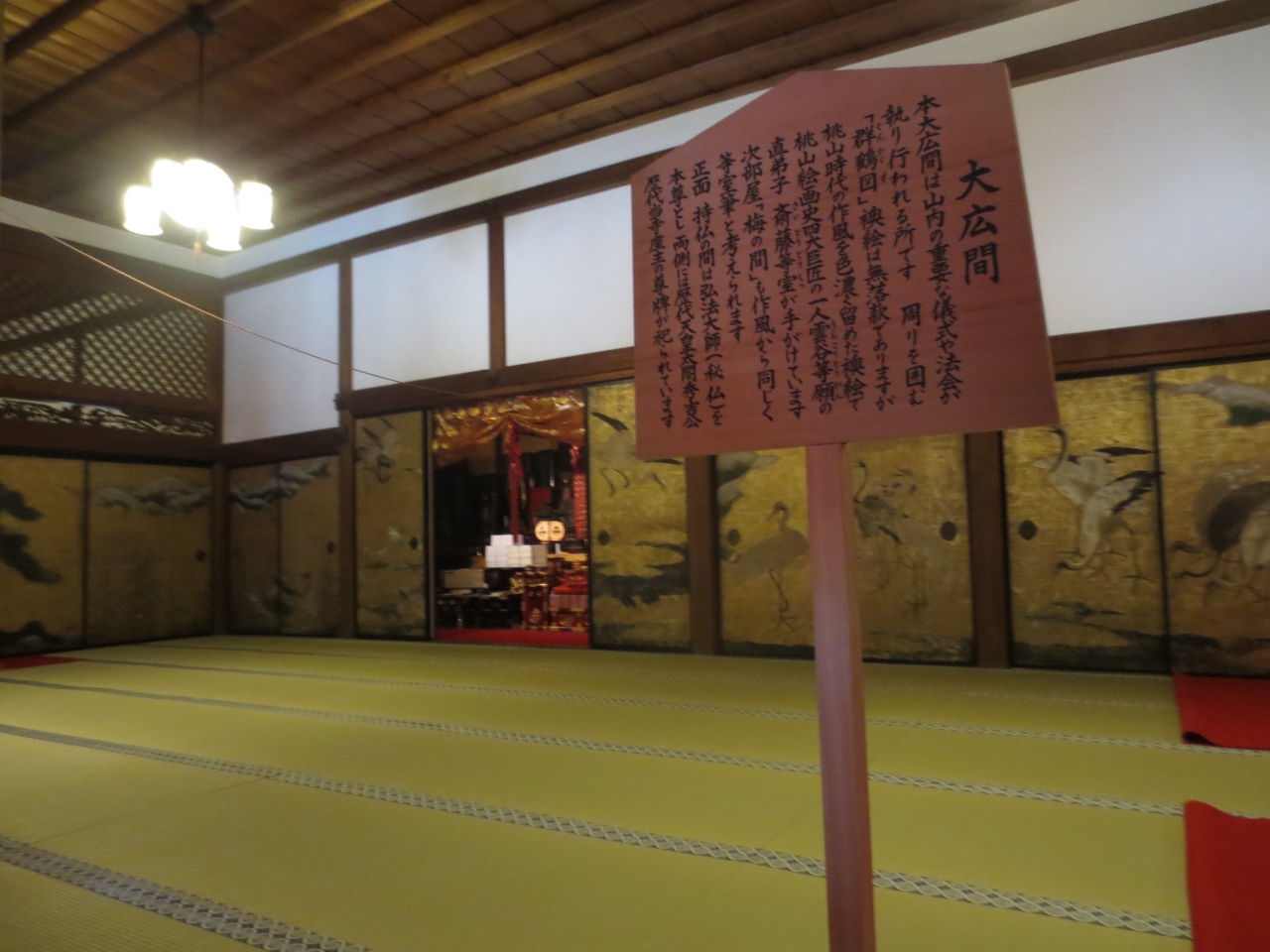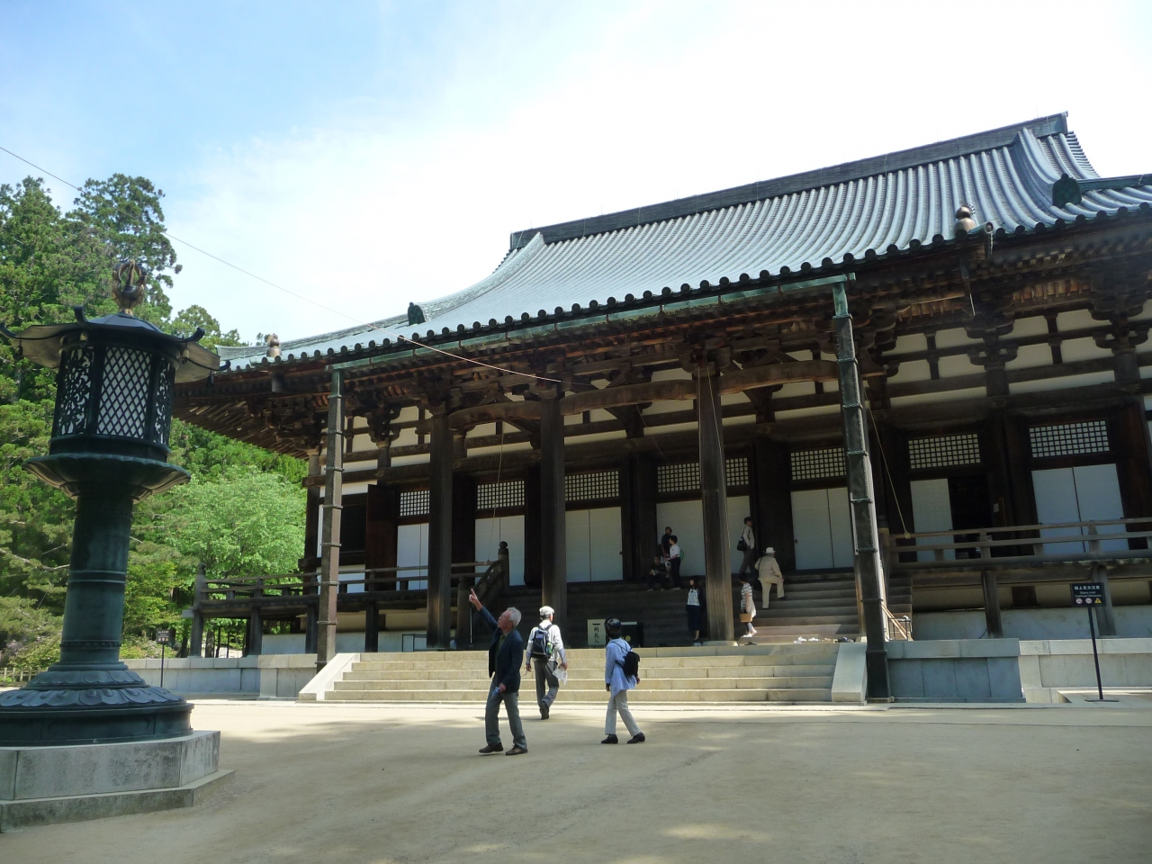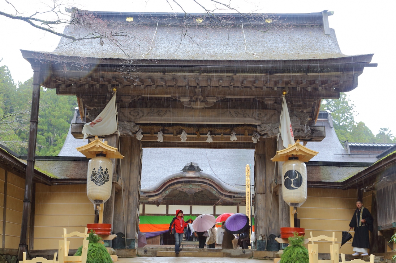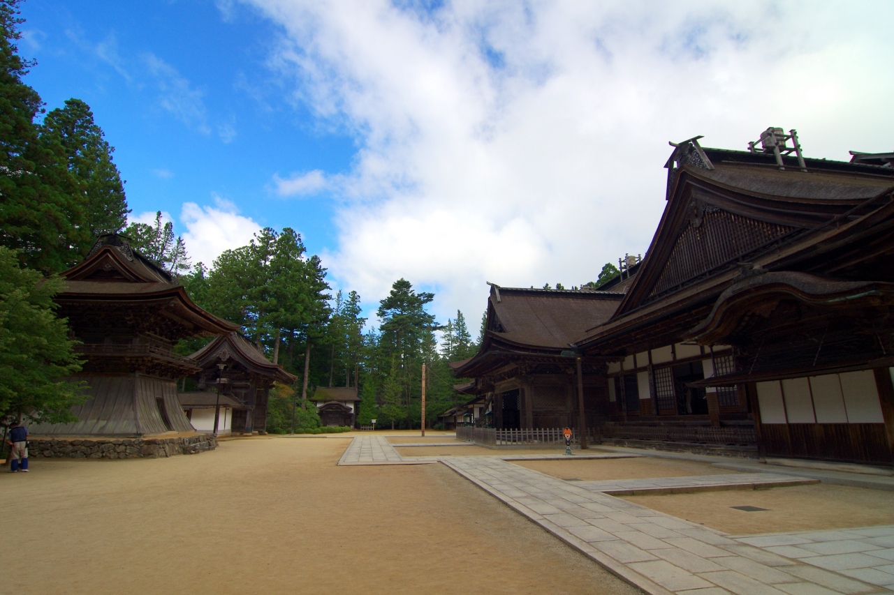 高野山真言宗の総本山。壮大な玄関をもつ建物は文久3年(1863)の再建。主殿は東西三十間、南北三十五間の大建築で、大広間には狩野探幽の襖絵「松に群鶴」が、豊臣秀次自刃したという柳の間には狩野探斎による「雪柳白鷲」が描かれている。