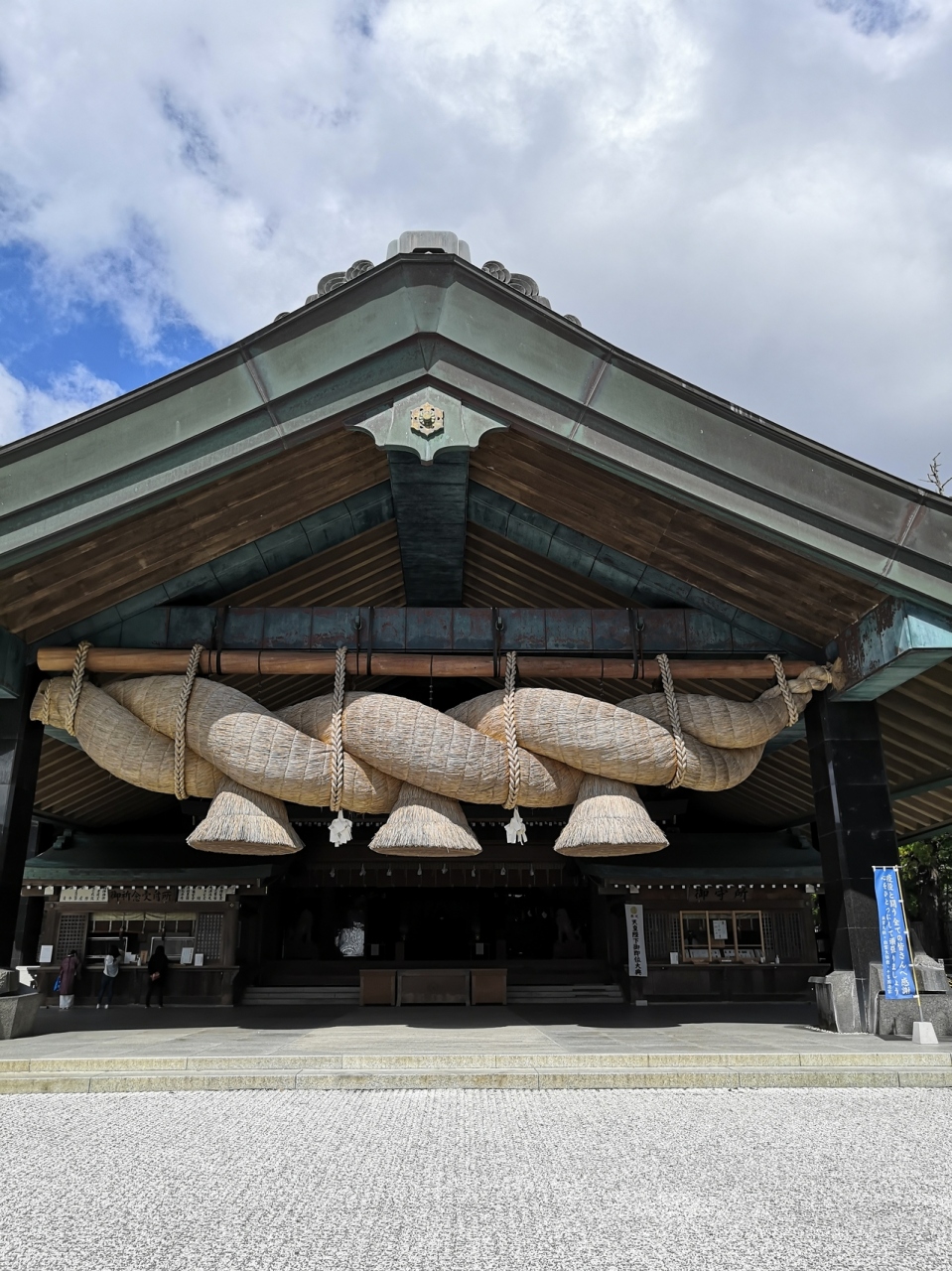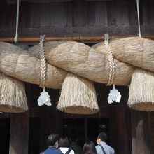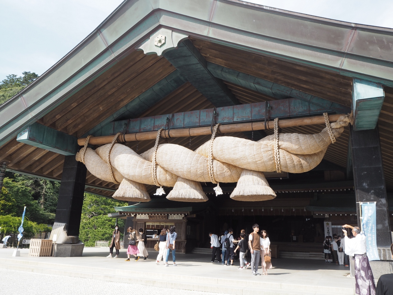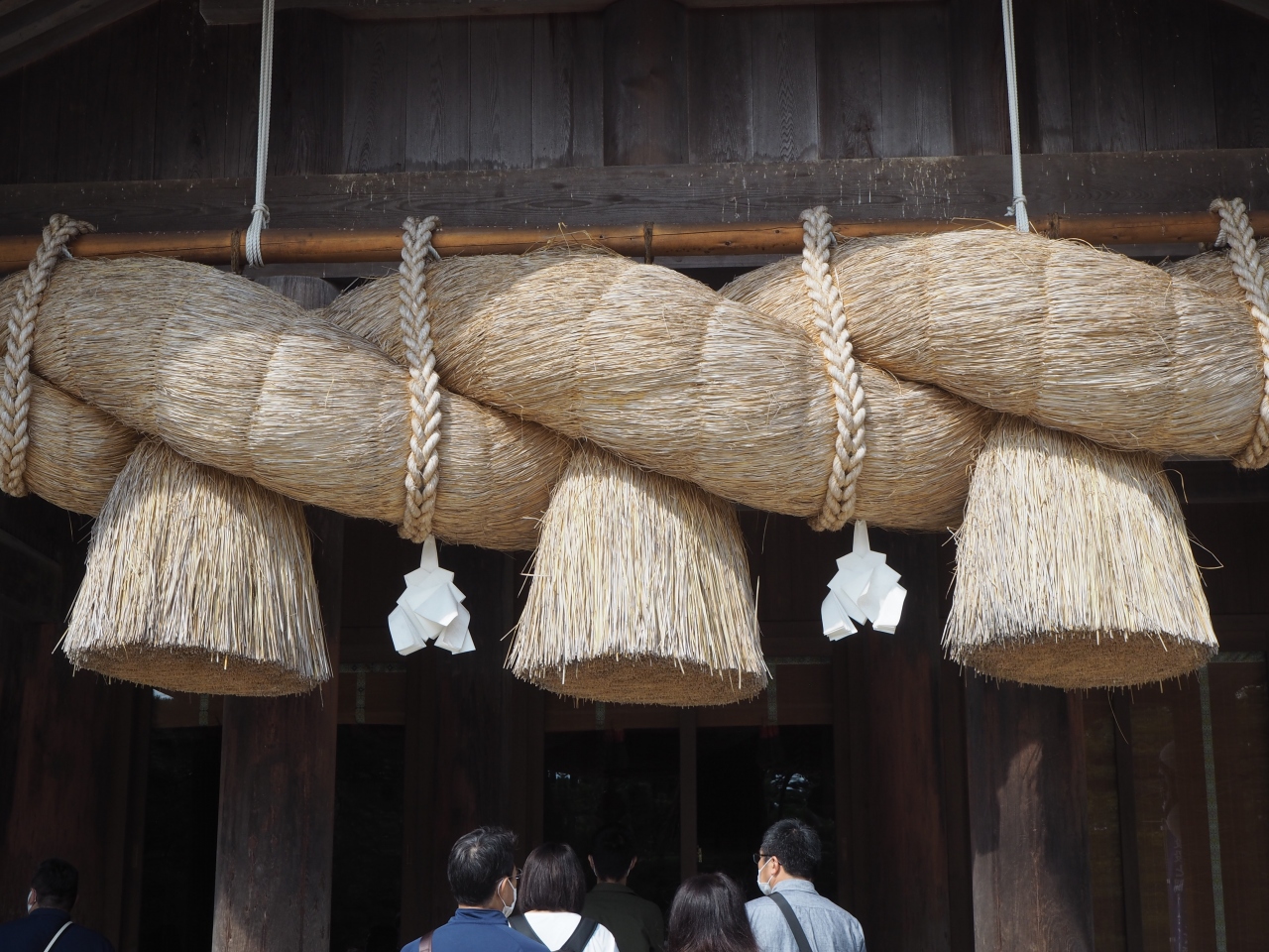 出雲大社の見どころのひとつである神楽殿のしめ縄です。大きなしめ縄が4メートルほどの高さの場所に吊り下げられています。しめ縄...  続きを読むは太さはひとのからだの2、3倍はある感じで、少し離れた場所のほうがその大きな、太さはわかります。来られた方は、皆一様に見上げたり、写真を撮っていました。驚きのものです。  閉じる