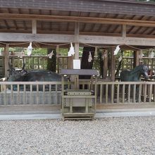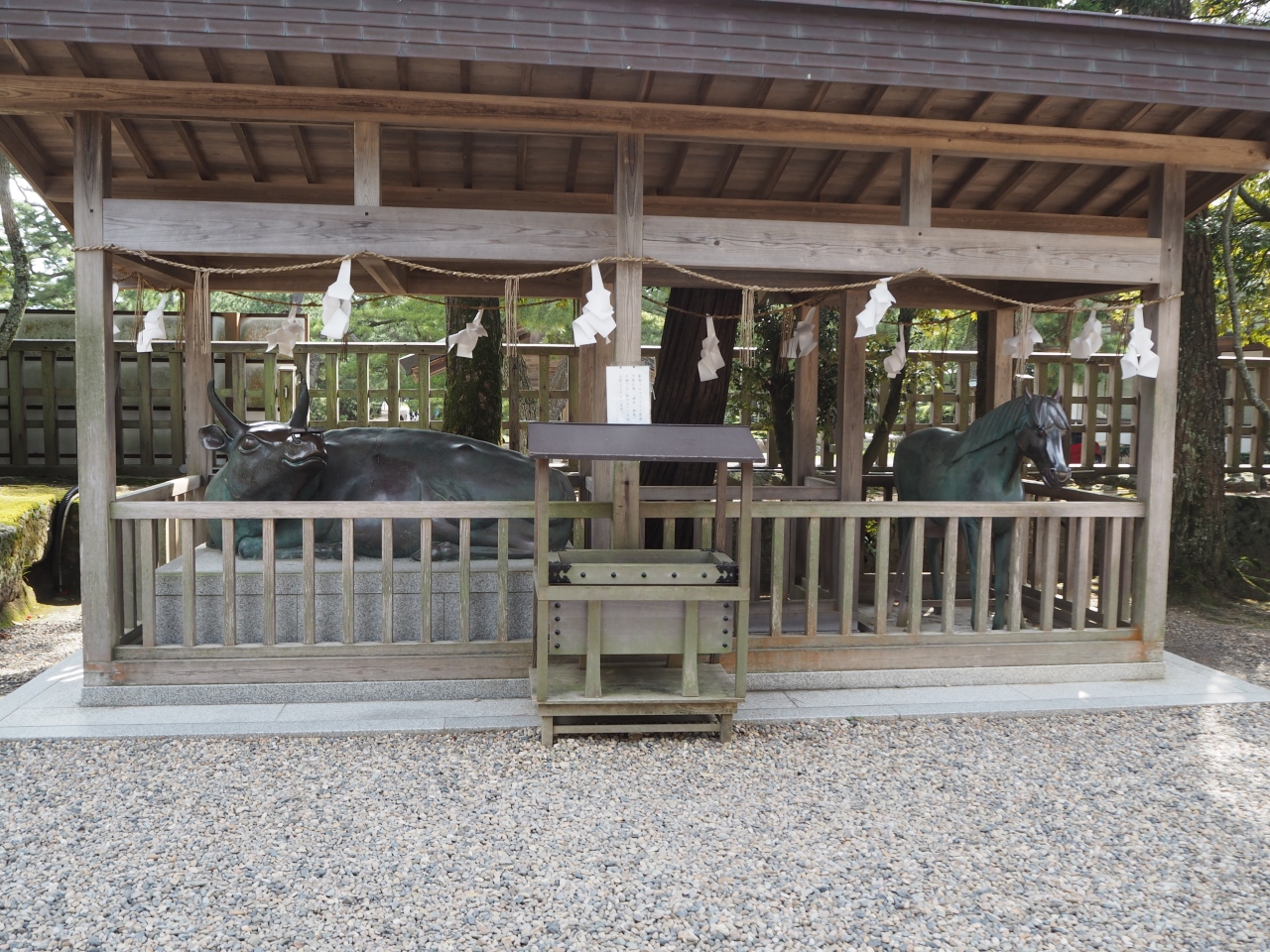 出雲大社の松の参道を歩いてきて、第4の鳥居をくぐったすぐ左側に神馬神牛像はあります。神牛、神馬ともに大きなブロンズの像で、...  続きを読む像の上には屋根が付いていました。神馬、神牛は神様の使い、乗り物ということで、触れると御利益があるということで、触られた背中や頭の上はピカピカに光っていました。ただコロナ禍の時期なので、触らないでくださいと張り紙がありましたが、関係なく多くの人が触っていました。  閉じる