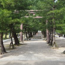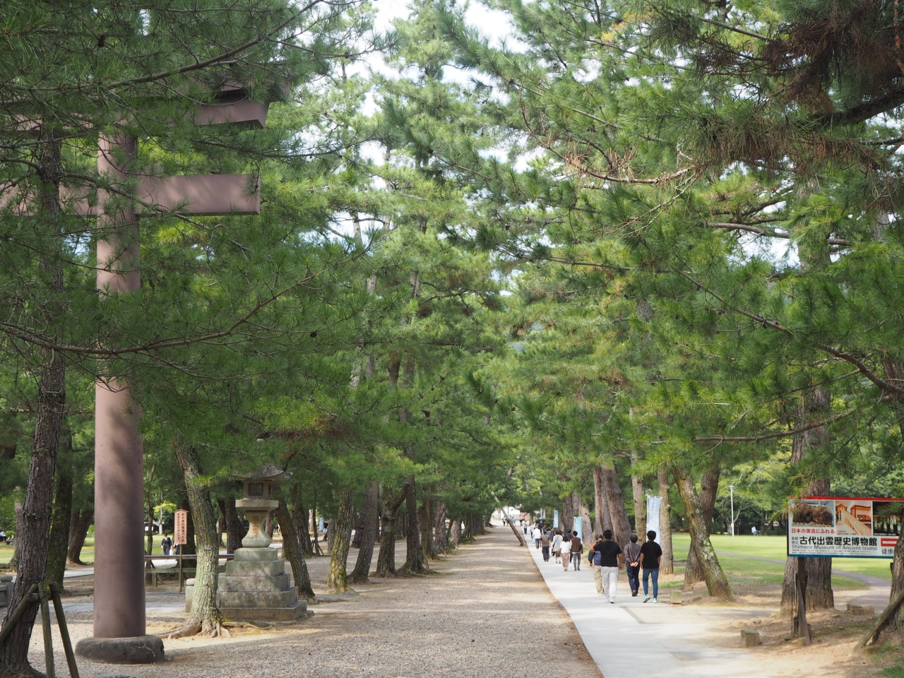 出雲大社の三の鳥居をくぐり参道を歩いて行くと、松並木が続く道が続いています。大きな生え茂った松の木が本殿方面へと並び様子は...  続きを読む壮観な眺めです。この松は初代松江藩主の堀江公が寄進したのが最初だということです。松の木の根の保護のために、松の横の舗装された道を歩いて行きます。  閉じる