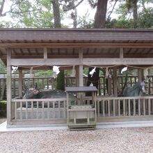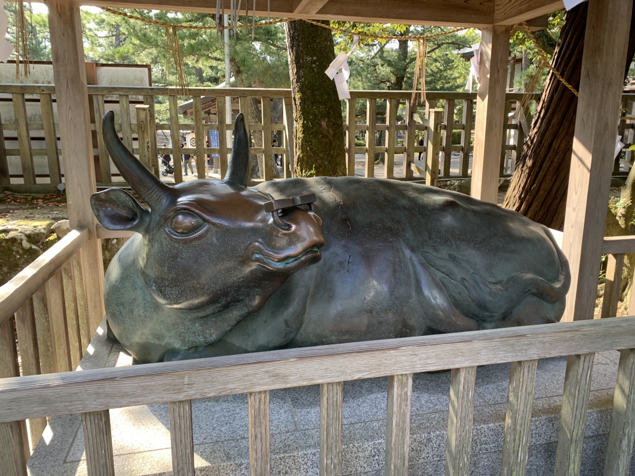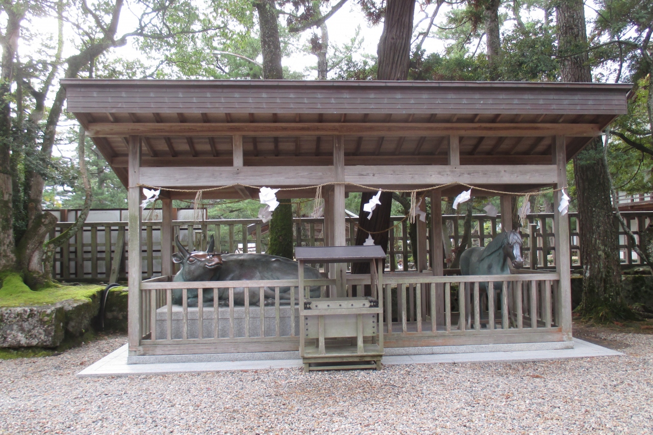 • 縁結びの神・大国主大神を祀る出雲大社というと、大社造りの大きな本殿も思い浮びますが、拝殿の独特の意匠は印象的で、出雲大社で...  続きを読むは最初にその拝殿が思い浮かびます。従って、ずっと昔からこの姿だったのだと思い込んでいました。でも、実際は1953年(昭和28年)に焼失して、1959年(昭和34年)に再建されたものだったのですね。なお、御神座は西向きという本殿は、1744年(延享元年)に造営されたものだそうです。銅の鳥居を潜ったすぐ左に神馬神牛像がありました。皆さんに撫でられて、お顔がテカテカと光っていました。ご利益は、神牛が学力向上で、神馬は子宝祈願です。