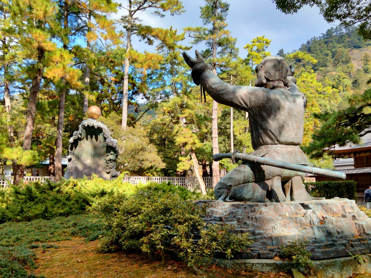 • 松の参道を奥に進み、手水舎まで達すると、その反対側に大きなムスビの御神像がありました。大国主神が幸魂・奇魂をいただき、ムス...  続きを読むビの大神になるという神話の1シーンを表わしたもので、1986年(昭和61年)に京都の崇敬者から奉納されたそうです。この原型は彫刻家の荒木文夫さんが半年間を掛けて制作したものだそうです。お若い時の大国主神は、うさぎを助けた「だいこくさま」とは随分と違い、ギラギラとしたお姿に表現されていました。まぁ、お子さんは180人もいたそうですからね。  閉じる