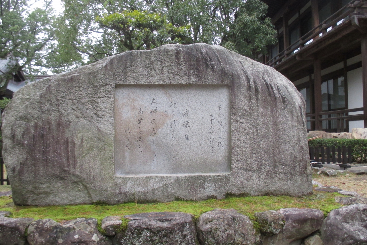上皇后陛下の歌碑が、手水舎の手前にありました。「国譲り 祀られましし 大神の 奇しき御業を 偲びて止まず」。2003年(平...  続きを読む成15年)10月に島根県で行なわれた第23回全国豊かな海づくり大会に、当時、皇后陛下としてご臨席の折、出雲大社をご参拝されて詠まれたものだそうです。石碑は充分に大きなものですが、、周りには大きな像があったりしますから、目立たず、控え目な感じがしました。  閉じる