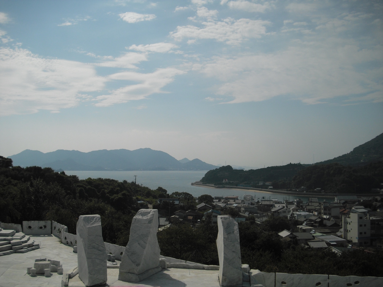 お寺の後ろのひときわ高い所には「未来心の丘(みらいしんのおか)」が広がります。5000平方メートルもある広々した丘で、世界を舞台に活躍する彫刻家、杭谷一東(くえたにいっとう) 氏が制作を担当したイタリア産の白大理石で造られたアートの丘です。丘からは瀬戸内海の絶景が見下ろせます。