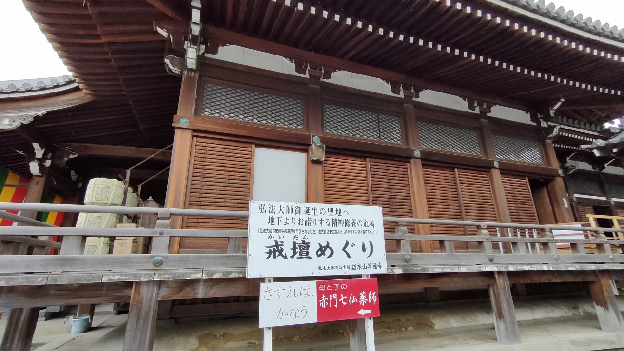四国霊場八十八ヶ所霊場75番札所。弘法大師の誕生地である香川県善通寺市にある寺院。高野山の金剛峯寺、京都の東寺とともに、大師三大霊蹟のひとつ。唐から帰朝した弘法大師が先祖の菩提を弔うため、807年から6年の歳月をかけて建立した真言宗最初の根本道場である。境内は、東院と西院に分かれ、四季を通じて参拝客が絶えない。東院は伽藍、西院は誕生院と呼ばれており、西院の御影堂の床下には全く光のない中を歩いて弘法大師誕生の聖地をお詣りする戒壇めぐりがある。