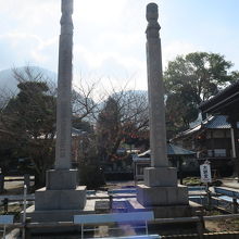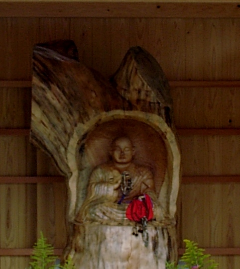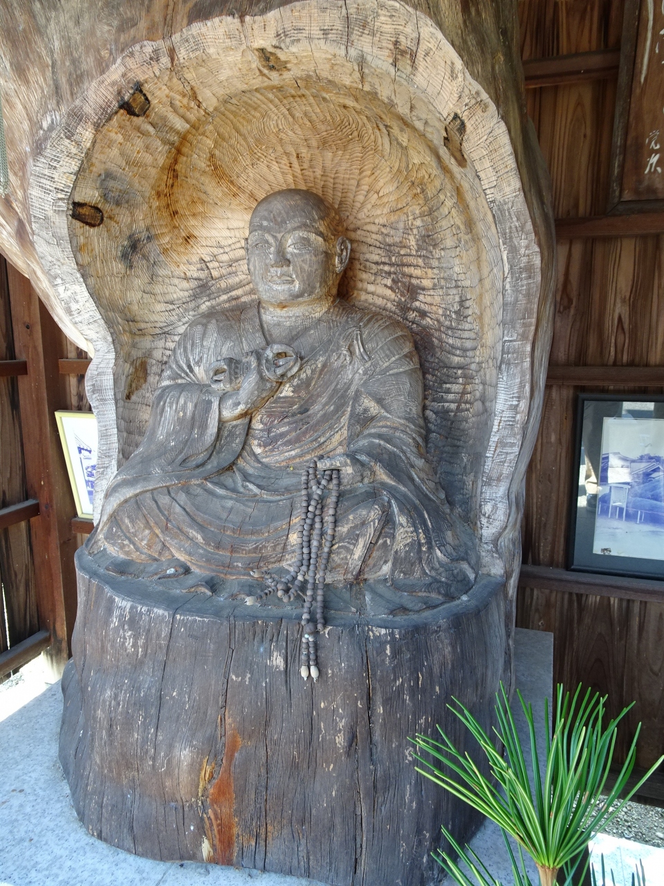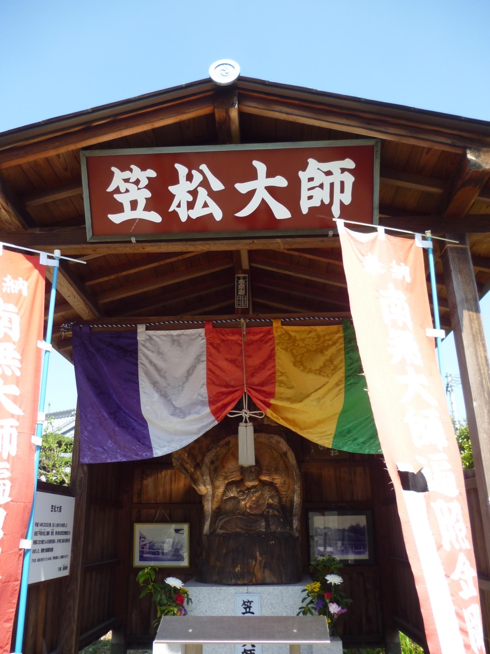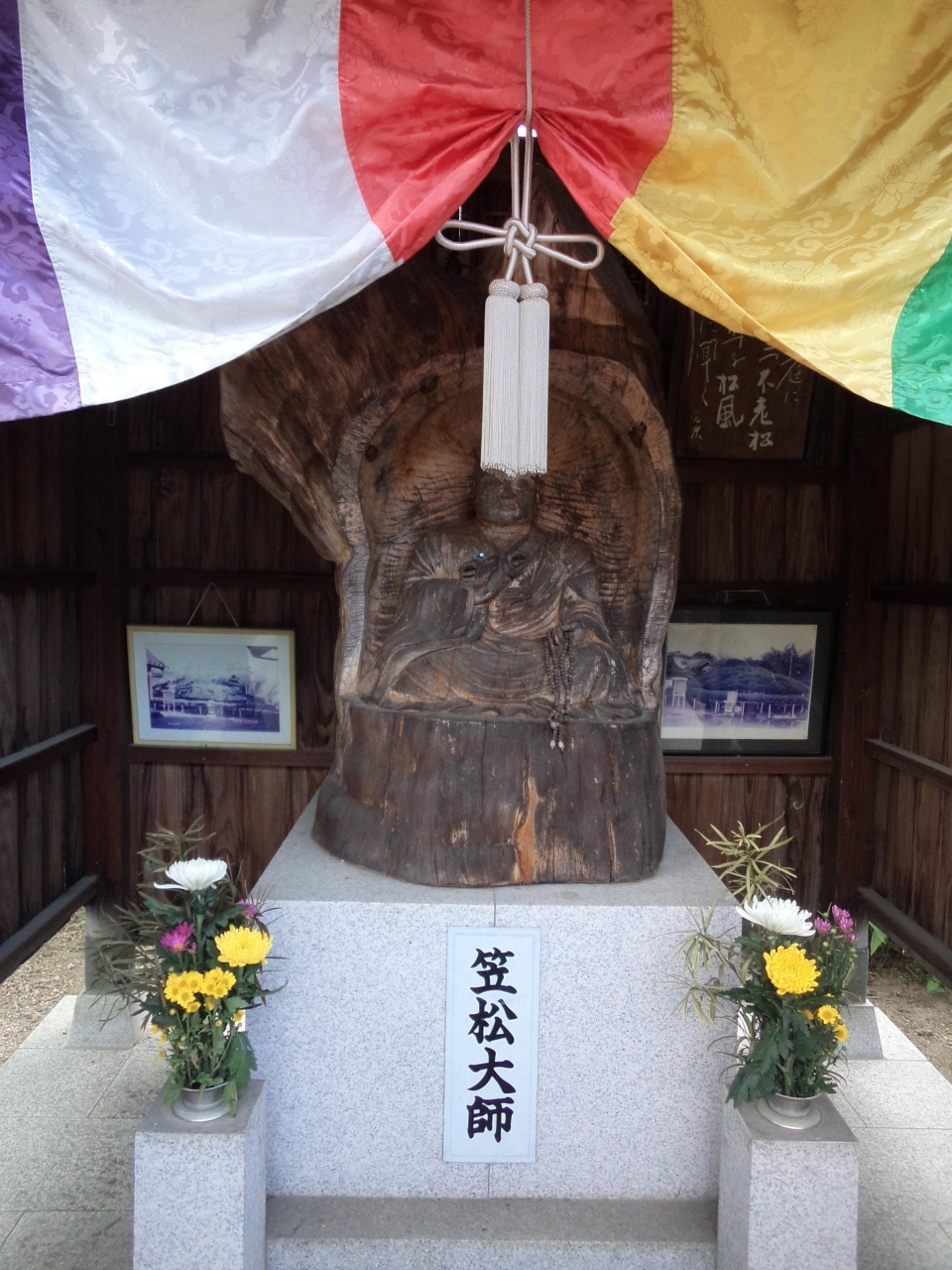 境内には、かって大師お手植えといわれる地面にすっぼり伏せたような、通称“笠松”と呼ばれていた大きな松があったそうですが、松食い虫に浸食され平成14年に伐採されたそうで、その跡地に、枯れた笠松で制作された笠松大師の像がありました。