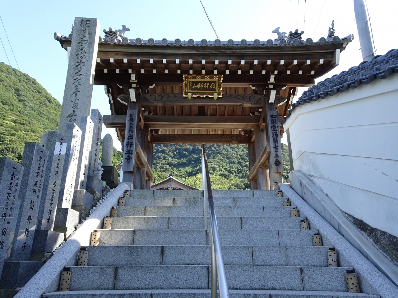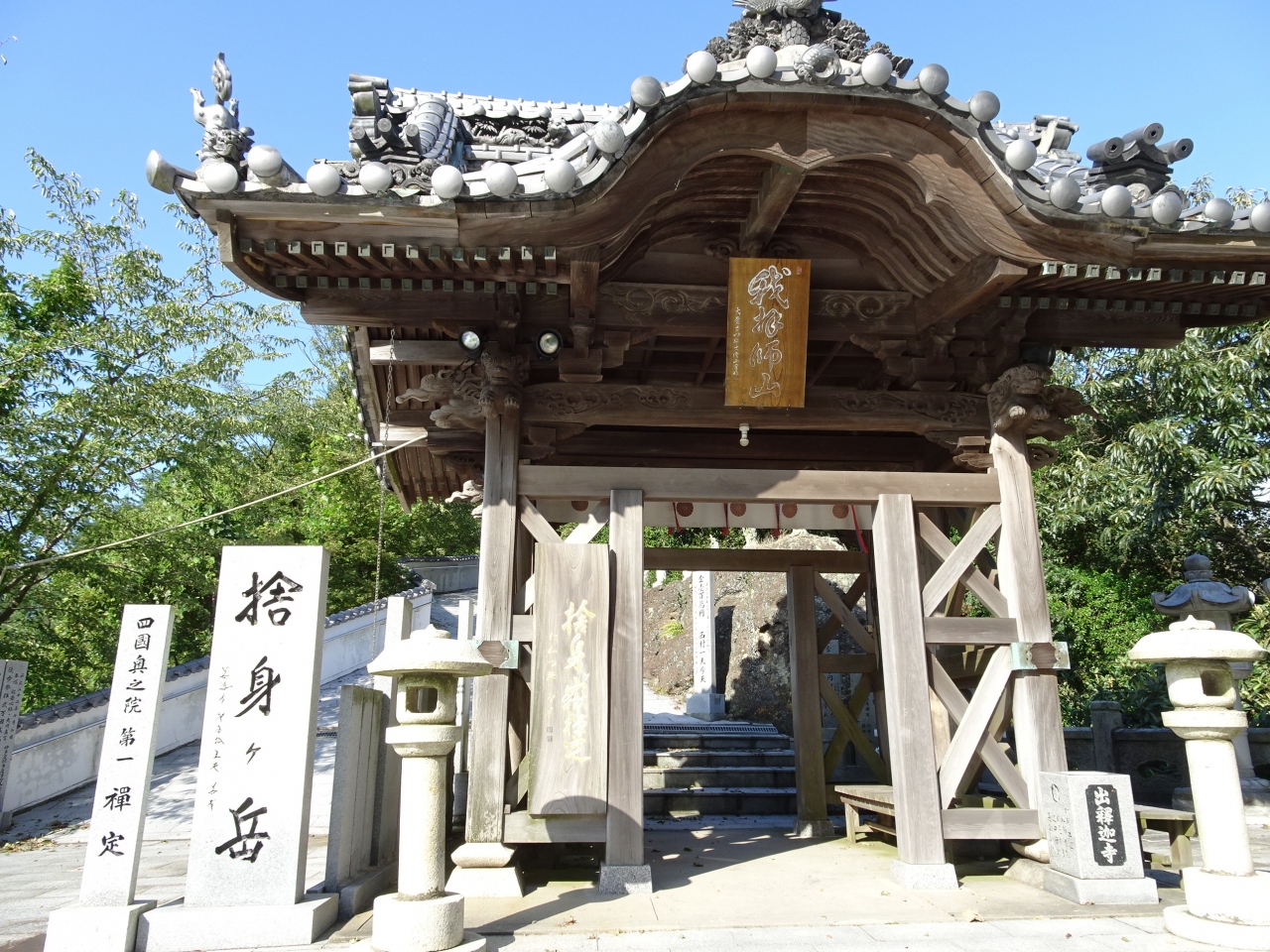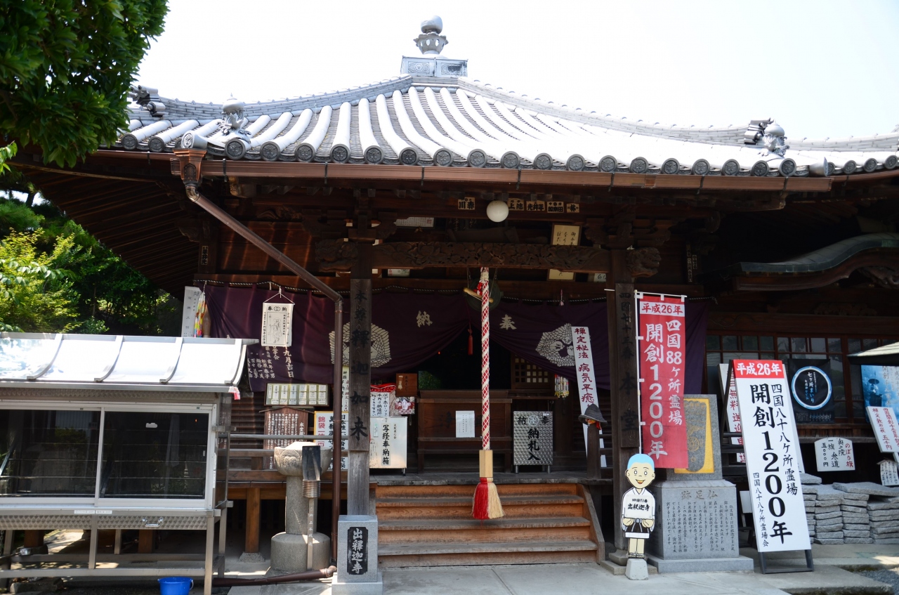四国八十八ヶ所霊場第73番札所。我拝師山の山頂近くの捨身ヶ岳から弘法大師空海が身を投げたところ、お釈迦様が現れて救済したという伝説が残るお寺。