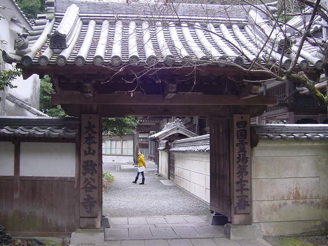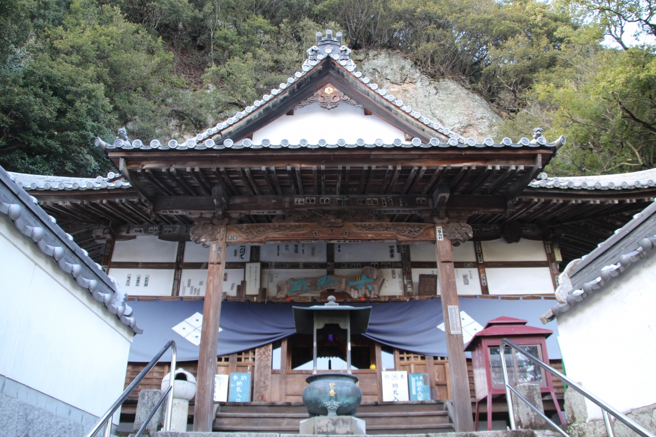 四国霊場第71番札所。天平年間に行基が開山、空海が幼年期「獅子窟」で修行を積んだ。磨崖仏、賽の河原、五輪塔など多くの信仰遺跡が残る。寺宝の五鈷鈴は重要文化財。