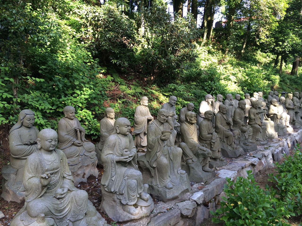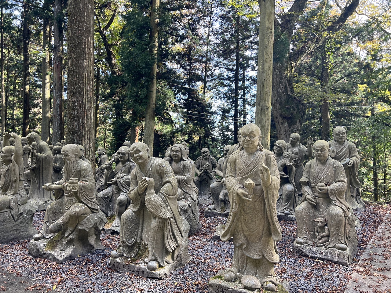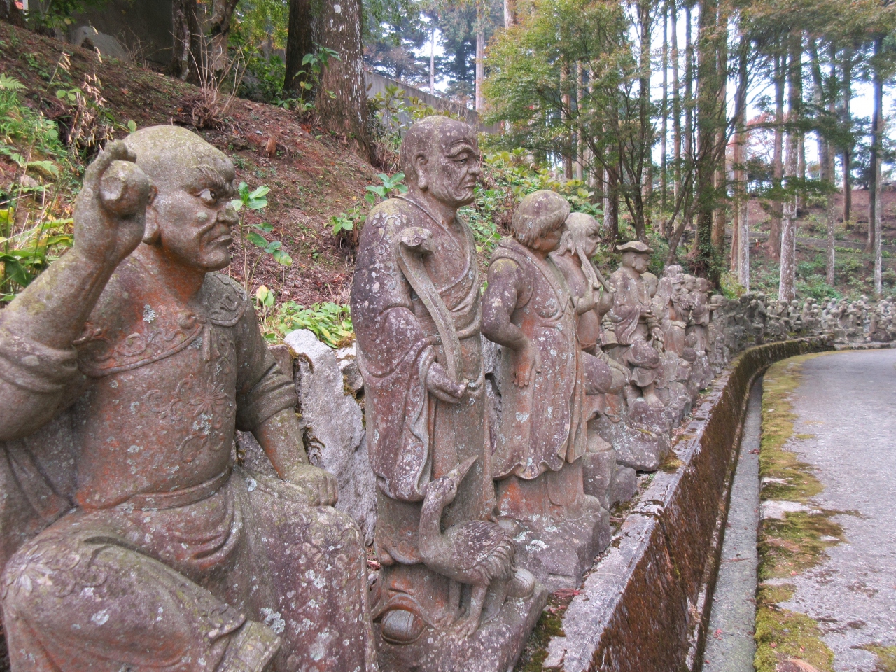 寺まで続く道々に羅漢像がいたるところに配置されちょっとした石屋の展示場かと見紛うほどです。