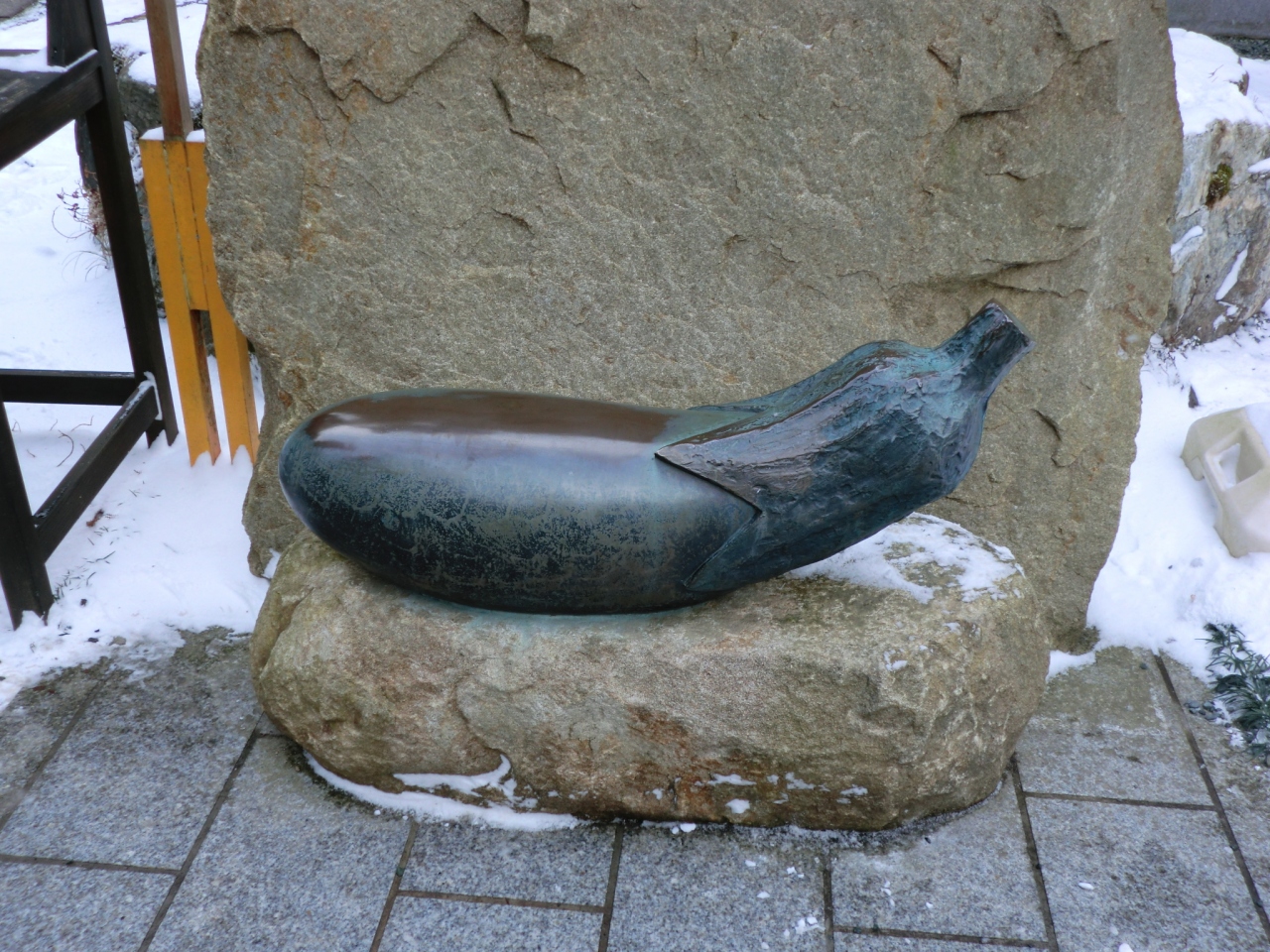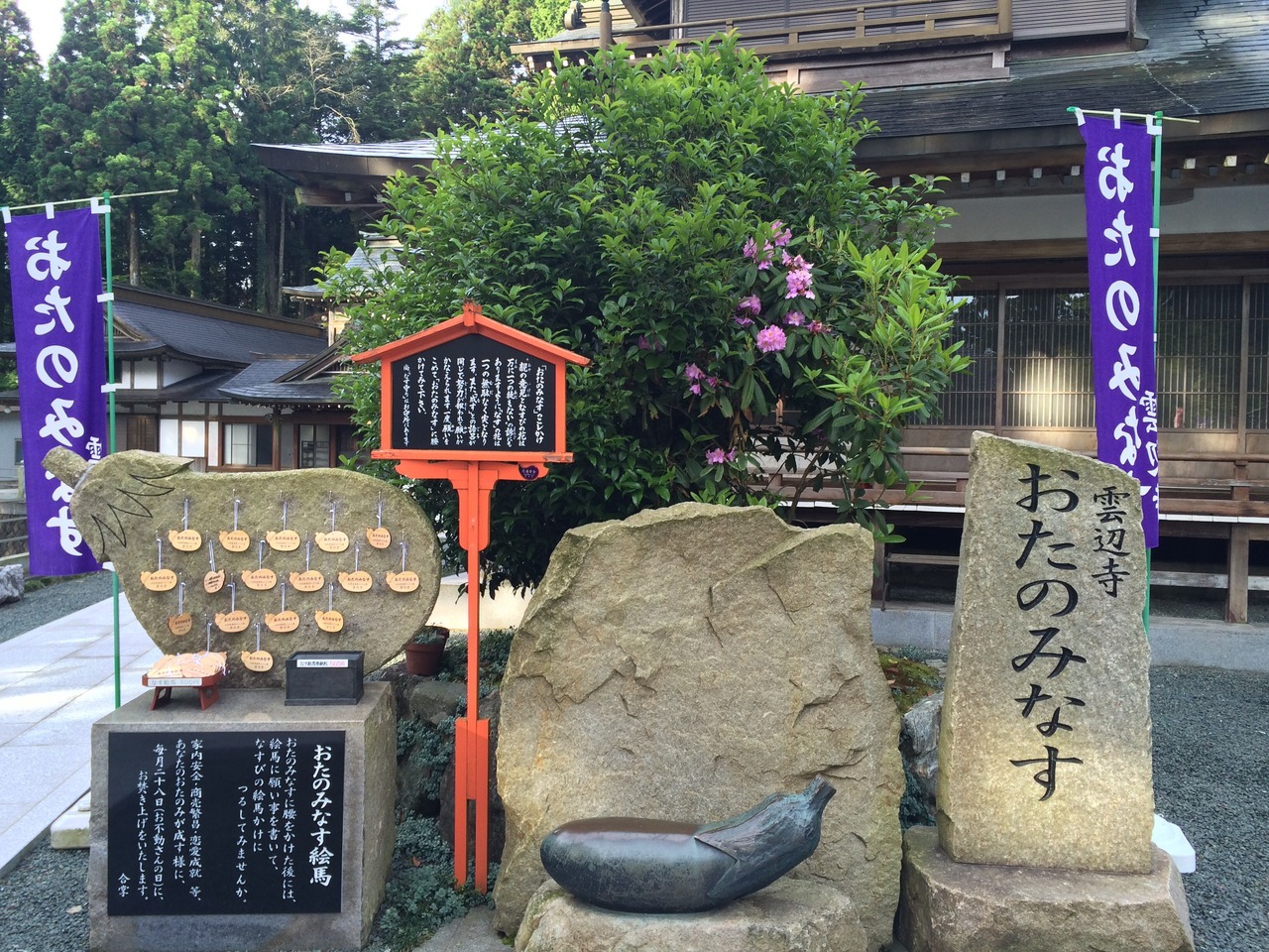 護摩堂前には「おたのみなす」という椅子サイズのリアルななすがありました。