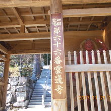 本堂に着いて初めて気づくのですが本堂側に徳島側から続く遍路道の入り口、すなわち山門があるのです。ロープウェイからの道は寺の脇道ということなのですね。