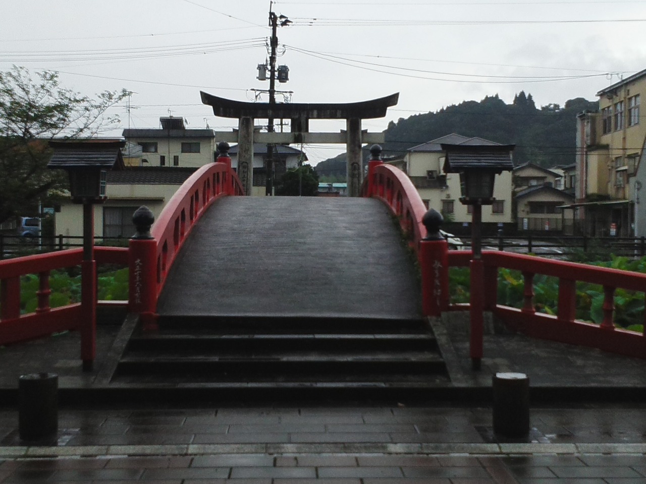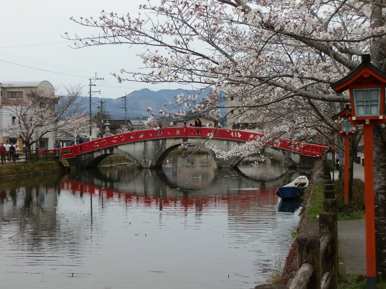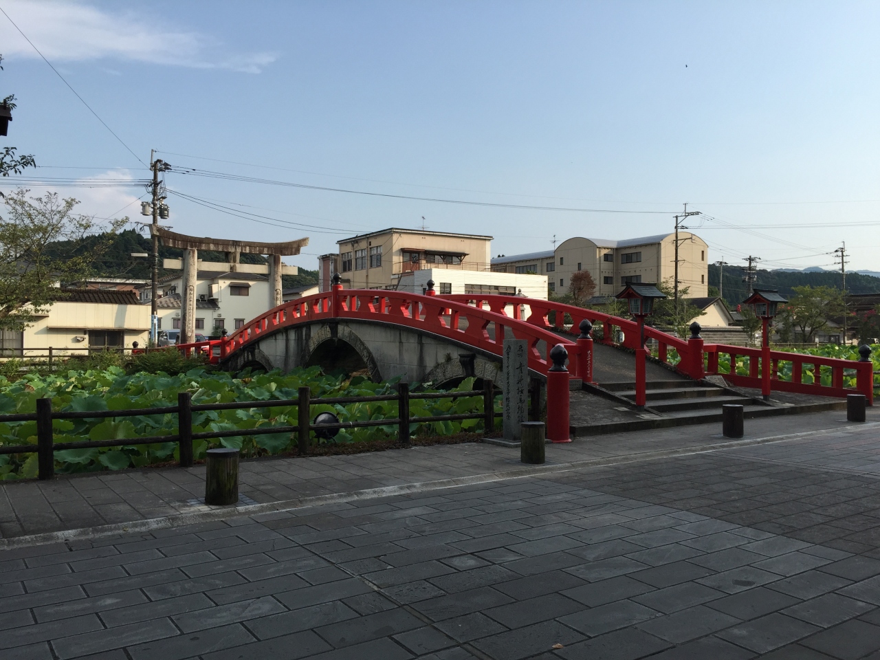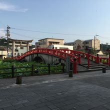 伝説の池に架かる朱色の橋。