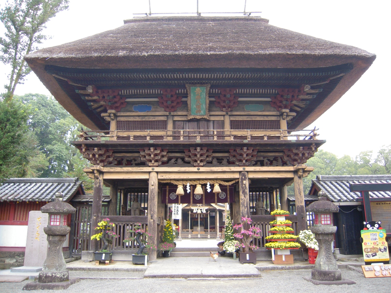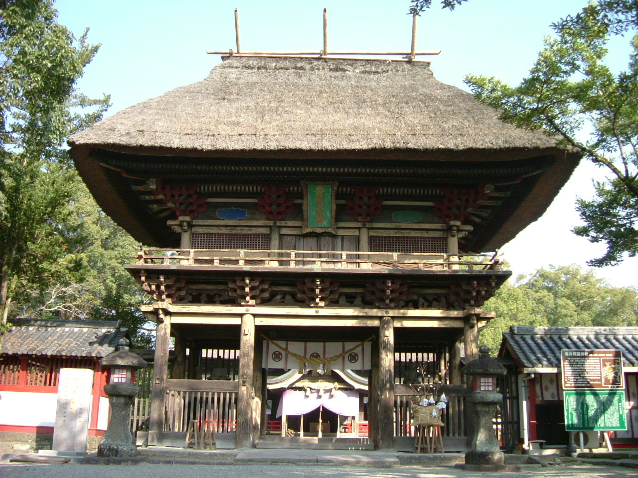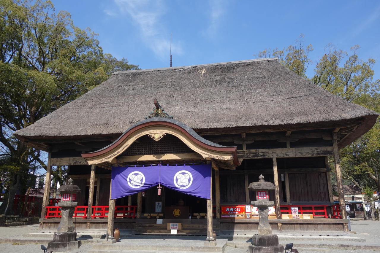 創建は806年(平安時代)で1200年以上の歴史を誇る。現在の建物は、慶長14年(1609)から18年にかけて造営され本殿・廊・幣殿・拝殿・楼門の五棟社殿群が熊本県で初の国宝指定を受けた。建造物としては日本最南端の国宝になり、茅葺の建物としては全国唯一の国宝。茅葺きの桃山様式の楼門は、華やかさと迫力を醸し出し圧倒的な存在感を示している。