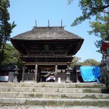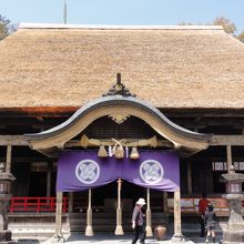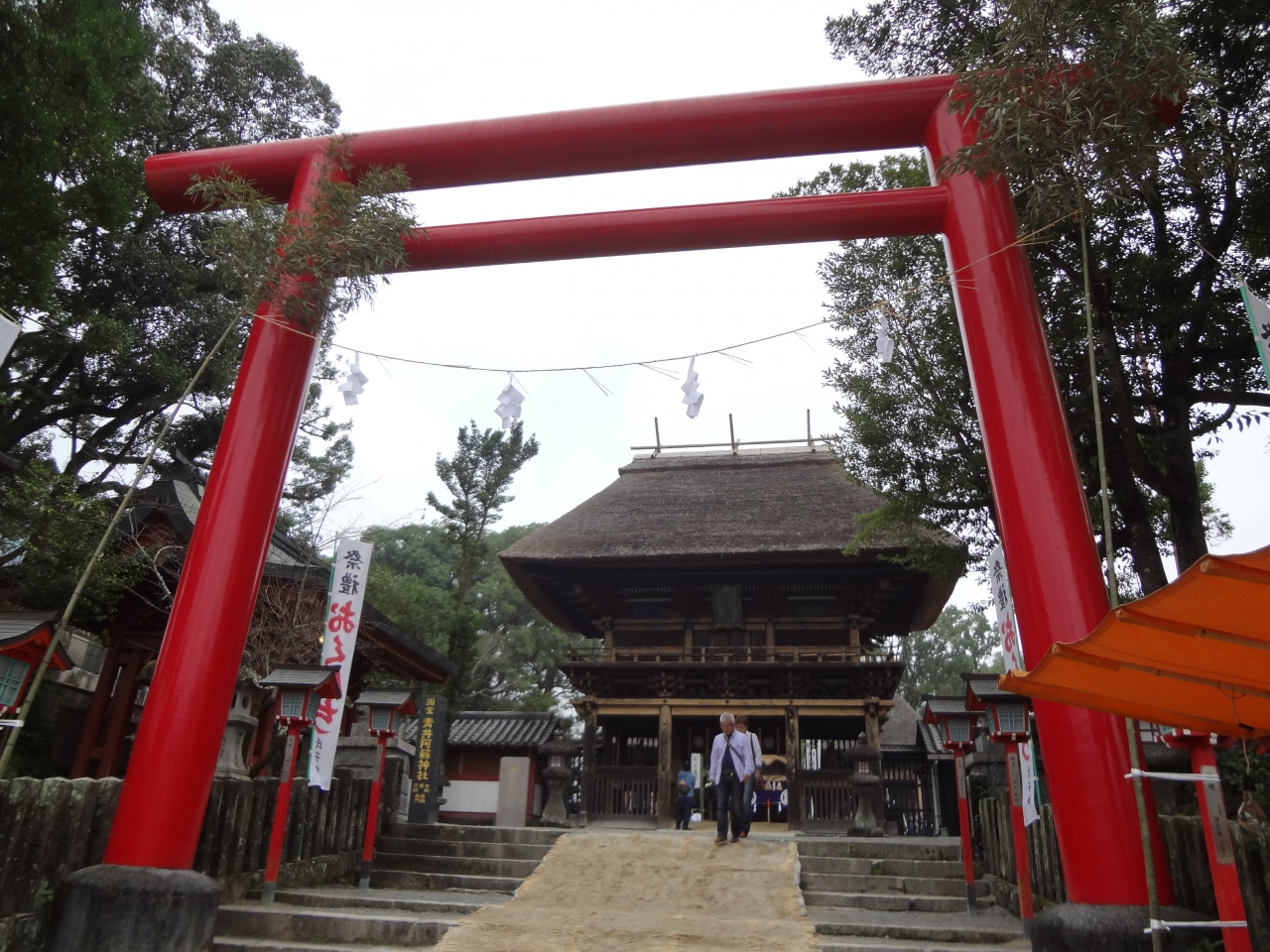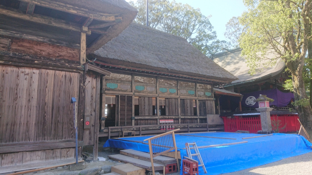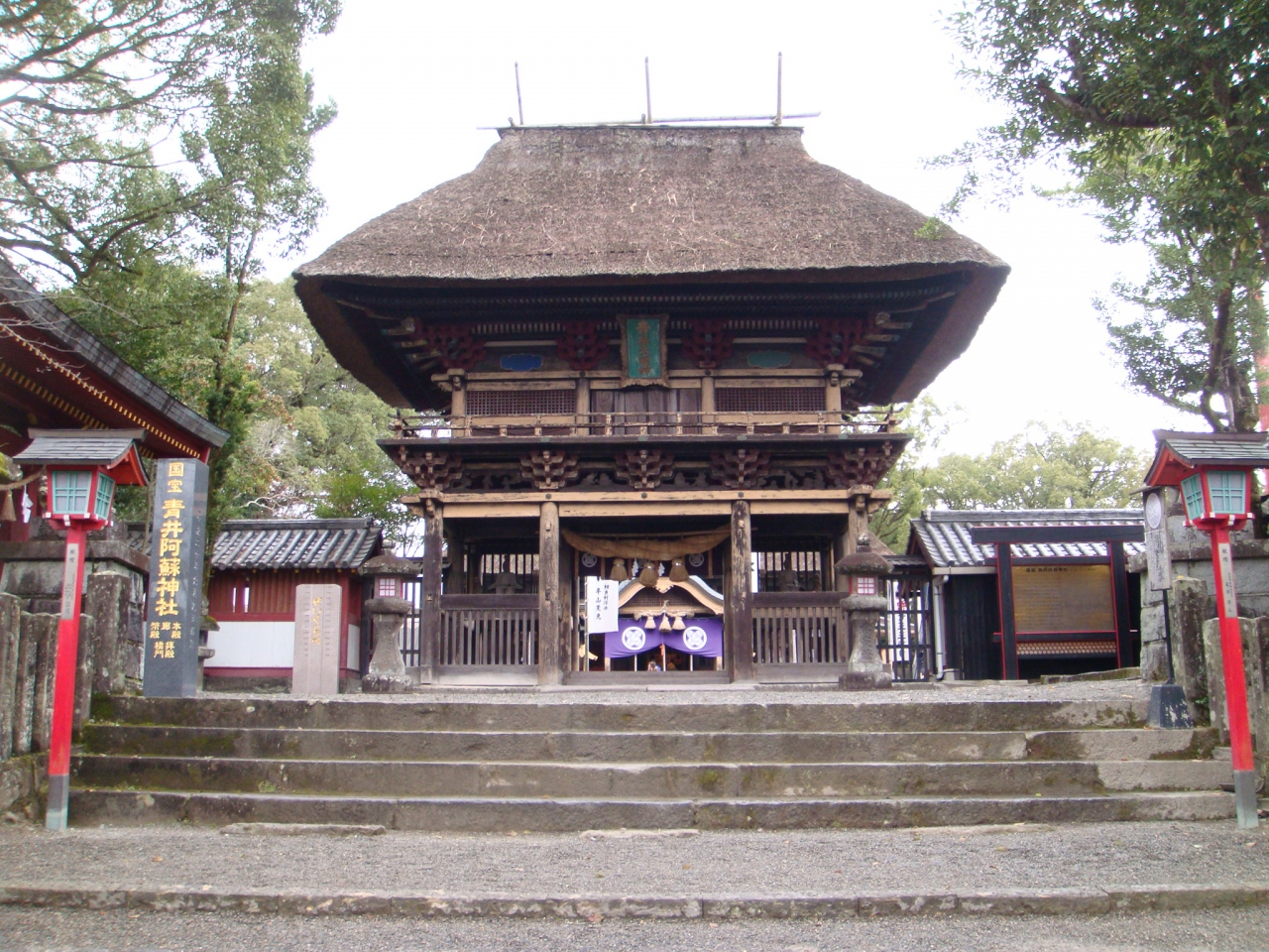 創建は806年(平安時代)で1200年以上の歴史を誇る。現在の建物は、慶長14年(1609)から18年にかけて造営され本殿・廊・幣殿・拝殿・楼門の五棟社殿群が熊本県で初の国宝指定を受けた。建造物としては日本最南端の国宝になり、茅葺の建物としては全国唯一の国宝。茅葺きの桃山様式の楼門は、華やかさと迫力を醸し出し圧倒的な存在感を示している。