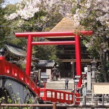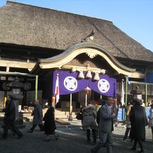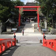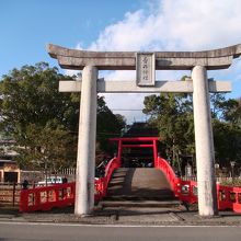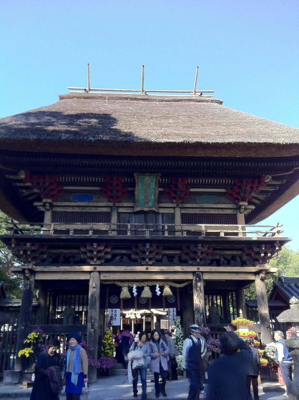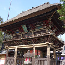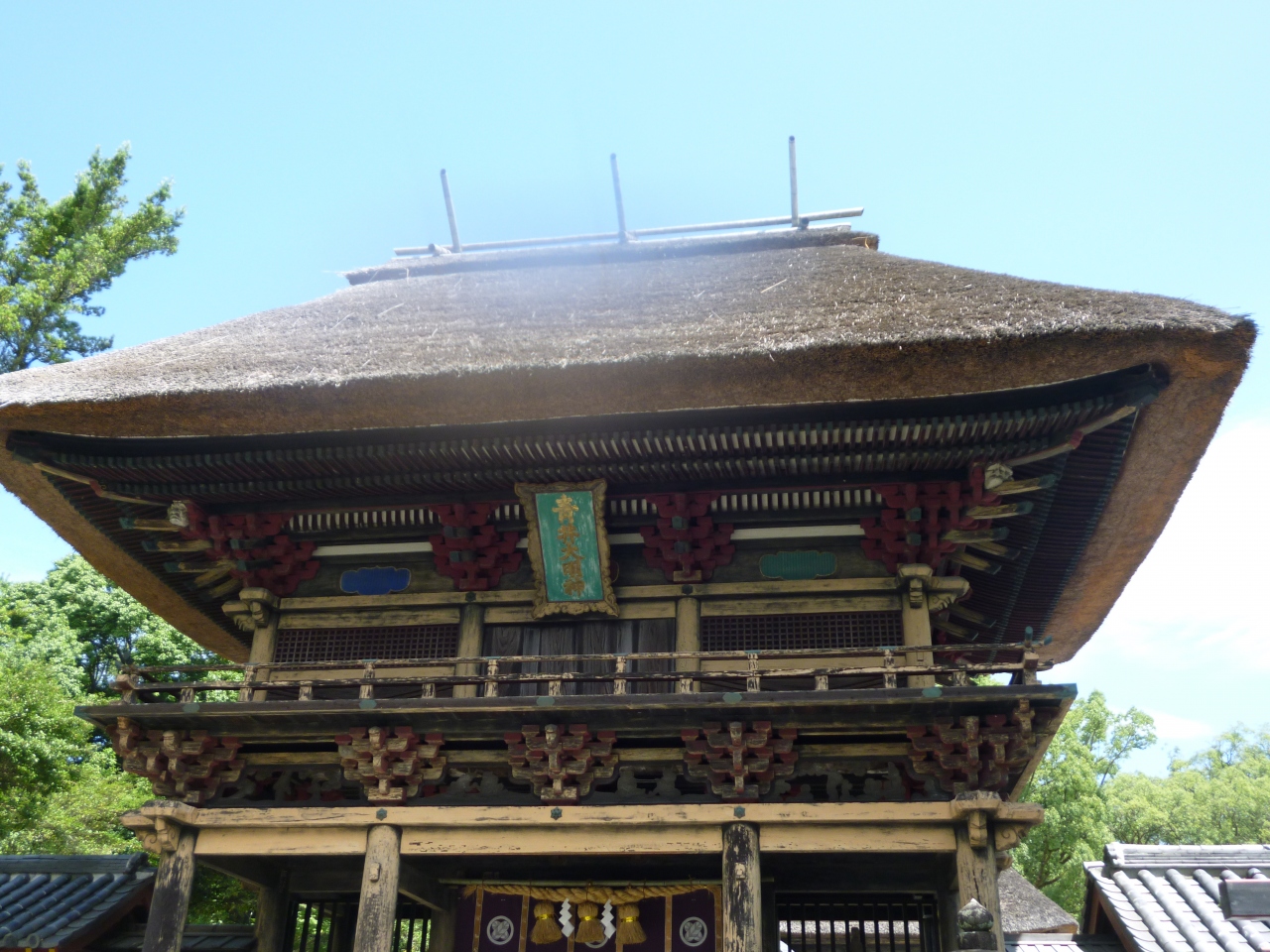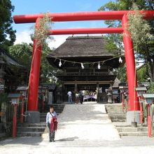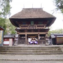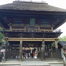 帽子を被ったような大きな屋根を持つ楼門が迎えてくれる神社