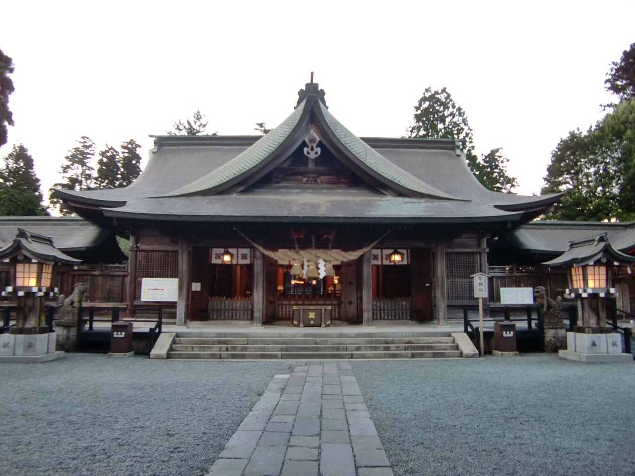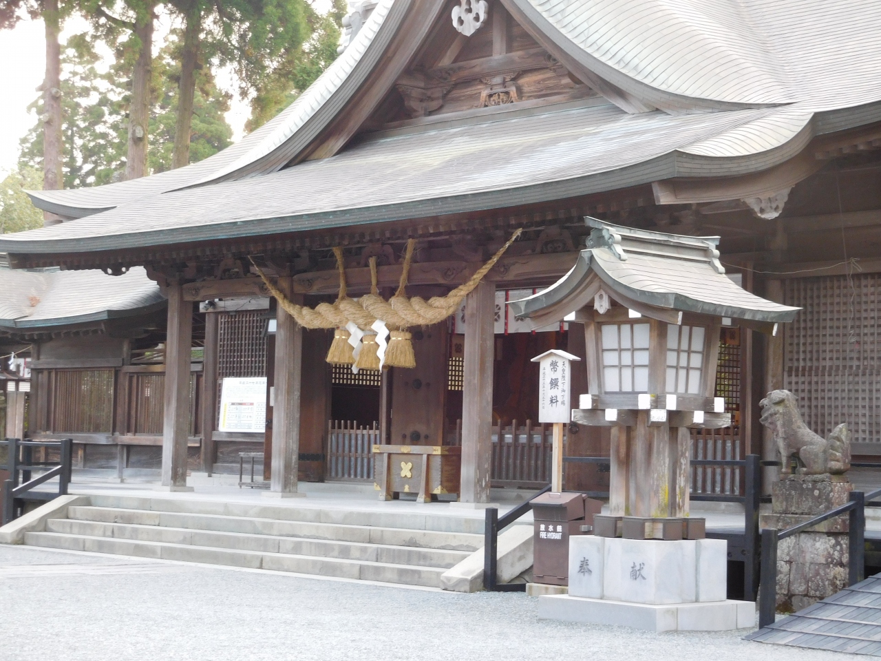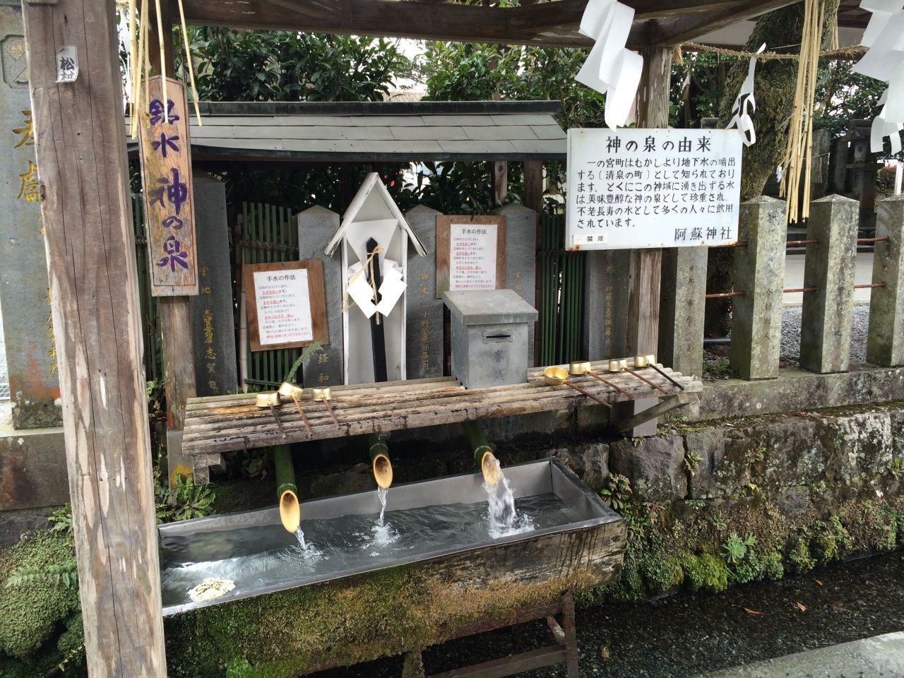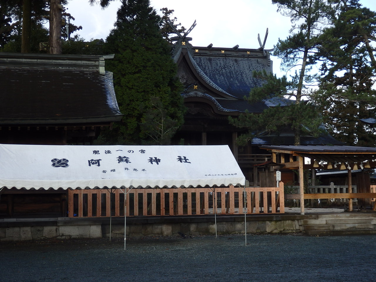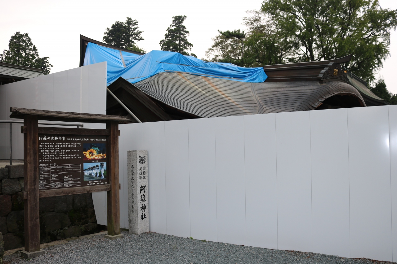 阿蘇開拓の祖、健磐龍命ほか12神を祀る肥後一の宮。三つの神殿・拝殿・楼門など重厚で厳粛な社殿である。平成28年熊本地震で被害を受け、楼門及び拝殿は現在修復中。