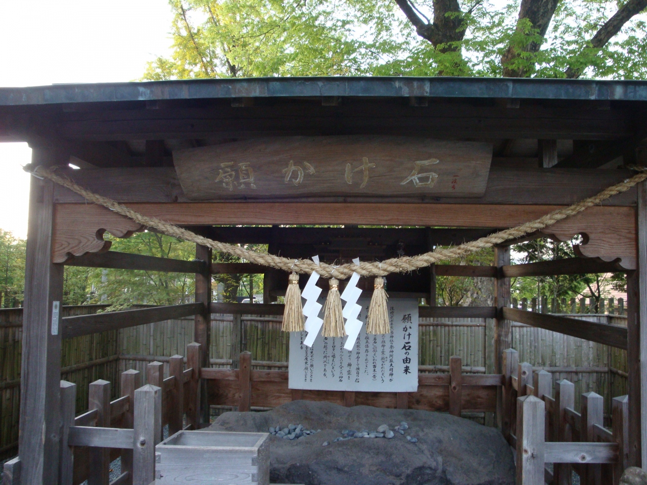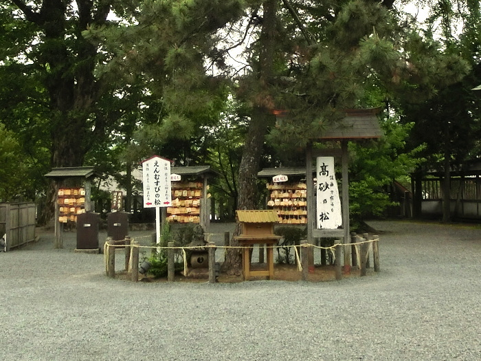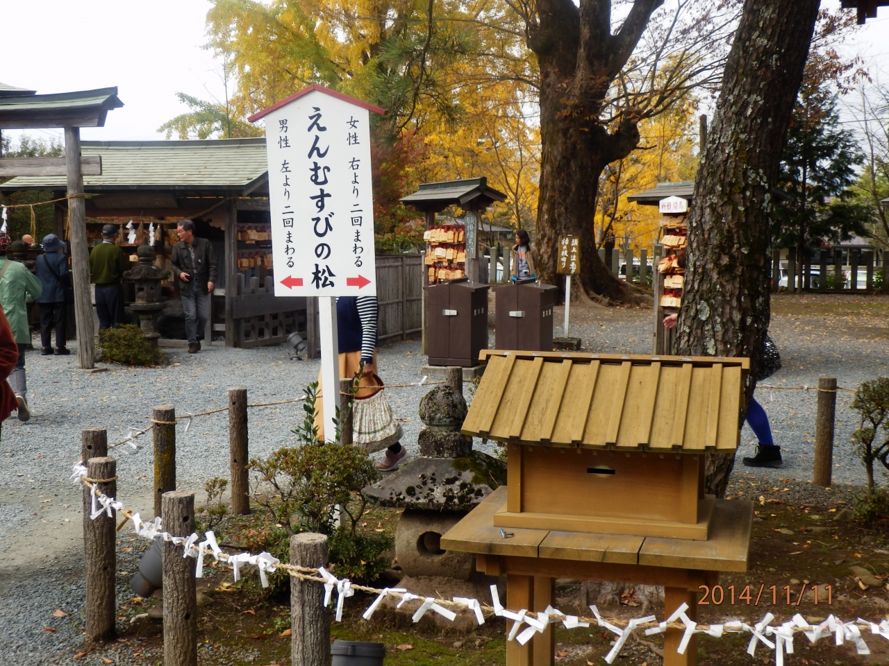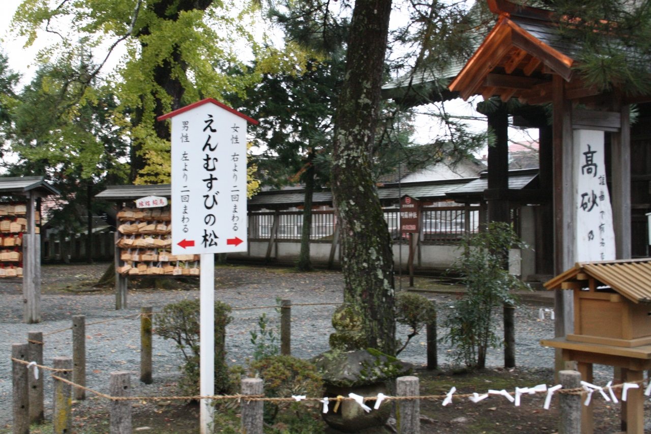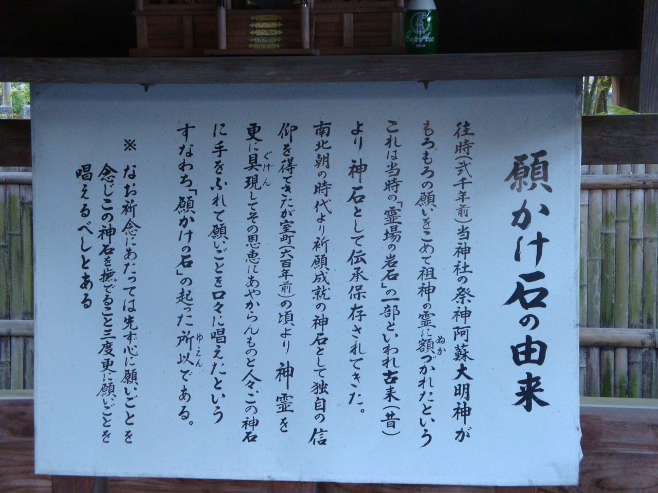 楼門をくぐると正面に本殿がある。ここの神社は、12神を祀っているらしく、主神は、健磐龍命である。昔、阿蘇外輪山の内部が、まだ湖だったころ、ここを田畑にしようと、今の立野付近を蹴やぶって水を抜いたという神話のある神、それが、健磐龍命その神である。 本殿で手を合わせた後、神社に向かって右手に行ってみよう。まず、【願掛け石】というものがある。この大きな石を三回撫でて願いを唱えると願いがかなうらしい。 そして、その横には、【縁結びの松】というものがある。縁結び…。 これだけを聞くと最近流行りの縁のない人を呼び込む策? と、思われがちだが、ここは違う。 ここの松は、結婚披露宴などで時々耳にする『高砂や~♪、この浦舟に帆を上げて~♪…』と歌われている松なのだそうだ。 この松を、男は左から2回、女性は右から2回まわるとご利益があるとされる。 たまたま、同時に知らぬ男女が真剣にこの松を回っていれば、どこかの位置で男女が顔を見合わせるようにぶつかるわけで… この人が、神が出会わせてくれた異性なのか… もし、そういうタイミングが有れば、勇気を出して声をかけてみるべきであろう。 (以外に、回っている人、多いんだよ)