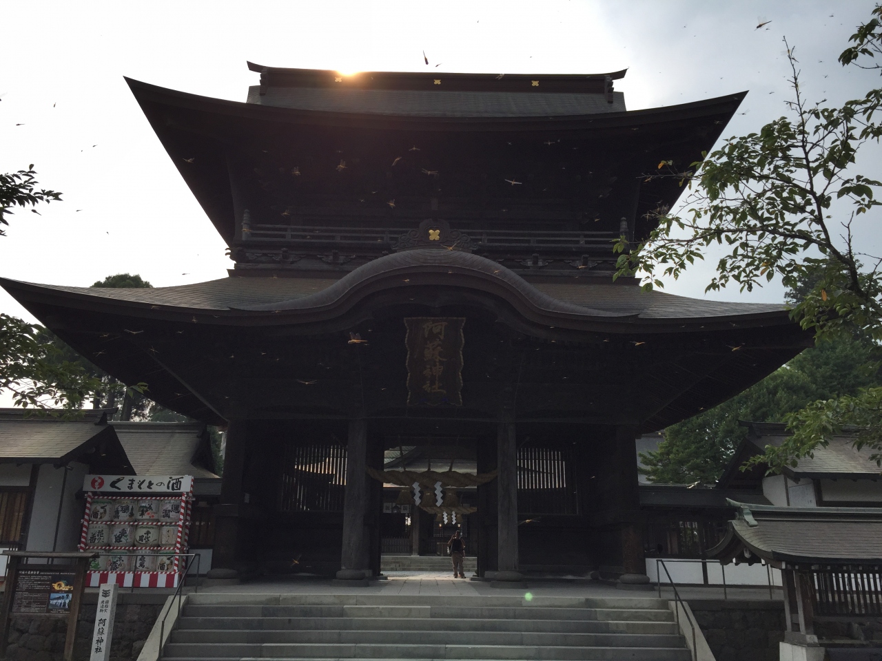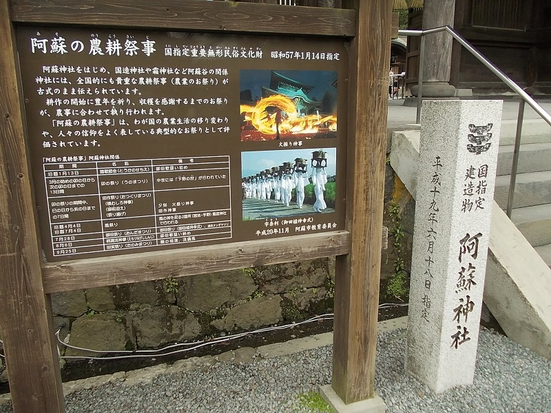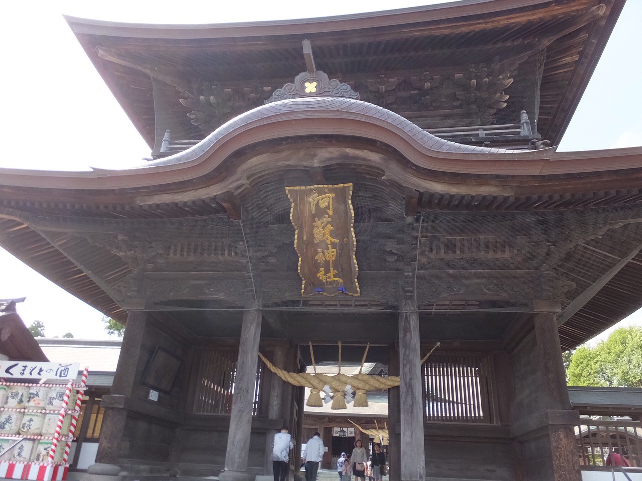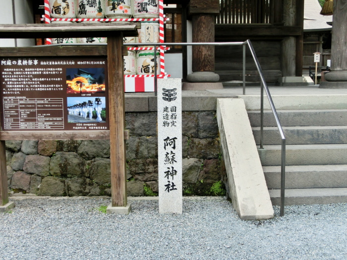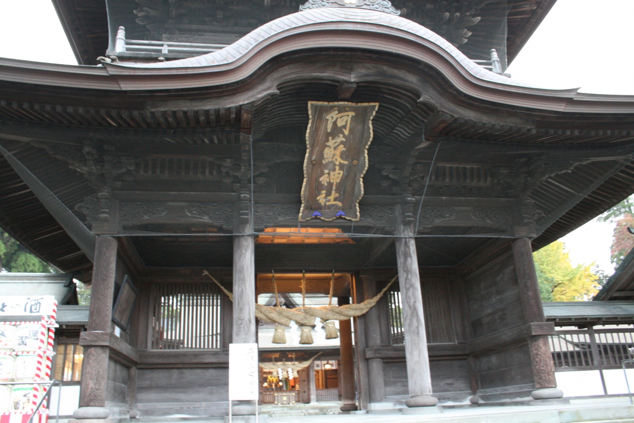 阿蘇開拓の祖、健磐龍命ほか12神を祀る肥後一の宮。三つの神殿・拝殿・楼門など重厚で厳粛な社殿である。平成28年熊本地震で被害を受け、楼門及び拝殿は現在修復中。