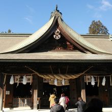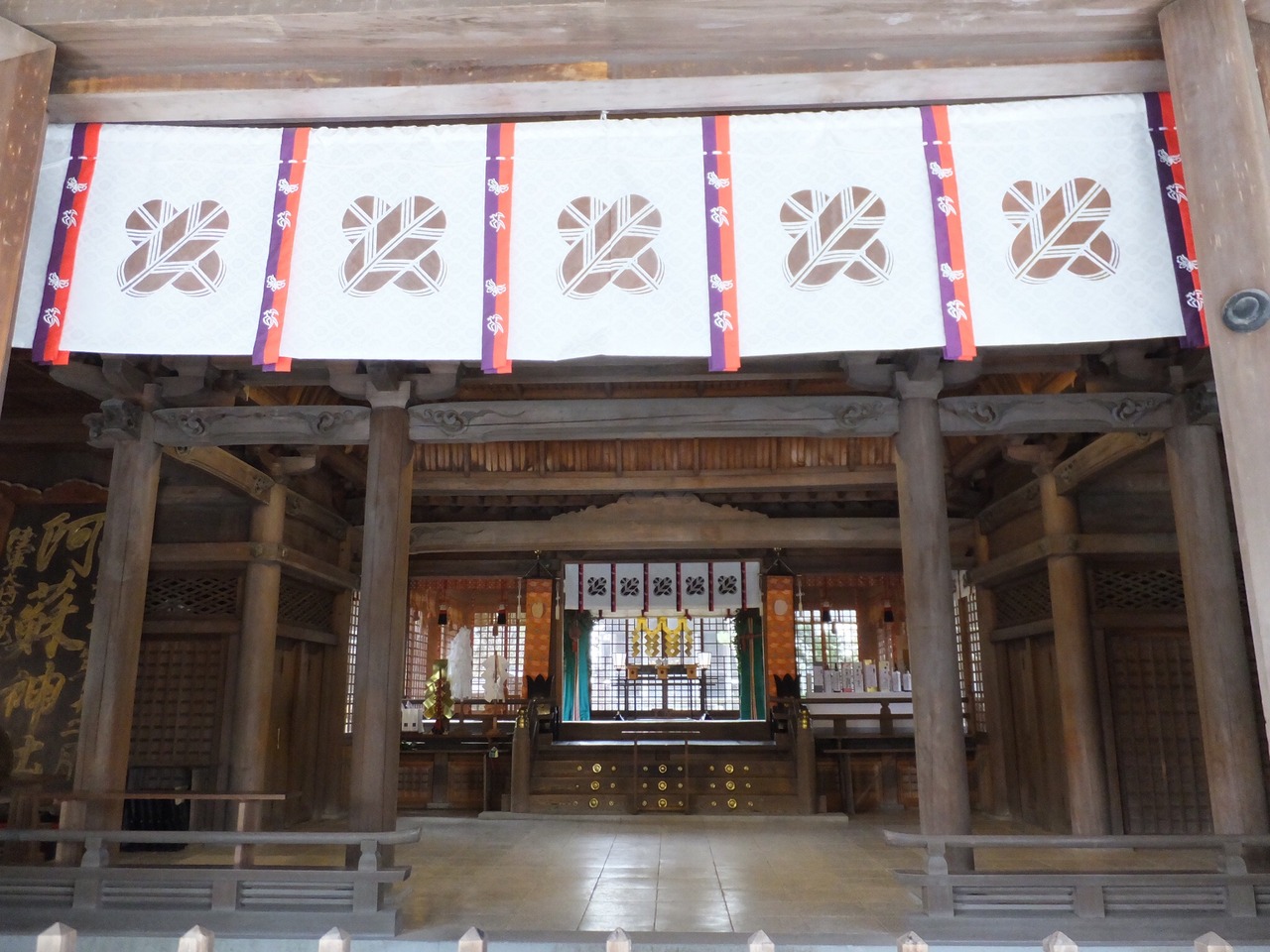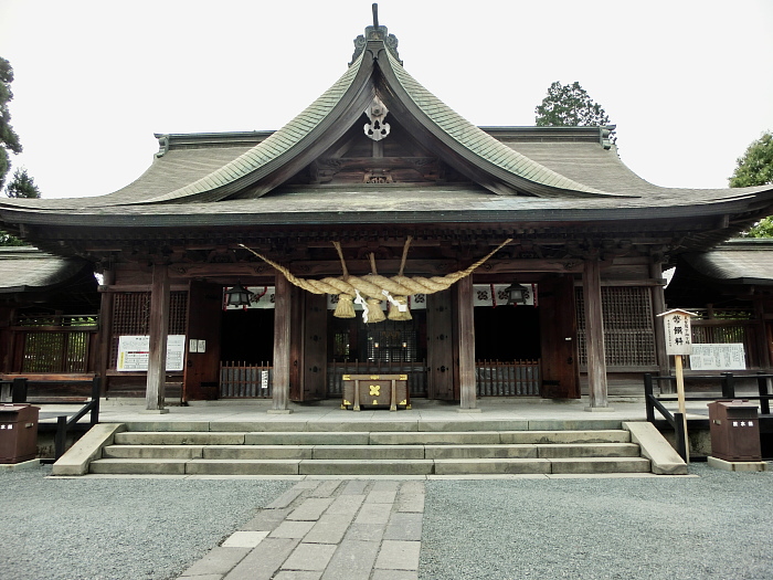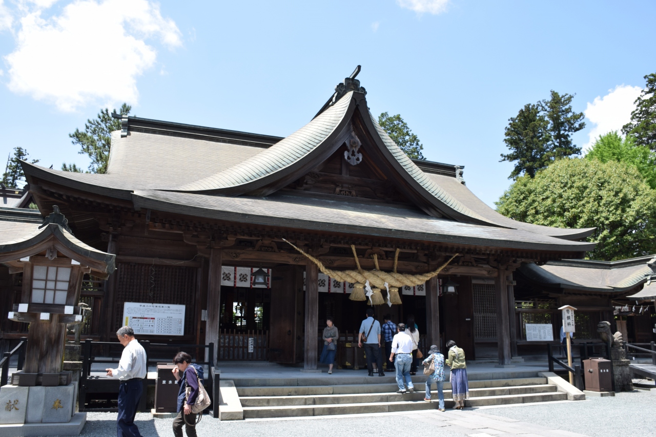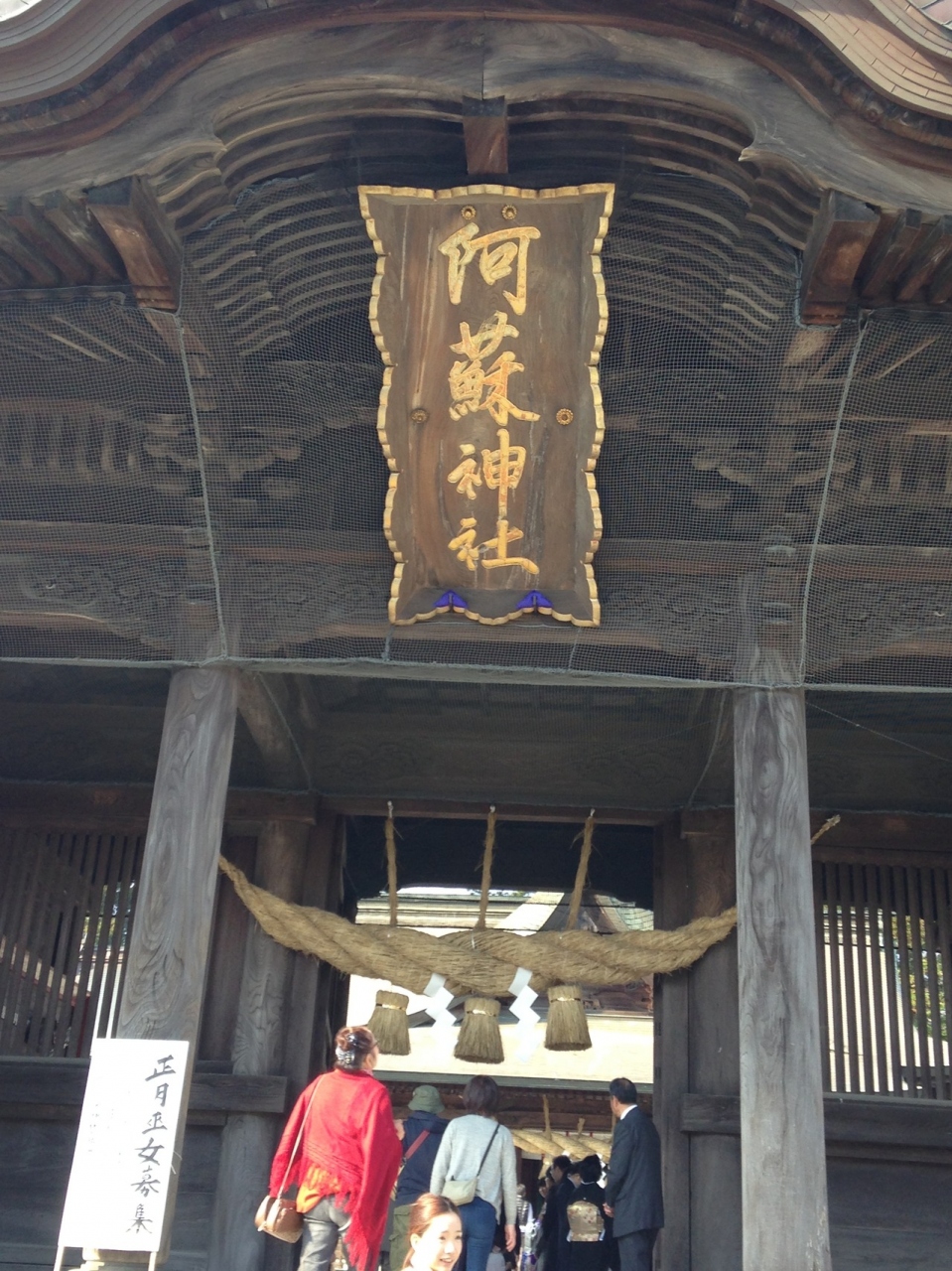阿蘇開拓の祖、健磐龍命ほか12神を祀る肥後一の宮。三つの神殿・拝殿・楼門など重厚で厳粛な社殿である。平成28年熊本地震で被害を受け、楼門及び拝殿は現在修復中。