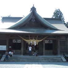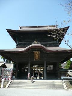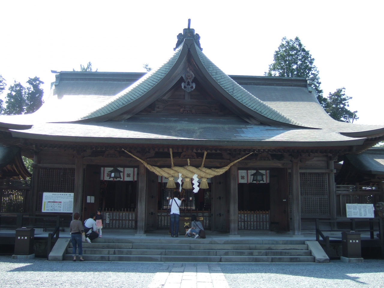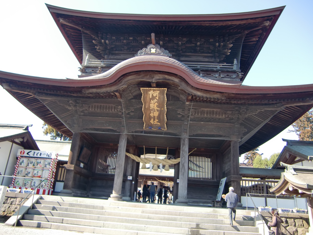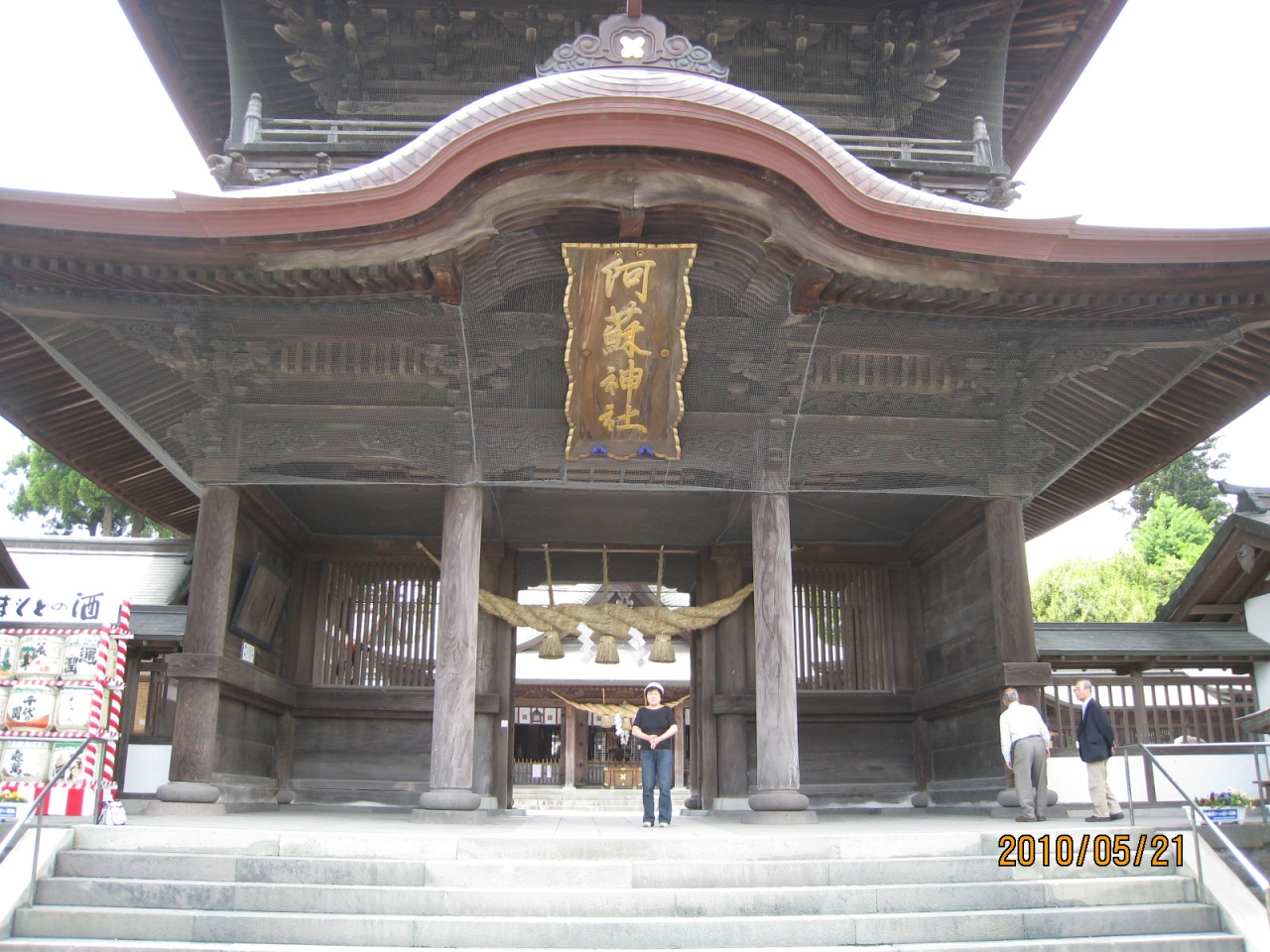 阿蘇開拓の祖、健磐龍命ほか12神を祀る肥後一の宮。三つの神殿・拝殿・楼門など重厚で厳粛な社殿である。平成28年熊本地震で被害を受け、楼門及び拝殿は現在修復中。