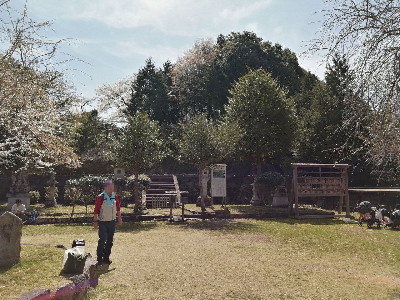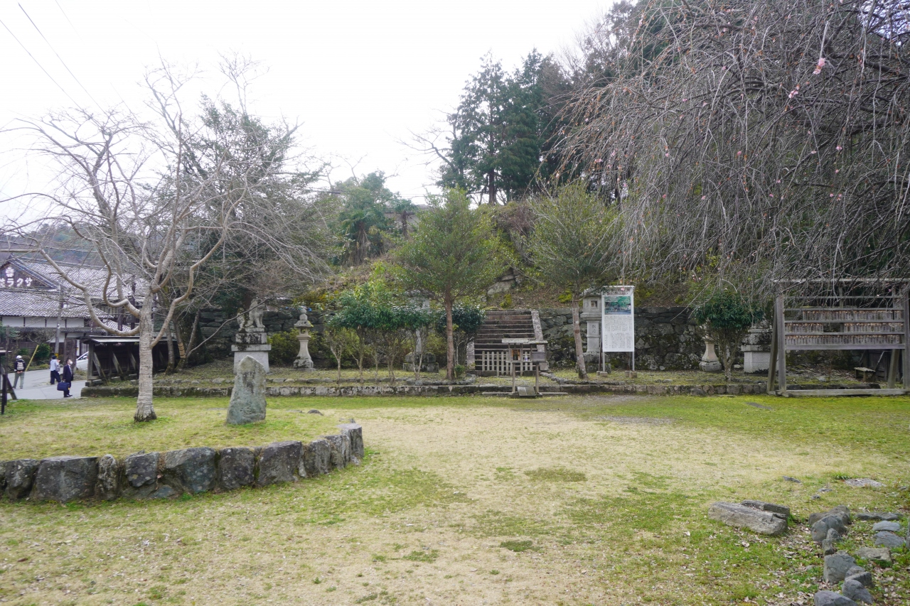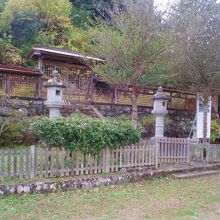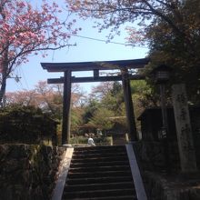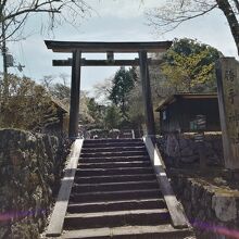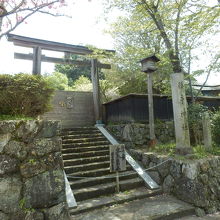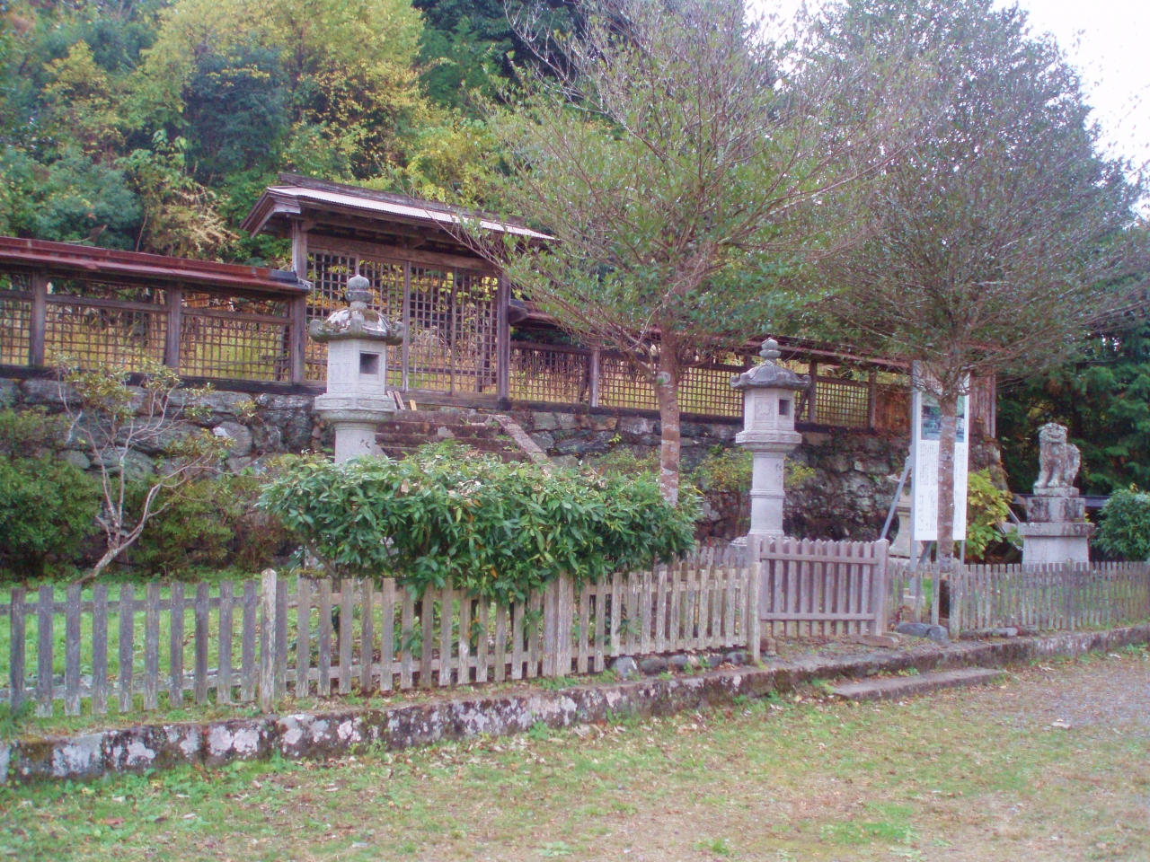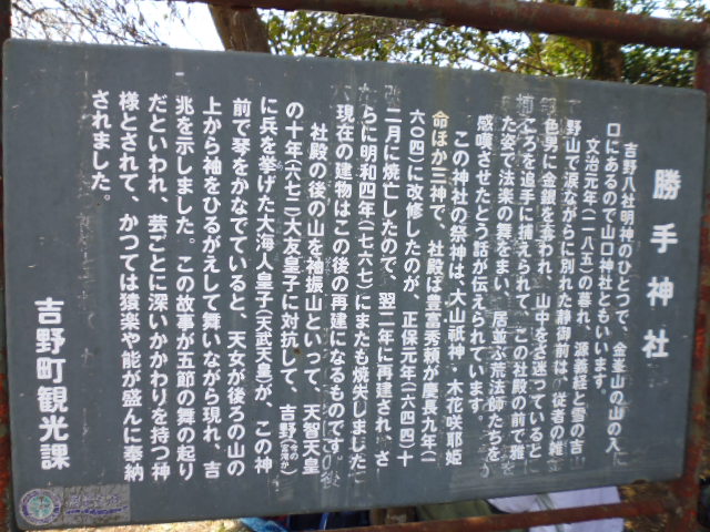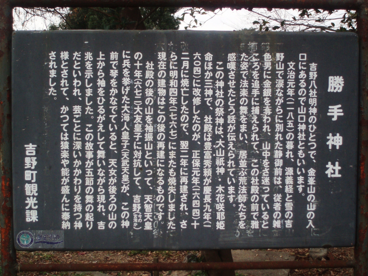 吉野山山上へのぼる街道と如意輪寺への分岐にあります。後方の袖振山は、大海人皇子(のちの天武天皇)が社前で琴をかなでられたとき、天女が袖をひるがえして舞ったという伝説で知られています。 境内は、義経と別れた静御前が追手に捕えられ、請われて舞いを舞ったといわれる地。社殿は2001(平成13)年に焼失してしまいました。
