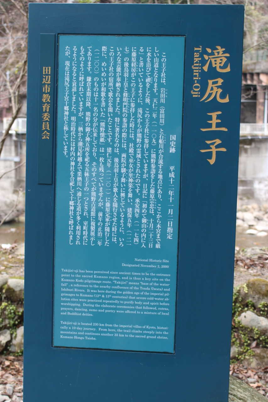 熊野への参詣道は大坂から続いていますが、中辺路は田辺から山道に入ります。その田辺から富田川に沿って進んできた道が本格的な紀... 続きを読む伊山地の山道に入る地点が滝尻王子です。昔はここから熊野三山の神域がはじまると考えられていたようです。