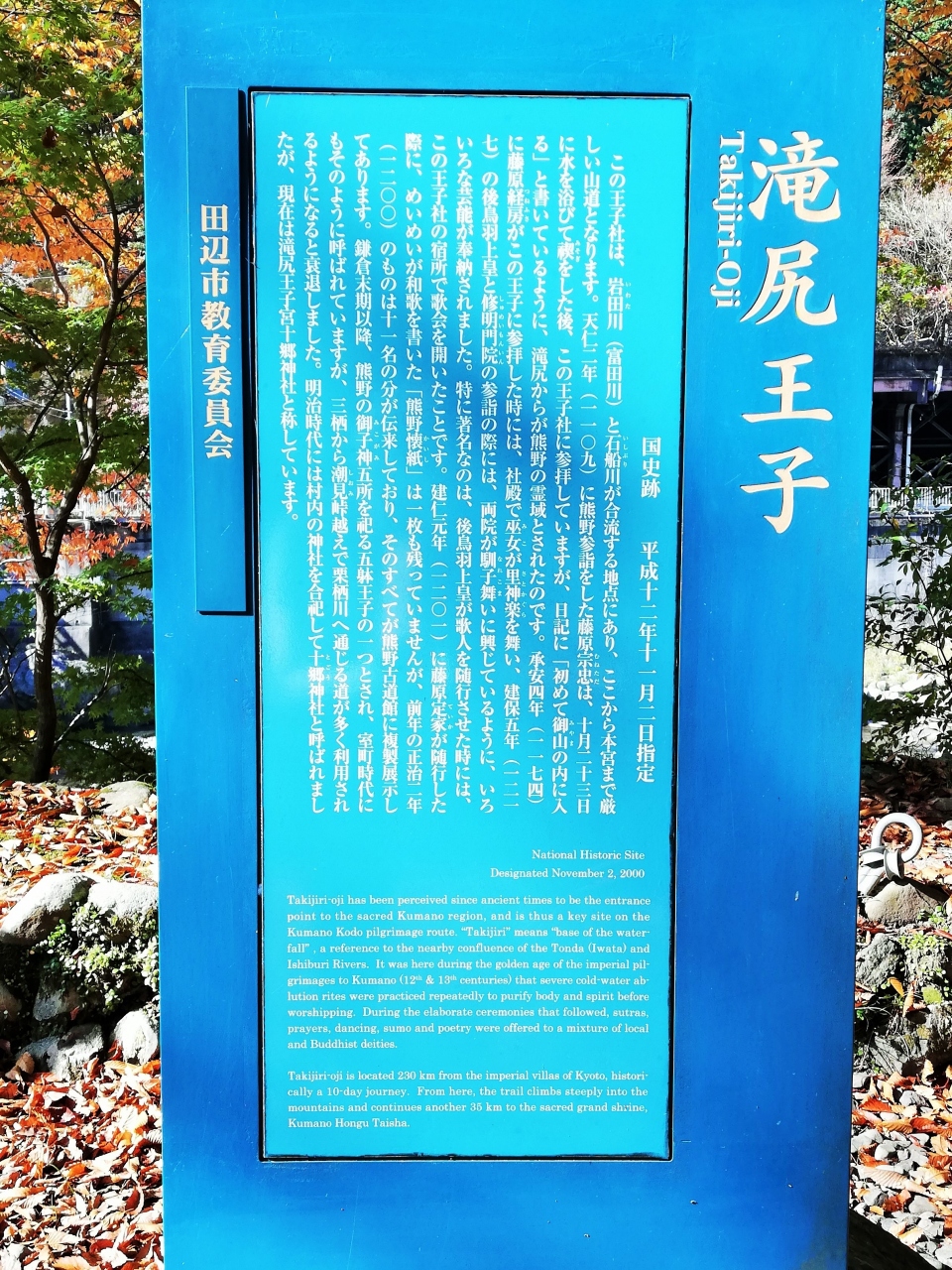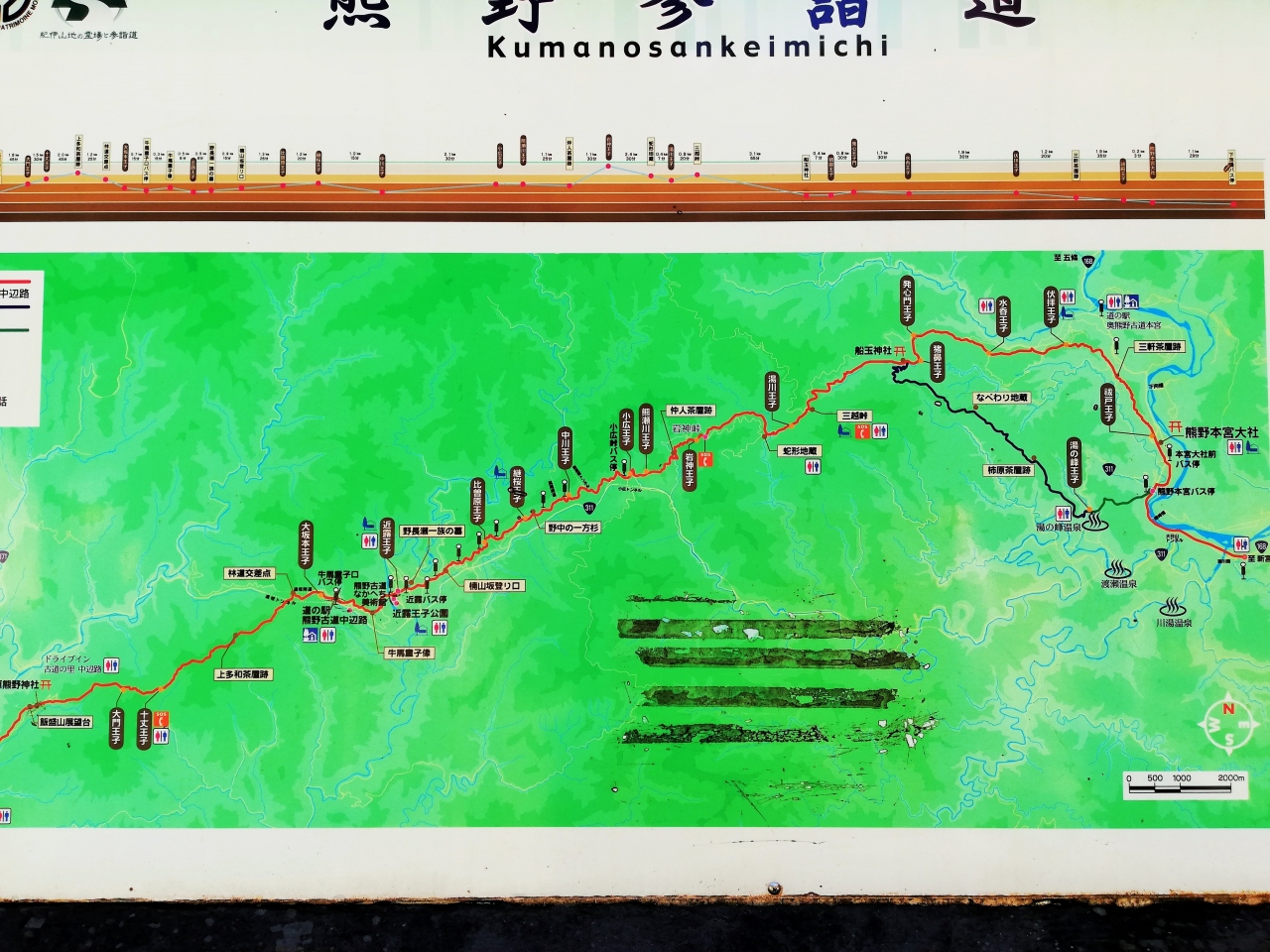 滝尻王子から熊野本宮大社までは約38kmで、その間に19の王子が置かれています。王子とは、熊野参詣道に祀られた熊野の神の分社で、熊野詣での上皇や女院の休憩所になった所なのだそうです。