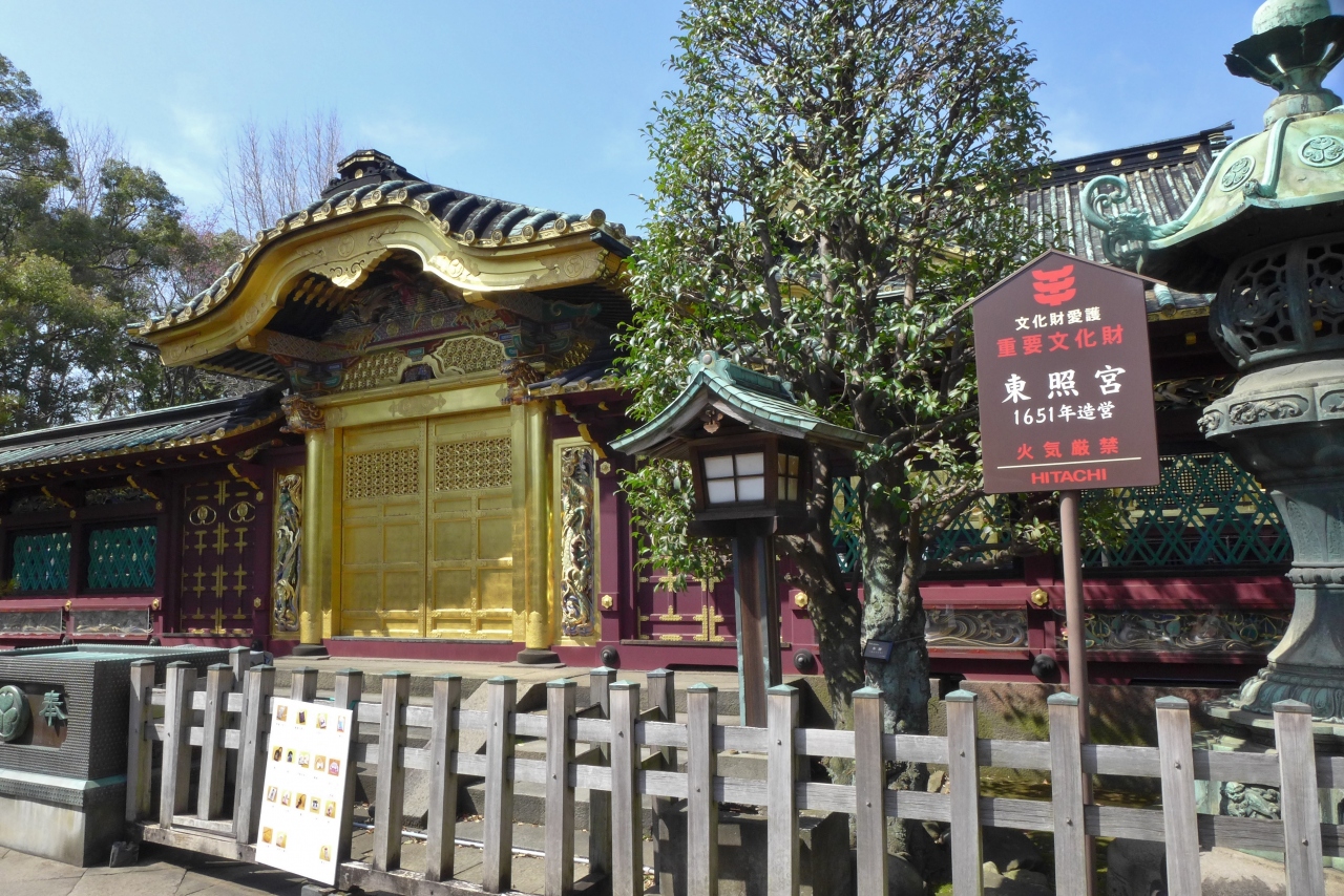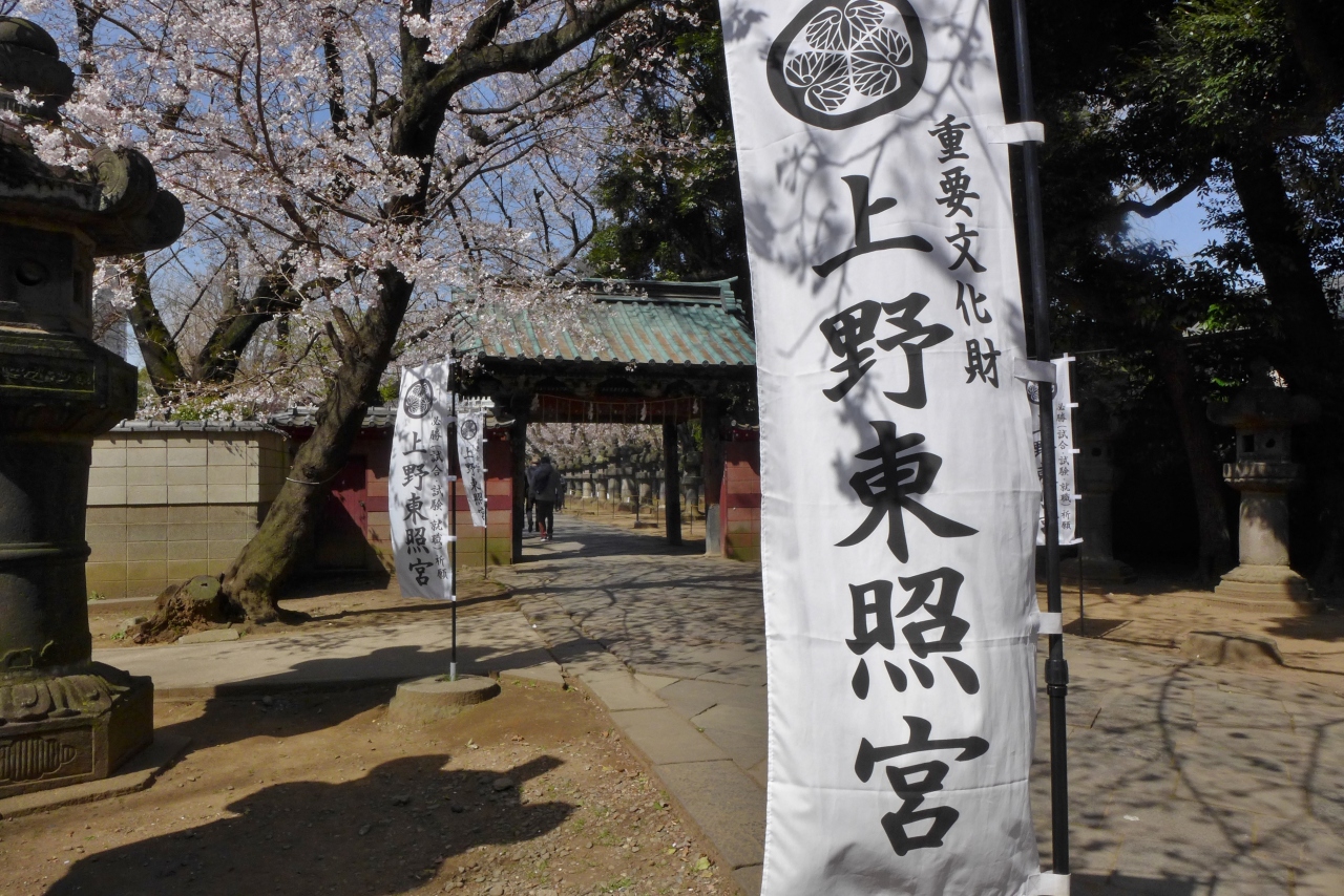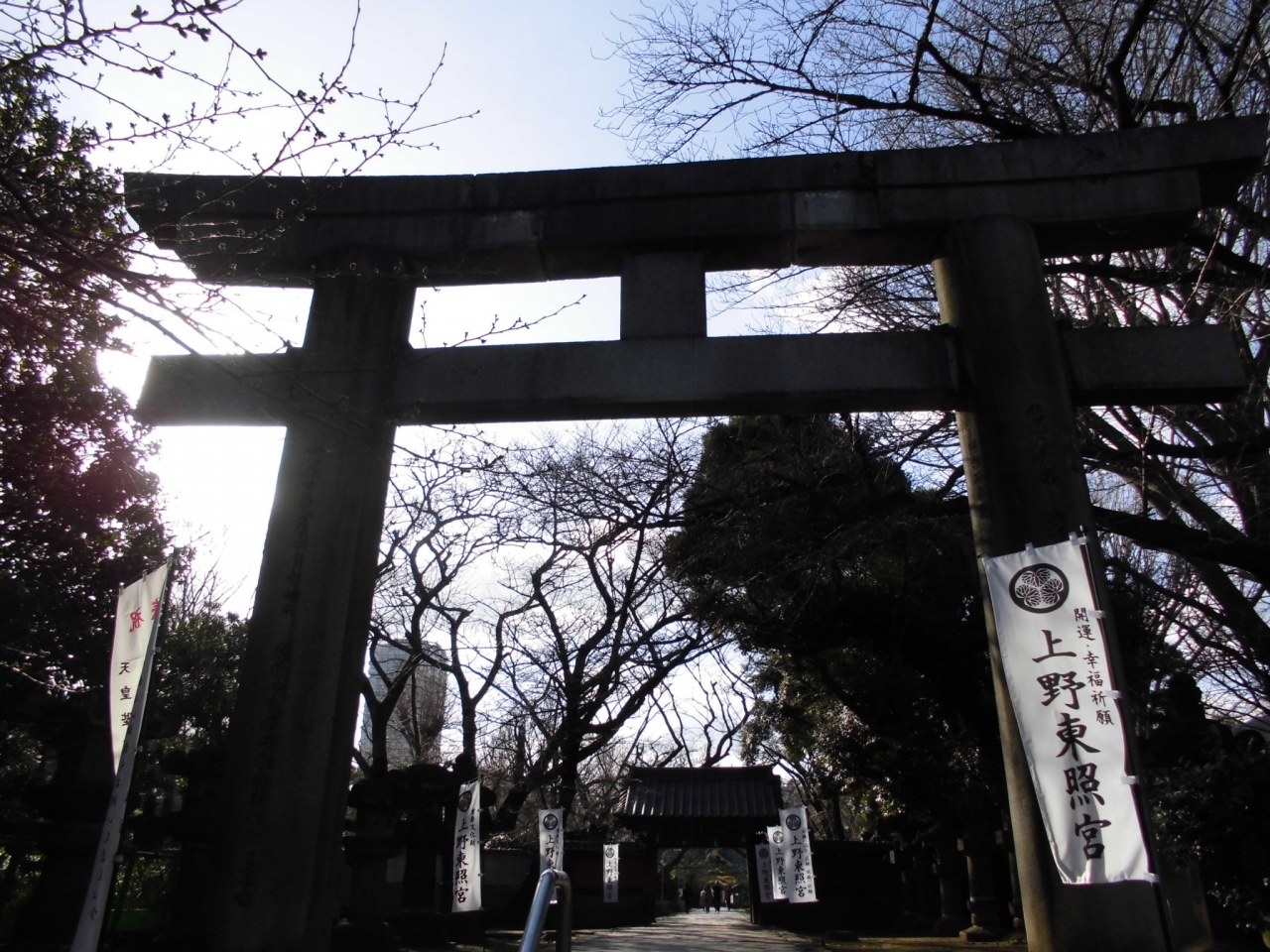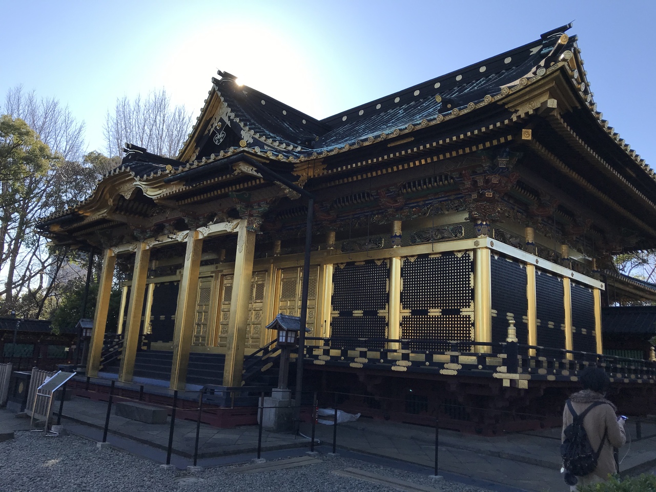 寛永4年(1627)創建の東京都台東区上野公園に鎮座する神社。徳川家康公<東照大権現>を神様としてお祀りする神社で東京では数少ない本格的な江戸建築を残している。金色殿(社殿)、唐門(左甚五郎作(昇り竜降り竜)透塀、諸大名から奉納された銅灯篭(徳川御三家献納の青銅灯篭もある)大石鳥居など重要文化財となっている。平成25年12月、社殿の修復工事が完了。また、ぼたん苑があり、冬ぼたん(1月1日~2月末頃)春の上野ぼたん祭(4月中旬~5月上旬)を行っている。