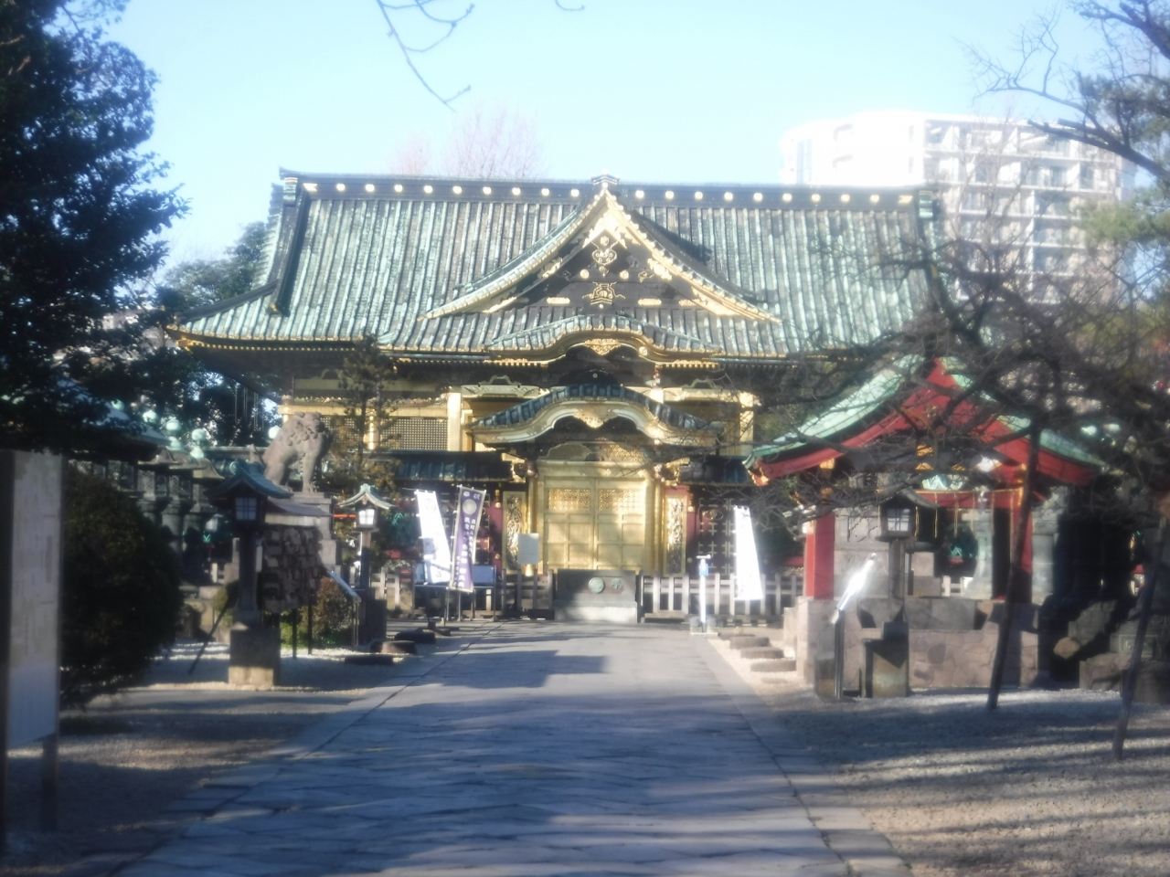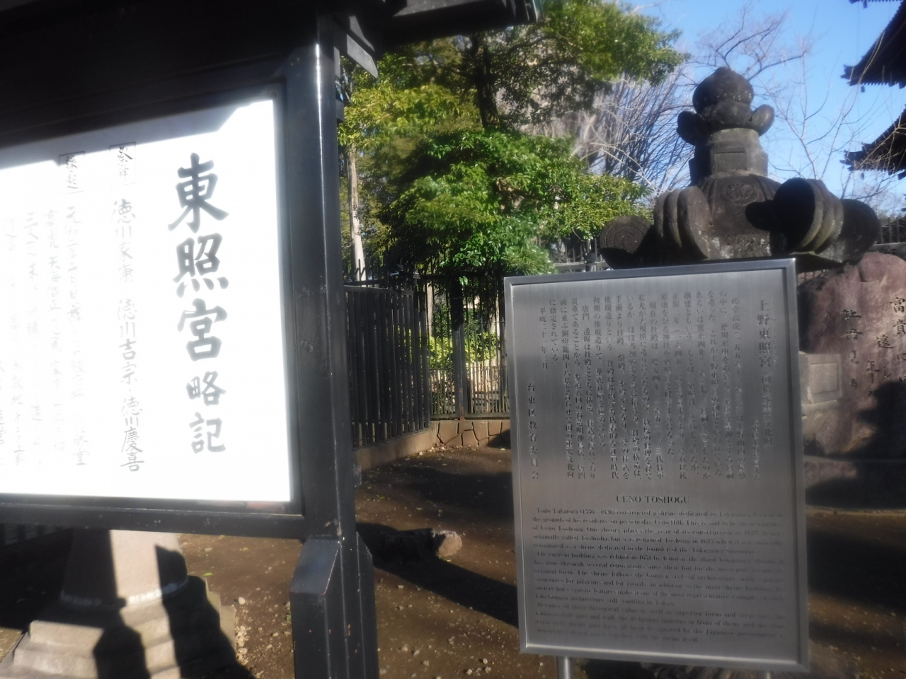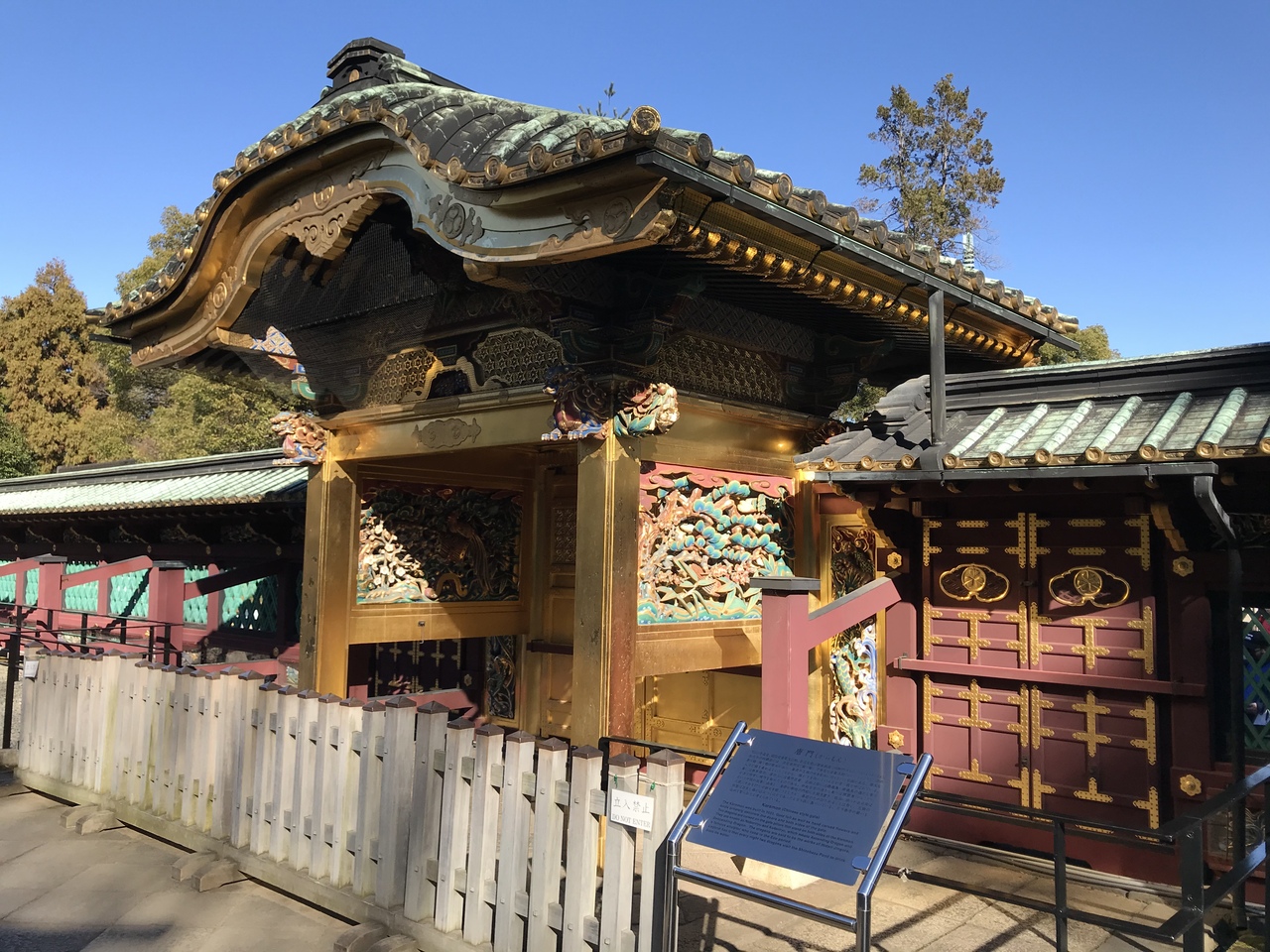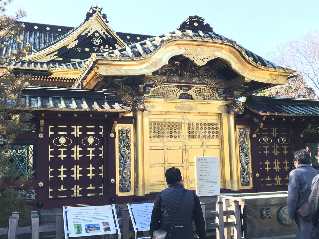 寛永4年(1627)創建の東京都台東区上野公園に鎮座する神社。徳川家康公<東照大権現>を神様としてお祀りする神社で東京では数少ない本格的な江戸建築を残している。金色殿(社殿)、唐門(左甚五郎作(昇り竜降り竜)透塀、諸大名から奉納された銅灯篭(徳川御三家献納の青銅灯篭もある)大石鳥居など重要文化財となっている。平成25年12月、社殿の修復工事が完了。また、ぼたん苑があり、冬ぼたん(1月1日~2月末頃)春の上野ぼたん祭(4月中旬~5月上旬)を行っている。