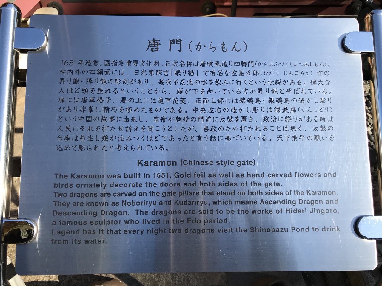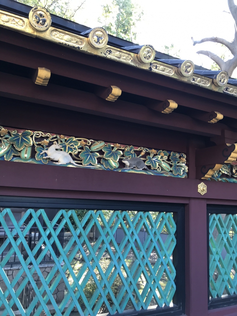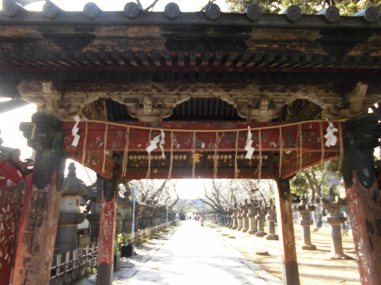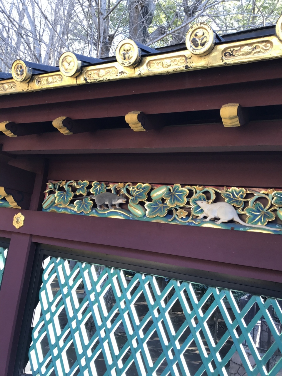寛永4年(1627)創建の東京都台東区上野公園に鎮座する神社。徳川家康公<東照大権現>を神様としてお祀りする神社で東京では数少ない本格的な江戸建築を残している。金色殿(社殿)、唐門(左甚五郎作(昇り竜降り竜)透塀、諸大名から奉納された銅灯篭(徳川御三家献納の青銅灯篭もある)大石鳥居など重要文化財となっている。平成25年12月、社殿の修復工事が完了。また、ぼたん苑があり、冬ぼたん(1月1日~2月末頃)春の上野ぼたん祭(4月中旬~5月上旬)を行っている。
