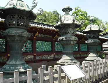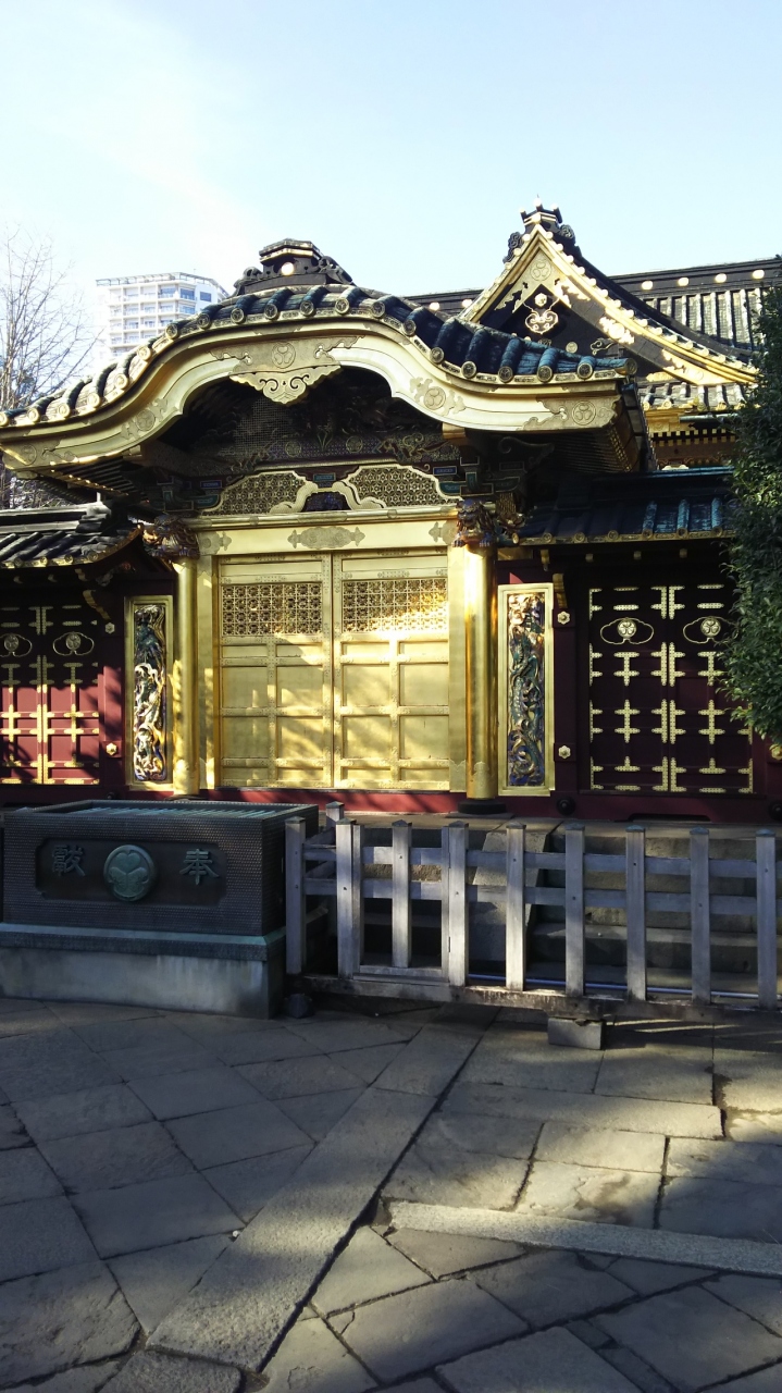 寛永4年(1627)創建の東京都台東区上野公園に鎮座する神社。徳川家康公<東照大権現>を神様としてお祀りする神社で東京では数少ない本格的な江戸建築を残している。金色殿(社殿)、唐門(左甚五郎作(昇り竜降り竜)透塀、諸大名から奉納された銅灯篭(徳川御三家献納の青銅灯篭もある)大石鳥居など重要文化財となっている。平成25年12月、社殿の修復工事が完了。また、ぼたん苑があり、冬ぼたん(1月1日~2月末頃)春の上野ぼたん祭(4月中旬~5月上旬)を行っている。
