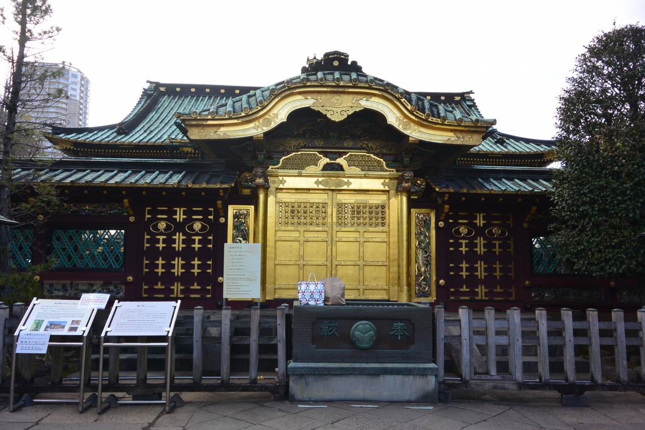 寛永4年(1627)創建の東京都台東区上野公園に鎮座する神社。徳川家康公<東照大権現>を神様としてお祀りする神社で東京では数少ない本格的な江戸建築を残している。金色殿(社殿)、唐門(左甚五郎作(昇り竜降り竜)透塀、諸大名から奉納された銅灯篭(徳川御三家献納の青銅灯篭もある)大石鳥居など重要文化財となっている。平成25年12月、社殿の修復工事が完了。また、ぼたん苑があり、冬ぼたん(1月1日~2月末頃)春の上野ぼたん祭(4月中旬~5月上旬)を行っている。