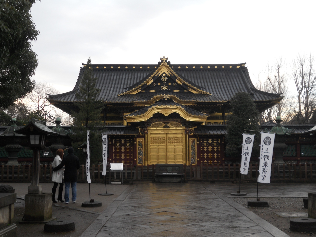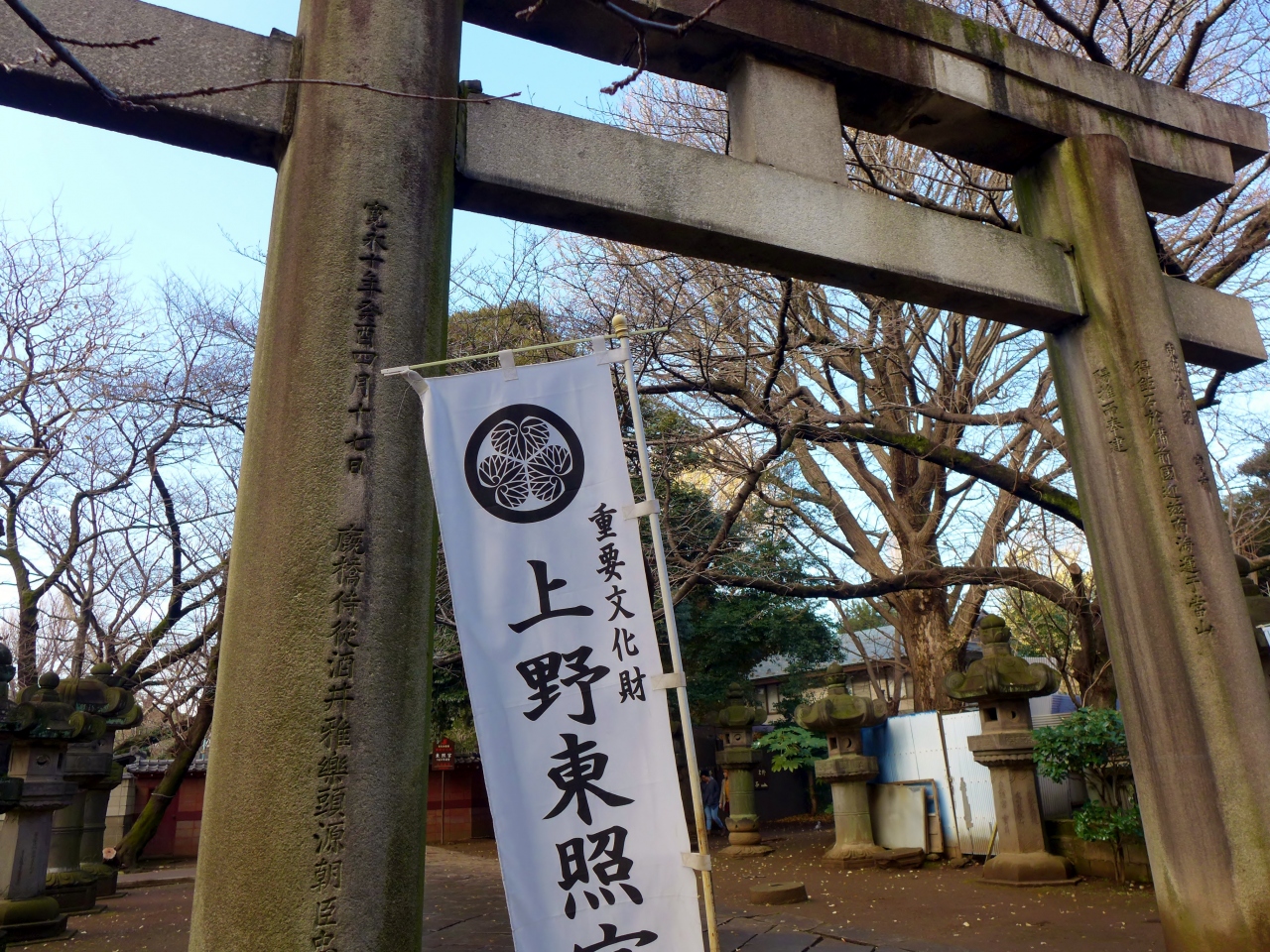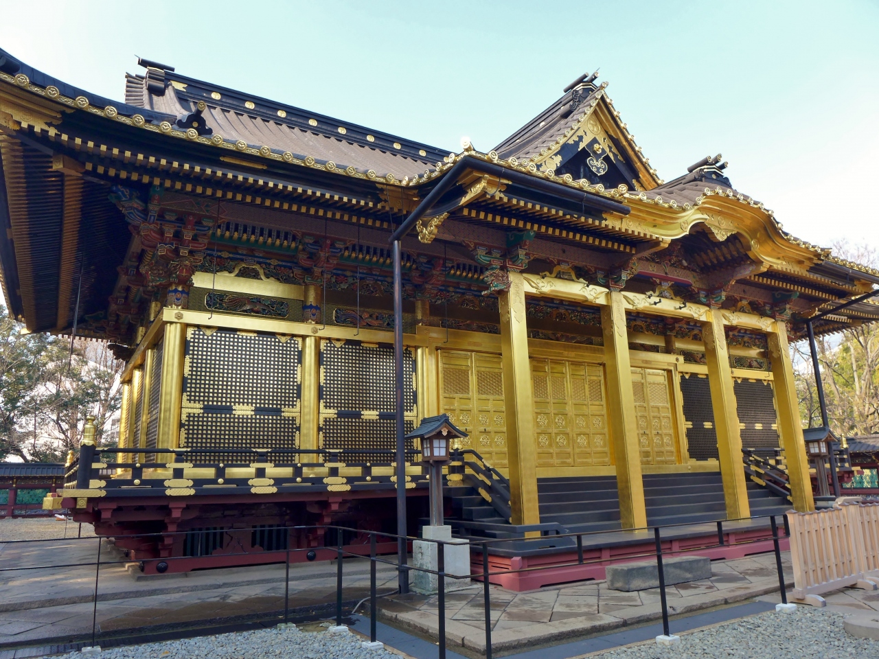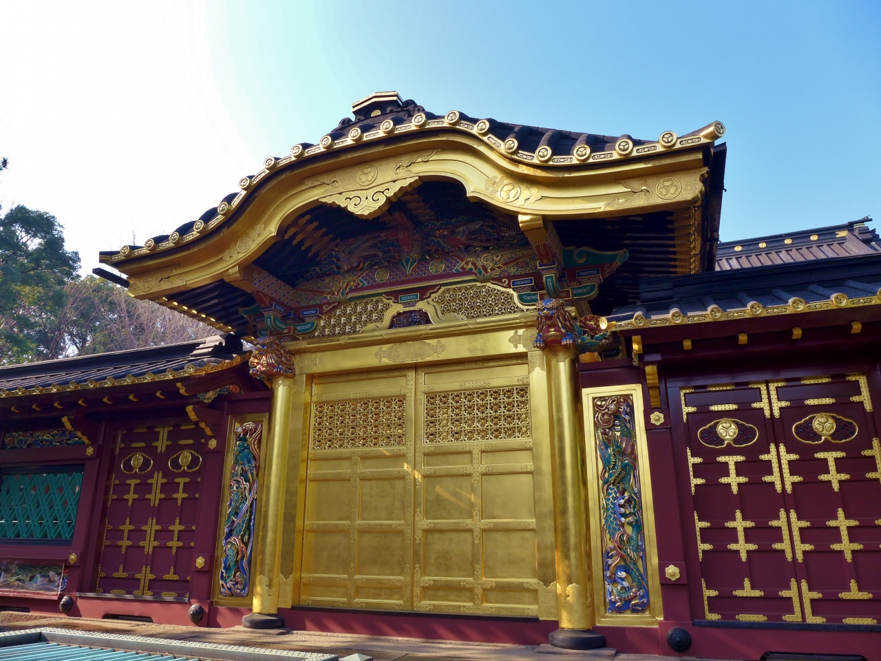 寛永4年(1627)創建の東京都台東区上野公園に鎮座する神社。徳川家康公<東照大権現>を神様としてお祀りする神社で東京では数少ない本格的な江戸建築を残している。金色殿(社殿)、唐門(左甚五郎作(昇り竜降り竜)透塀、諸大名から奉納された銅灯篭(徳川御三家献納の青銅灯篭もある)大石鳥居など重要文化財となっている。平成25年12月、社殿の修復工事が完了。また、ぼたん苑があり、冬ぼたん(1月1日~2月末頃)春の上野ぼたん祭(4月中旬~5月上旬)を行っている。