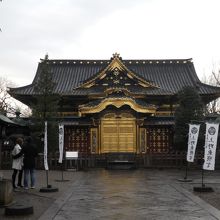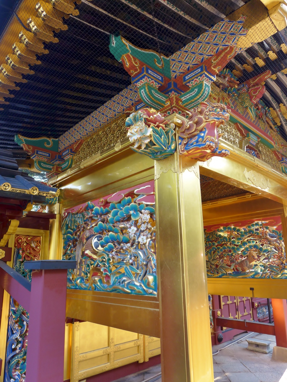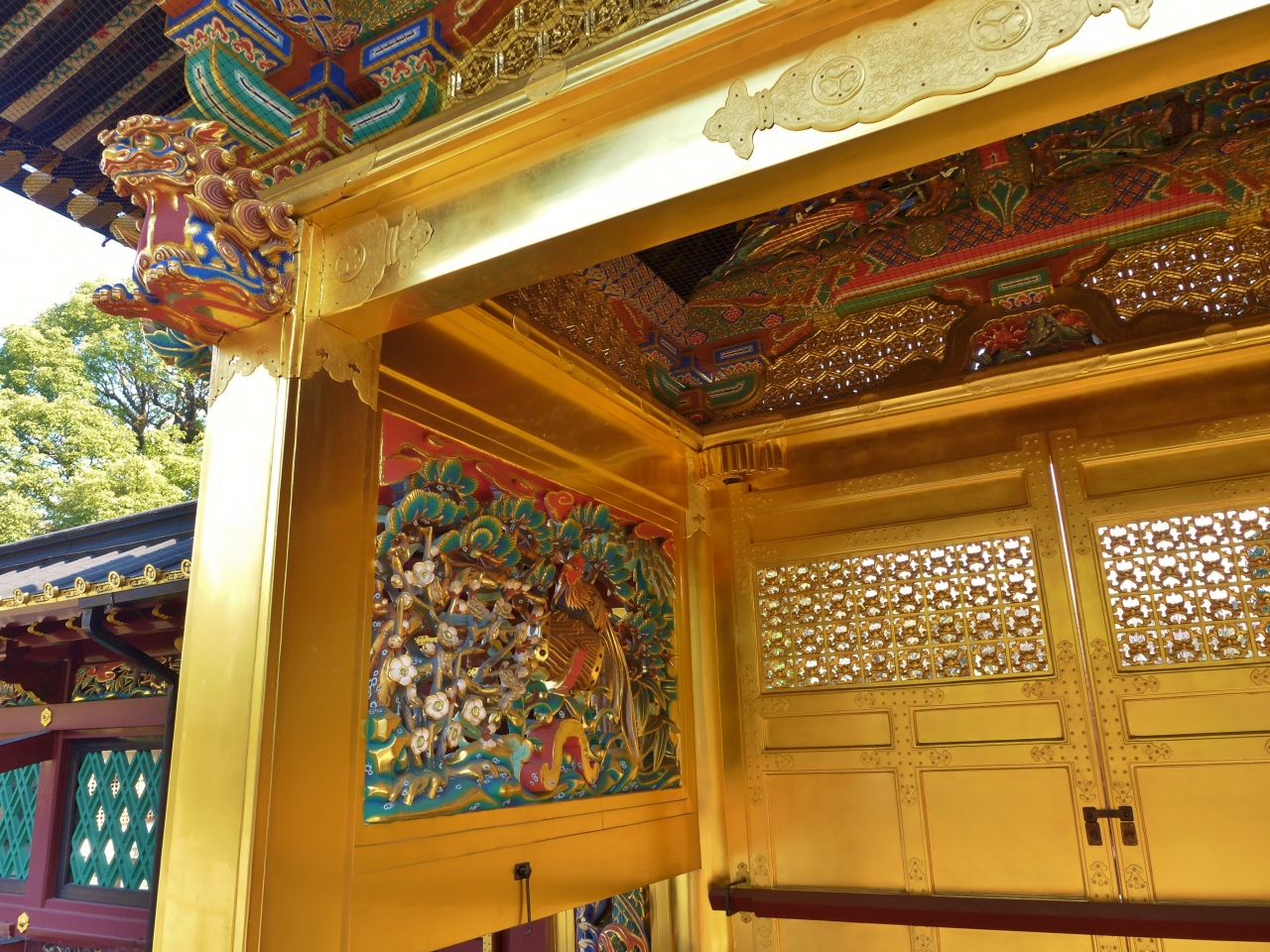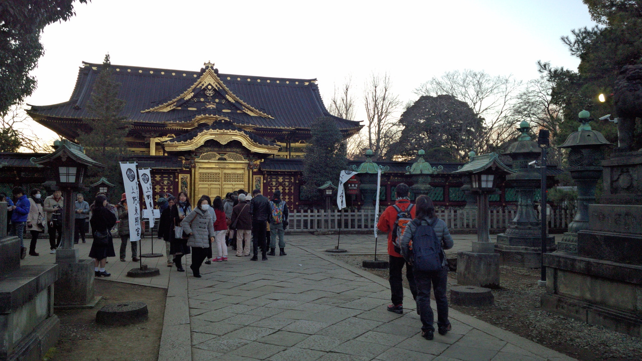 寛永4年(1627)創建の東京都台東区上野公園に鎮座する神社。徳川家康公<東照大権現>を神様としてお祀りする神社で東京では数少ない本格的な江戸建築を残している。金色殿(社殿)、唐門(左甚五郎作(昇り竜降り竜)透塀、諸大名から奉納された銅灯篭(徳川御三家献納の青銅灯篭もある)大石鳥居など重要文化財となっている。平成25年12月、社殿の修復工事が完了。また、ぼたん苑があり、冬ぼたん(1月1日~2月末頃)春の上野ぼたん祭(4月中旬~5月上旬)を行っている。