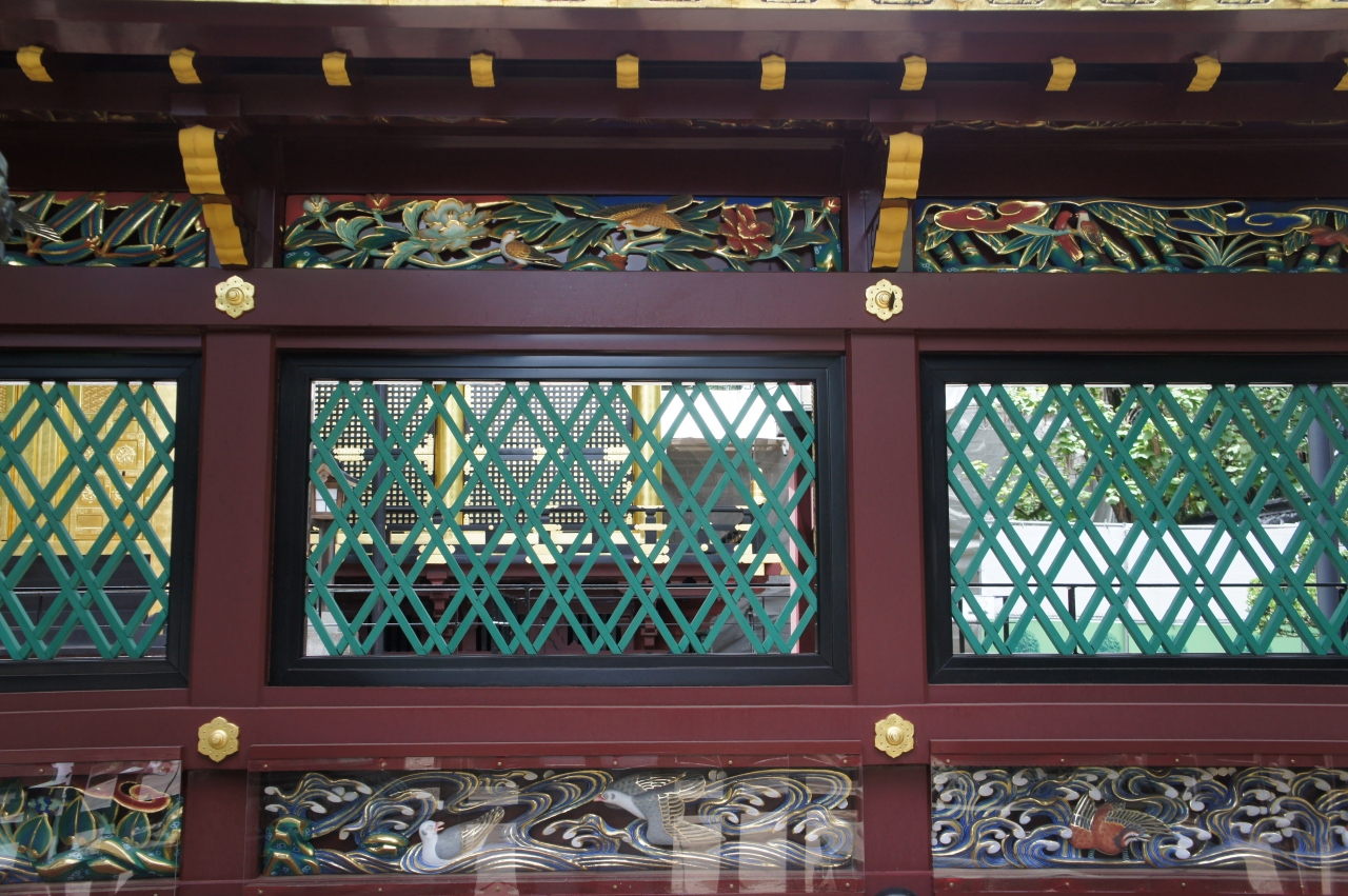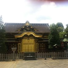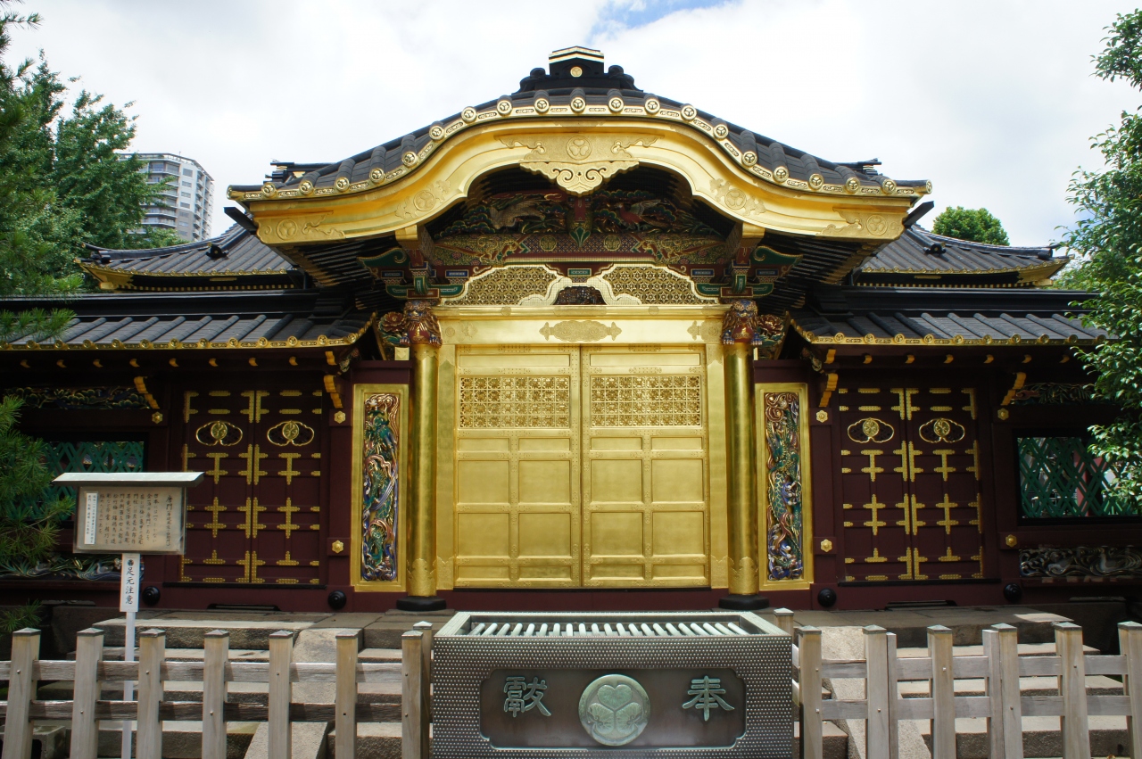 寛永4年(1627)創建の東京都台東区上野公園に鎮座する神社。徳川家康公<東照大権現>を神様としてお祀りする神社で東京では数少ない本格的な江戸建築を残している。金色殿(社殿)、唐門(左甚五郎作(昇り竜降り竜)透塀、諸大名から奉納された銅灯篭(徳川御三家献納の青銅灯篭もある)大石鳥居など重要文化財となっている。平成25年12月、社殿の修復工事が完了。また、ぼたん苑があり、冬ぼたん(1月1日~2月末頃)春の上野ぼたん祭(4月中旬~5月上旬)を行っている。