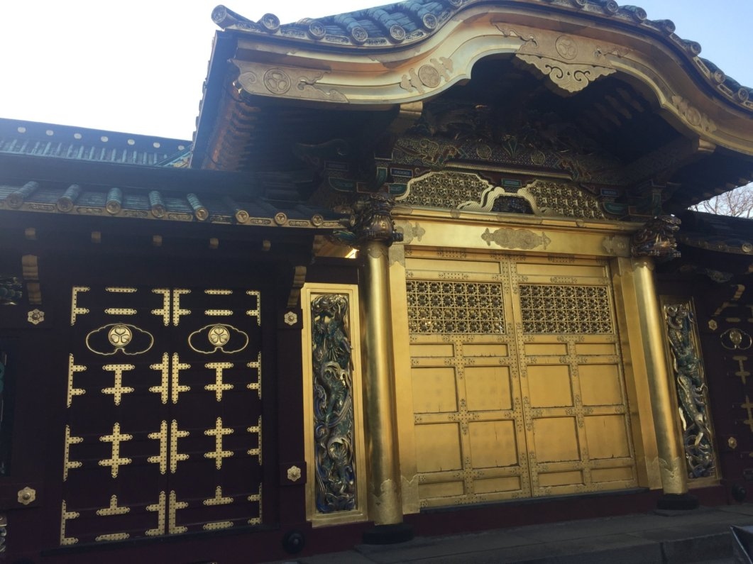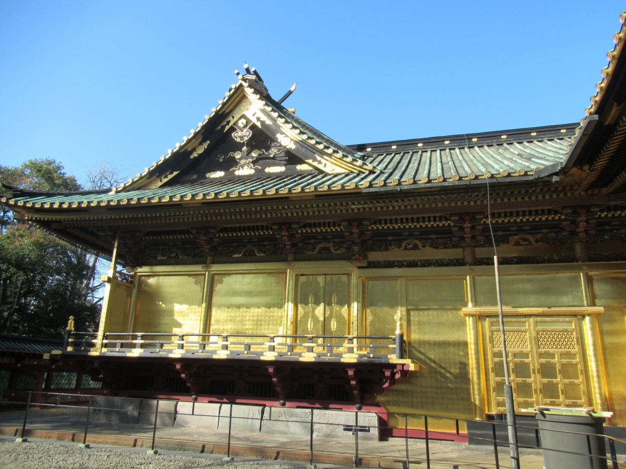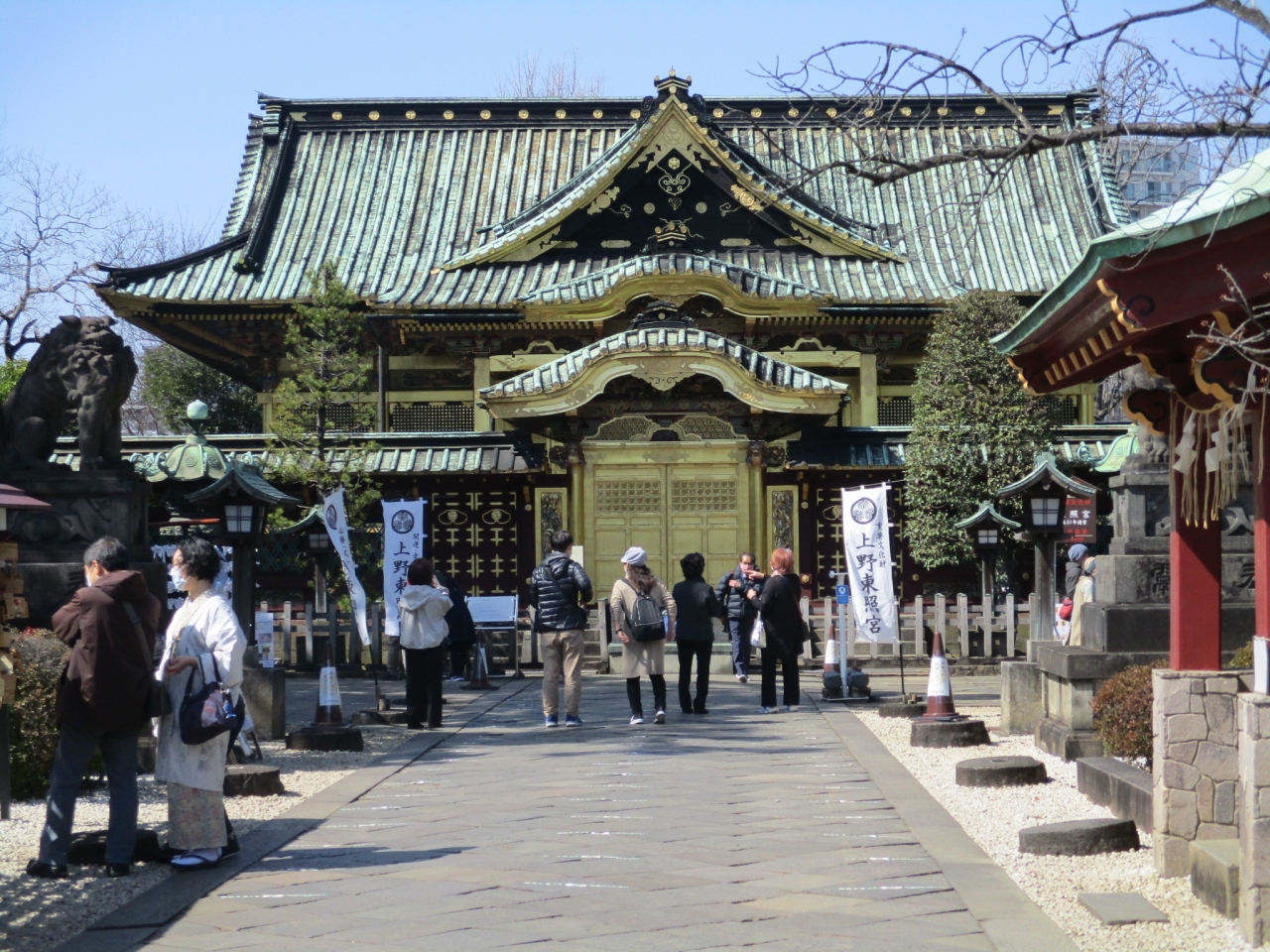 寛永4年(1627)創建の東京都台東区上野公園に鎮座する神社。徳川家康公<東照大権現>を神様としてお祀りする神社で東京では数少ない本格的な江戸建築を残している。金色殿(社殿)、唐門(左甚五郎作(昇り竜降り竜)透塀、諸大名から奉納された銅灯篭(徳川御三家献納の青銅灯篭もある)大石鳥居など重要文化財となっている。平成25年12月、社殿の修復工事が完了。また、ぼたん苑があり、冬ぼたん(1月1日~2月末頃)春の上野ぼたん祭(4月中旬~5月上旬)を行っている。
