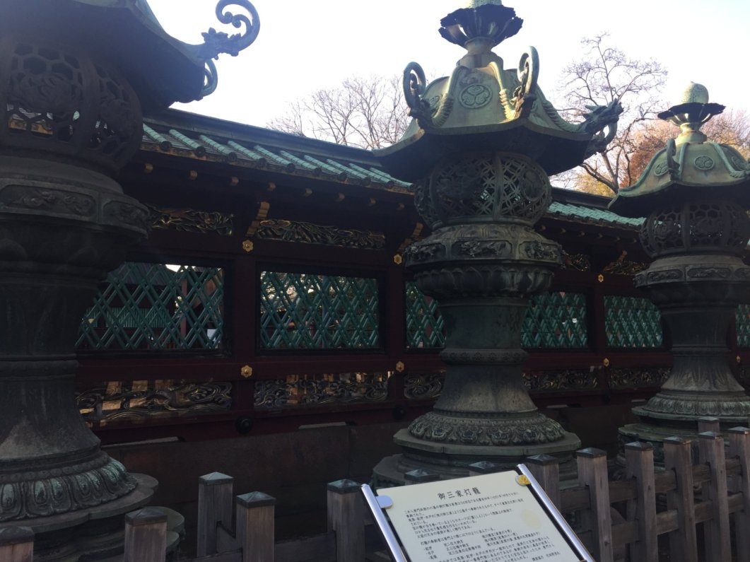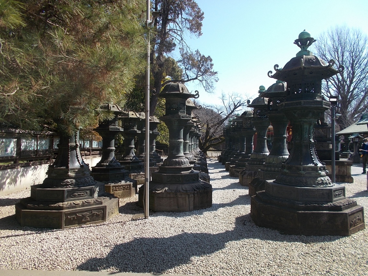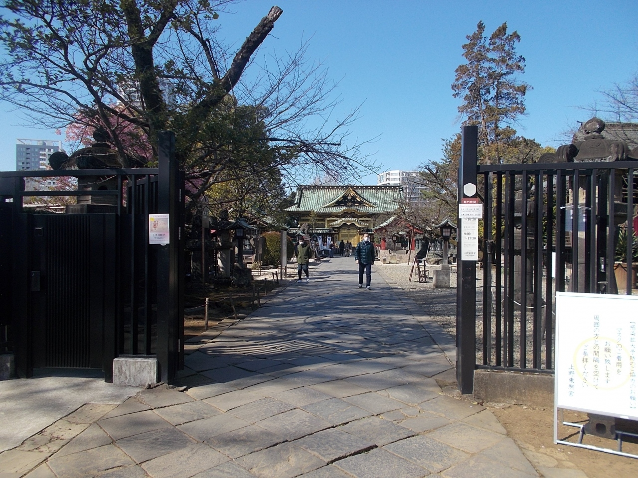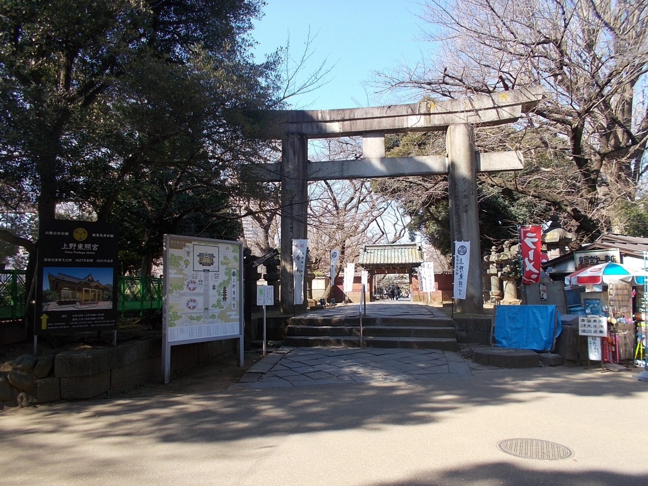 寛永4年(1627)創建の東京都台東区上野公園に鎮座する神社。徳川家康公<東照大権現>を神様としてお祀りする神社で東京では数少ない本格的な江戸建築を残している。金色殿(社殿)、唐門(左甚五郎作(昇り竜降り竜)透塀、諸大名から奉納された銅灯篭(徳川御三家献納の青銅灯篭もある)大石鳥居など重要文化財となっている。平成25年12月、社殿の修復工事が完了。また、ぼたん苑があり、冬ぼたん(1月1日~2月末頃)春の上野ぼたん祭(4月中旬~5月上旬)を行っている。