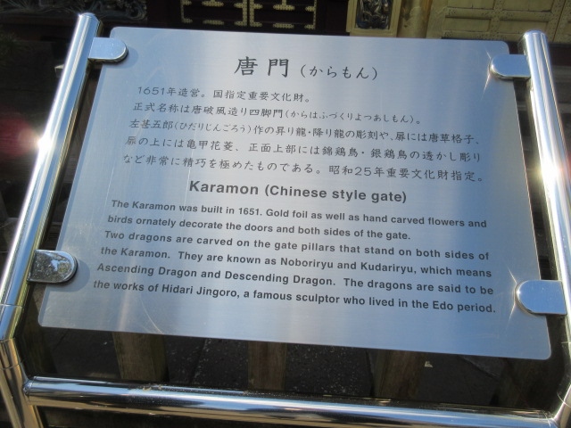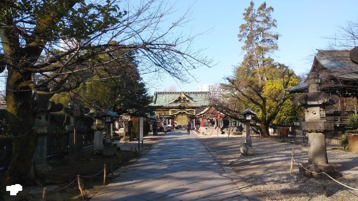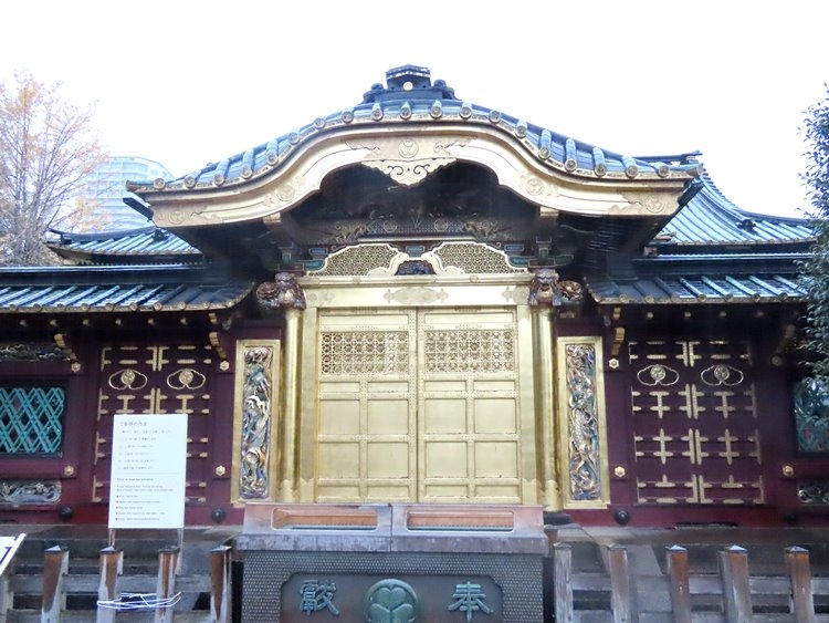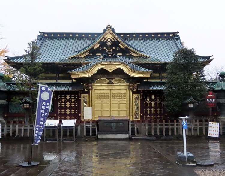 寛永4年(1627)創建の東京都台東区上野公園に鎮座する神社。徳川家康公<東照大権現>を神様としてお祀りする神社で東京では数少ない本格的な江戸建築を残している。金色殿(社殿)、唐門(左甚五郎作(昇り竜降り竜)透塀、諸大名から奉納された銅灯篭(徳川御三家献納の青銅灯篭もある)大石鳥居など重要文化財となっている。平成25年12月、社殿の修復工事が完了。また、ぼたん苑があり、冬ぼたん(1月1日~2月末頃)春の上野ぼたん祭(4月中旬~5月上旬)を行っている。