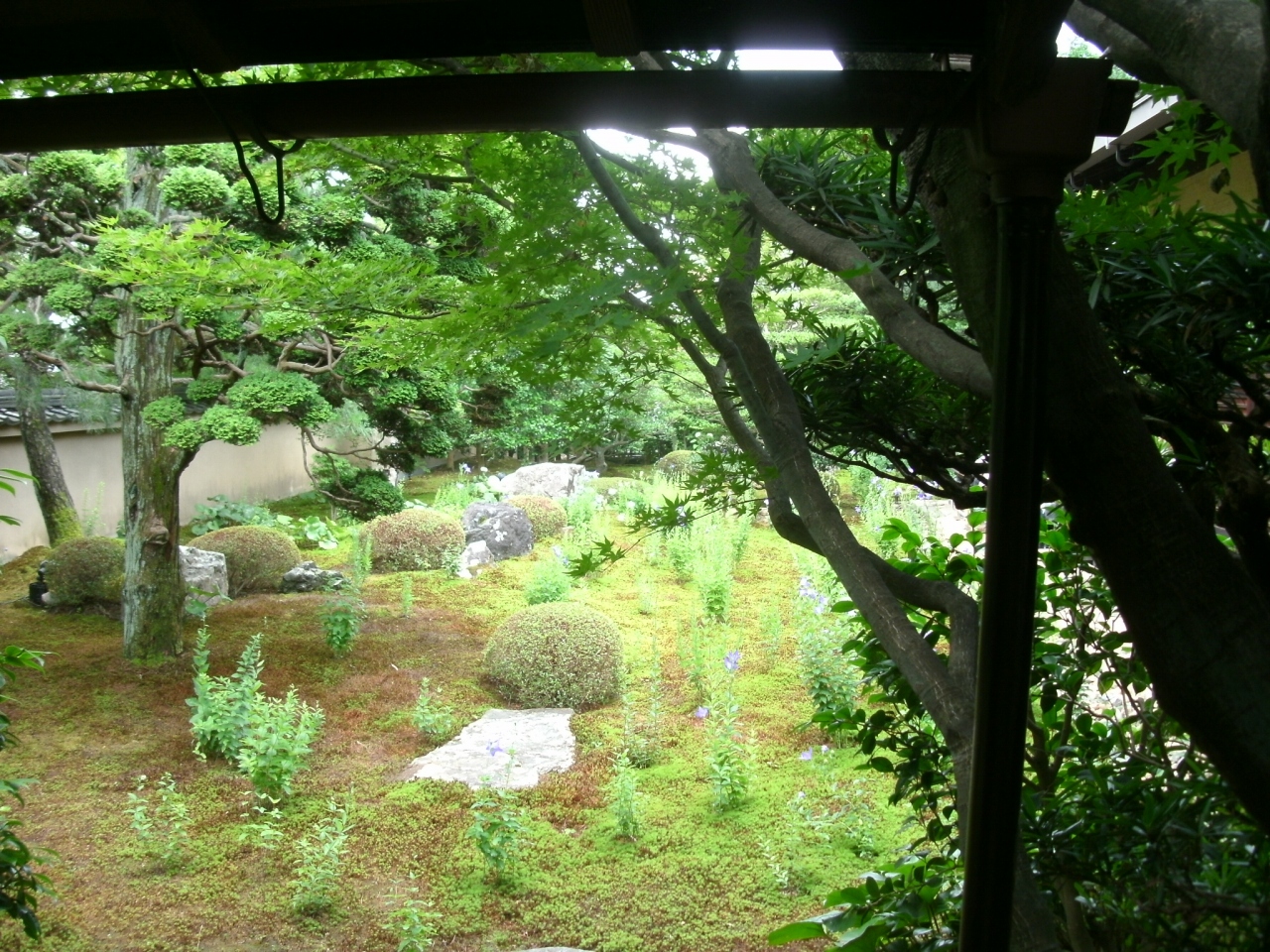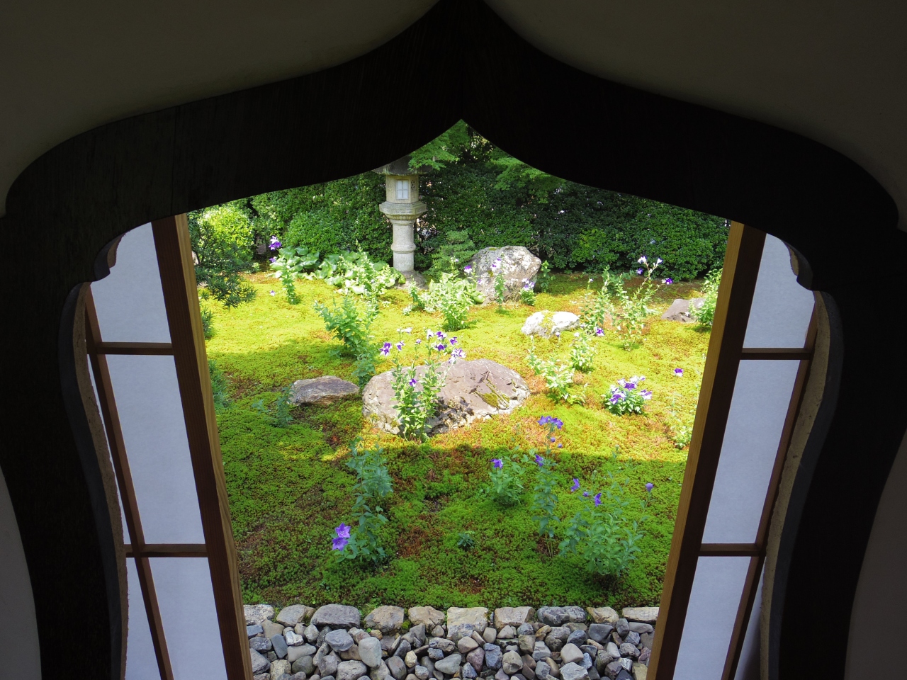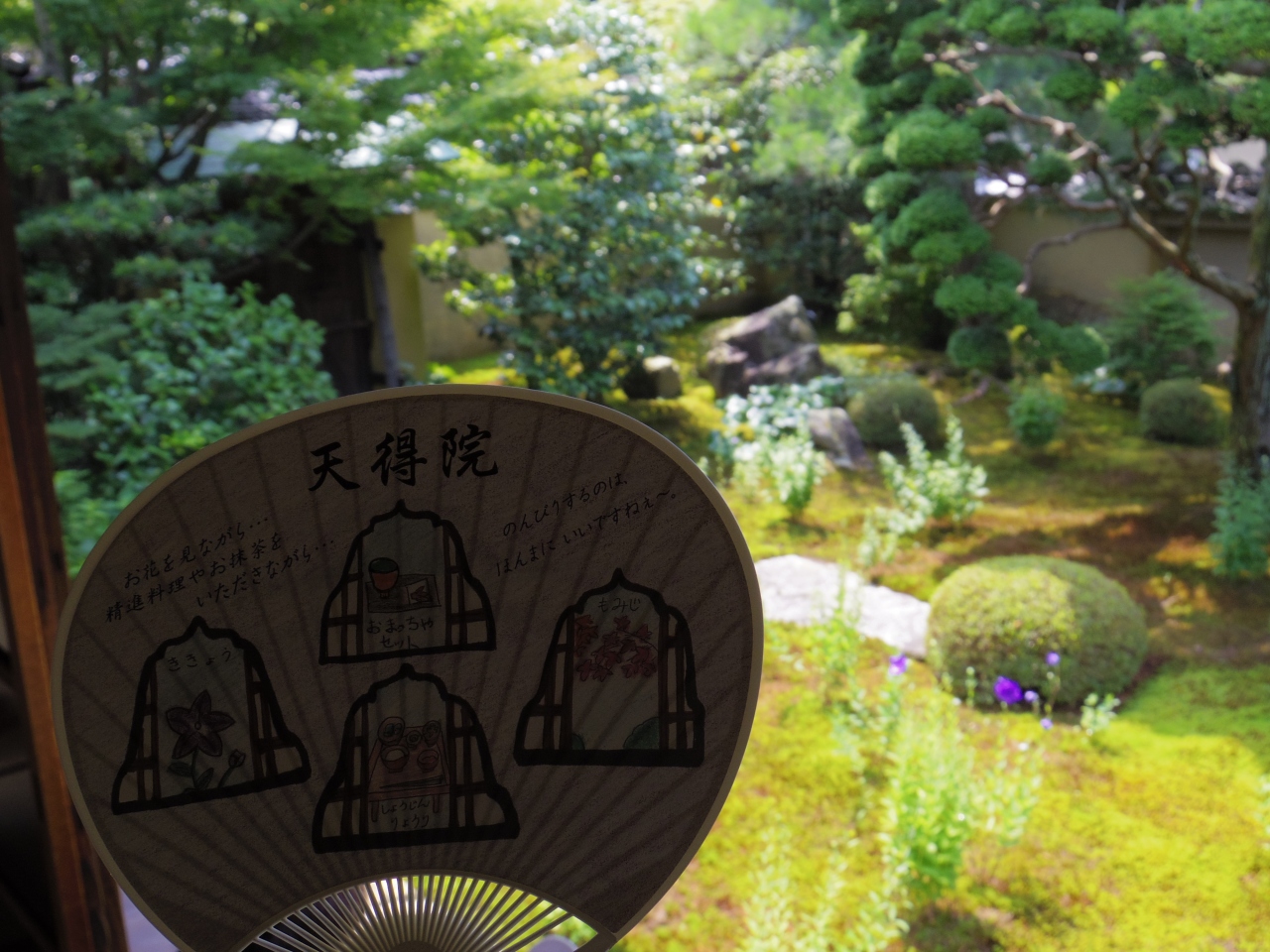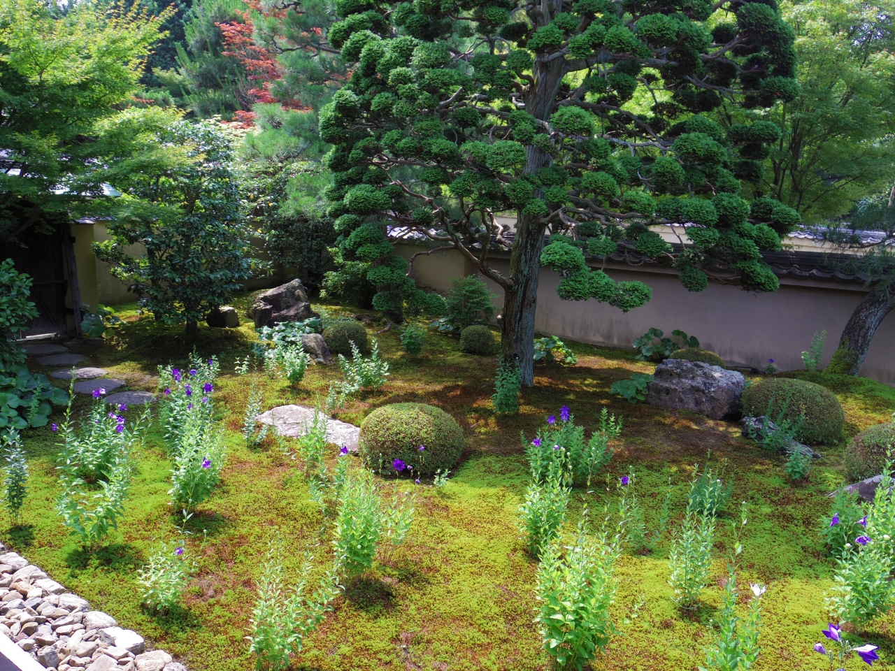 天得院自体はこぢんまりとしたお寺で、杉苔の間から桔梗が咲いている枯山水のお庭を眺めることができます。