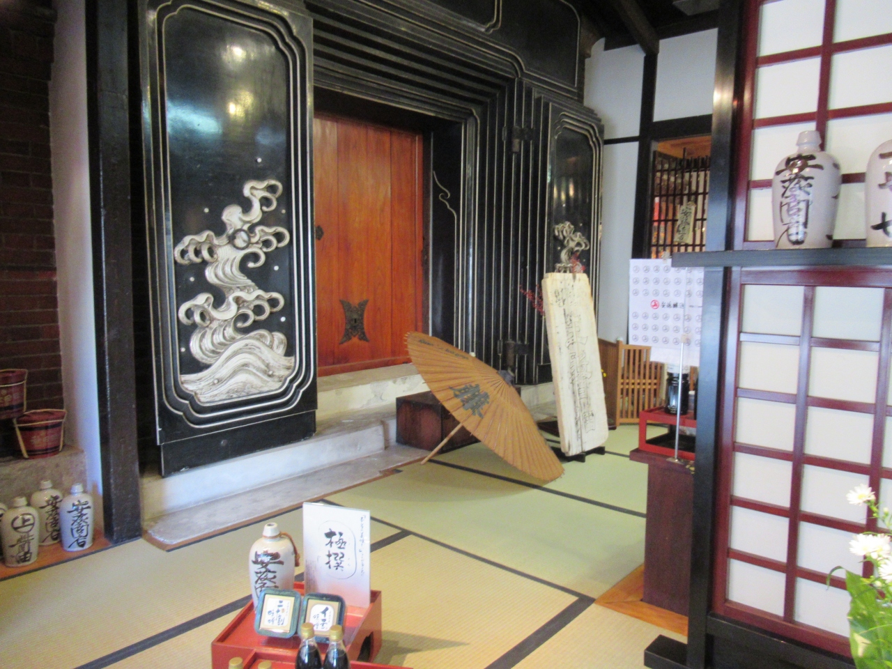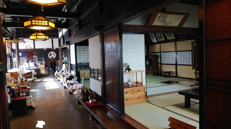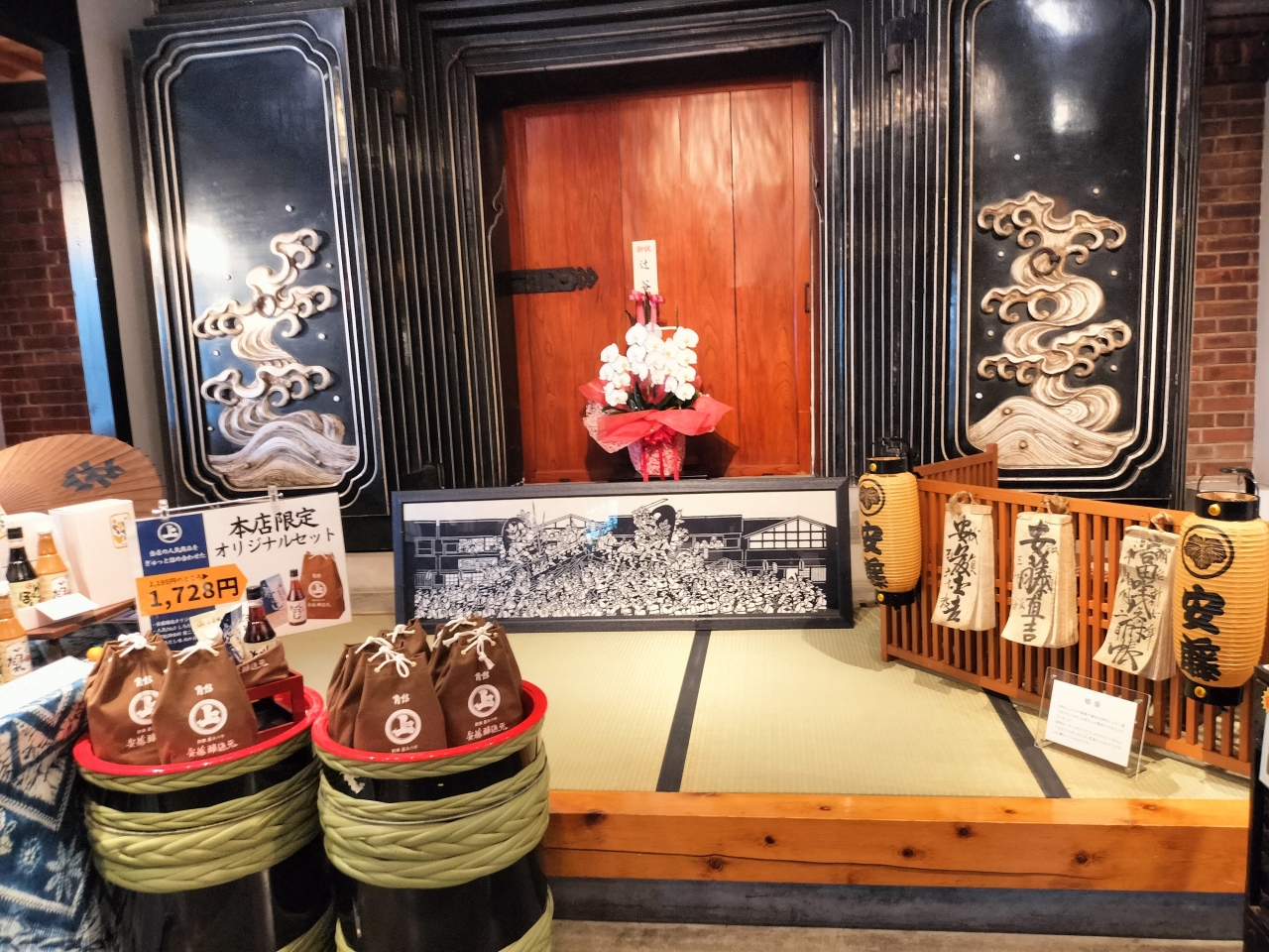 店の前の通りは、ほとんど人がいませんでしたが、中に入ると沢山の観光客が買い物をしていました。それもそのはず、味噌、醤油、漬物などもありますがレンガ造りの蔵座敷が有名なお店です。