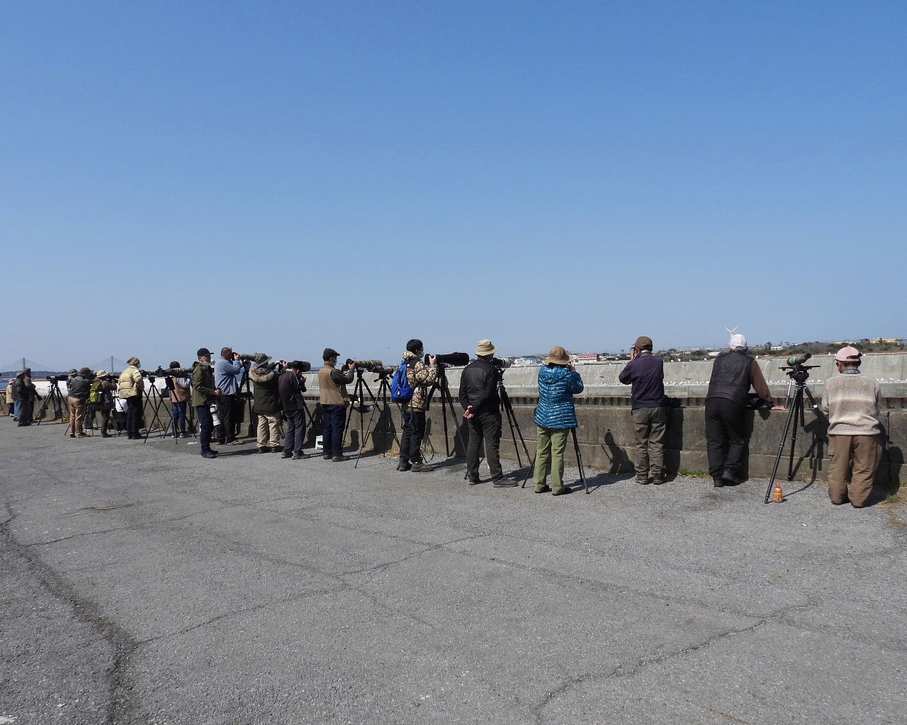 やったー\(^o^)/、ついに見たぞと大喜びでカメラを構えたところ、ユリカモメの大群が邪魔で、なかなかファインダーに捉えられません。周りのカメラマンの状況を見ると、すでに遠くに飛び去ったようで撮影できませんでした。